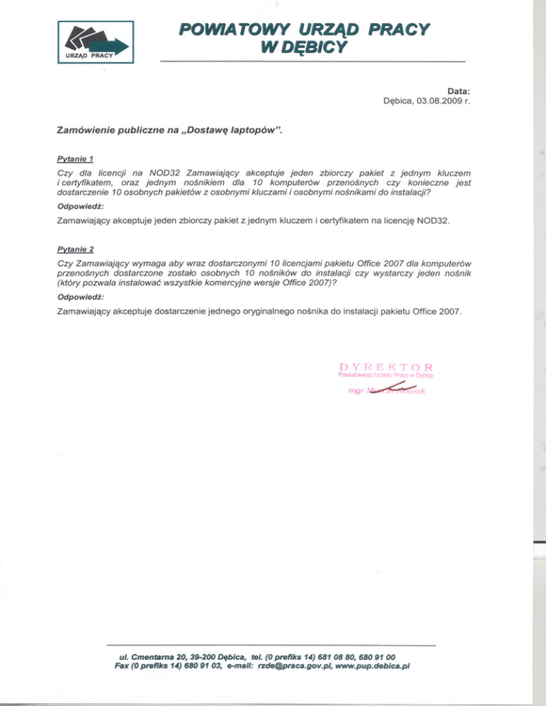 POWIATOWY URZAD PRACY W D~8ICY Data: Debica, 03.08.2009 r. Zamówienie publiczne na "Dostawe laptopów". PYtanie1 Czy dla licencji na NOD32 Zamawiajacy akceptuje jeden zbiorczy pakiet z jednym kluczem i certyfikatem. oraz jednym nosnikiem dla 10 komputerów przenosnych czy konieczne jest dostarczenie 10 osobnych pakietów z osobnymi kluczami i osobnymi nosnikami do instalacji? Odpowiedz: Zamawiajacy akceptuje jeden zbiorczy pakiet z jednym kluczem i certyfikatem na licencje NOD32. Pvtanie2 Czy Zamawiajacy wymaga aby wraz dostarczonymi 10 licencjami pakietu Office 2007 dla komputerów przenosnych dostarczone zostalo osobnych 10 nosników do instalacji czy wystarczy jeden nosnik (który pozwala instalowac wszystkie komercyjne wersje Office 2007)? Odpowiedz: Zamawiajacy akceptuje dostarczenie jednego oryginalnego nosnika do instalacji pakietu Office 2007. DYREF<TOR POWlatoweoo UrzeduPracyw Debicy mg,.~ak - ul. Cmentarna 20, 39-200 Debica, tel. (Oprefiks 14) 681 08 80, 68091 00 Fax (Oprefiks 14) 68091 03, e-mail: [email protected], www.pup.deblca.pl