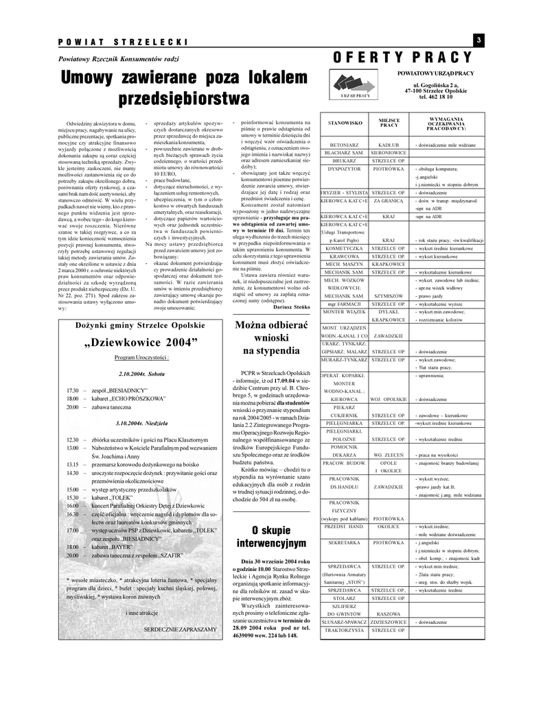 P O W I A T 3 S T R Z E L E C K I Powiatowy Rzecznik Konsumentów radzi Umowy zawierane poza lokalem przedsiêbiorstwa Odwiedziny akwizytora w domu, - wyjazdy po³¹czone z mo¿liwoci¹ - potrzeby zakupu okrelonego dobra, porównania oferty rynkowej, a czasami brak nam doæ asertywnoci, aby stanowczo odmówiæ. W wielu przy- miotu umowy do równowartoci 10 EURO, - prace budowlane, - dotycz¹ce nieruchomoci, z wy- - ubezpieczenia, w tym o cz³on- ³¹czeniem us³ug remontowych, kostwo w otwartych funduszach padkach nawet nie wiemy, kto z prawnego punktu widzenia jest sprzedawc¹, a wobec tego - do kogo kiero- emerytalnych, oraz reasekuracji, - t wa w f unduszach powi erni - szanse w takiej rozgrywce, a co za pozycji prawnej konsumenta, stwo- czych i inwestycyjnych. Na mo c y u s t a wy p r z e d s i ê b i o r c a przed zawarciem umowy jest zo- rzy³y potrzebê ustawowej regulacji takiej metody zawierania umów. Zosta³y one okrelone w ustawie z dnia dotycz¹ce papierów wartociowych oraz jednostek uczestnic- waæ swoje roszczenia. Nierówne tym idzie koniecznoæ wzmocnienia odst¹pieniu, z oznaczeniem swo- powszechnie zawierane w drob- jego imienia i nazwiska( nazwy) oraz adresem zamieszkania( sie- codziennego, o wartoci przed- kle jestemy zaskoczeni, nie mamy bowi¹zany: - okazaæ dokument potwierdzaj¹cy prowadzenie dzia³alnoci go- 2 marca 2000 r. o ochronie niektórych spodarczej oraz dokument to¿- praw konsumentów oraz odpowie- samoci. W razie zawierania dzialnoci za szkodê wyrz¹dzon¹ umów w imieniu przedsiêbiorcy przez produkt niebezpieczny (Dz. U. zawieraj¹cy umowê okazuje po- Nr 22, poz. 271). Spod zakresu za- nadto dokument potwierdzaj¹cy stosowania ustawy wy³¹czono umo- dziby); - obowi¹zany jest tak¿e wrêczyæ Do¿ynki gminy Strzelce Opolskie Dziewkowice 2004 Program Uroczystoci : 2.10.2004r. Sobota 17.30 zespó³ BIESIADNICY 18.00 kabaret ECHO PRÓSZKOWA 20.00 zabawa taneczna tel. 462 18 10 BETONIARZ KAD£UB SIERONIOWICE BRUKARZ STRZELCE OP. DYSPOZYTOR PIOTRÓWKA dzaj¹ce jej datê i rodzaj oraz FRYZJER - STYLISTA STRZELCE OP. KIEROWCA KAT.C+E ZA GRANIC¥ uprawnienie - przys³uguje mu pra- KIEROWCA KAT.C+E KRAJ wo odst¹pienia od zawartej umo- KIEROWCA KAT.C+E przedmiot wiadczenia i cenê. Konsument zosta³ natomiast wyposa¿ony w jedno nadzwyczajne wy w terminie 10 dni. Termin ten ulega wyd³u¿eniu do trzech miesiêcy w przypadku niepoinformowania o takim uprawnieniu konsumenta. W celu skorzystania z tego uprawnienia konsument musi z³o¿yæ owiadczenie na pimie. Ustawa zawiera równie¿ waru- p.Karol Pig³o) KRAJ STRZELCE OP. - wykszt.rednie kierunkowe - wykszt.kierunkowe K R AWCOWA STRZELCE OP. MECH. MASZYN KRAPKOWI CE MECHANIK SAM. STRZELCE OP. WID£OWYCH; Mo¿na odbieraæ wnioski na stypendia PCPR w Strzelcach Opolskich - informuje, i¿ od 17.09.04 w siedzibie Centrum przy ul. B. Chrobrego 5, w godzinach urzêdowania mo¿na pobieraæ dla studentów mgr FARMACJI STRZELCE OP. MONTER WI¥ZEK DYLAKI, KRAPKOWI CE WODN.-KANAL I CO STRZELCE OP. - dowiadczenie STRZELCE OP. - wykszt.zawodowe; - 5lat sta¿u pracy; OPERAT. KOPARKI; MONTER KIEROWCA CUKIERNIK STRZELCE OP. - zawodowe kierunkowe PIELÊGNIARKA STRZELCE OP. -wykszt.rednie kierunkowe mu Operacyjnego Rozwoju Regio- PIELÊGNIARKI, STRZELCE OP. - wykszta³cenie rednie przemarsz korowodu do¿ynkowego na boisko 14.30 16.30 czêæ oficjalna : wrêczenie nagród i dyplomów dla so³ectw oraz laureatów konkursów gminnych 17.00 wystêp uczniów PSP z Dziewkowic, kabaretu TOLEK oraz zespo³u BIESIADNICY 18.00 kabaret BAYER 20.00 zabawa taneczna z zespo³em SZAFIR szu Spo³ecznego oraz ze rodków bud¿etu pañstwa. program dla dzieci, * bufet : specja³y kuchni l¹skiej, polowej, myliwskiej, * wystawa koron ¿niwnych edukacyjnych dla osób z rodzin w trudnej sytuacji rodzinnej, o dochodzie do 504 z³ na osobê. SERDECZNIE ZAPRASZAMY WG. ZLECEÑ OPOLE I OKOLICE PRACOWNIK DS.HANDLU - praca na wysokoci - znajomoæ bran¿y budowlanej - wykszt.wy¿sze; Z AWA D Z K I E -prawo jazdy kat.B; - znajomoæ j.ang. mile widziana PRACOWNIK FIZYCZNY O skupie interwencyjnym Dnia 30 wrzenie 2004 roku leckie i Agencja Rynku Rolnego (wykopy pod kablami) PIOTRÓWKA PRZEDST. HAND. OKOLICE SEKRETARKA PIOTRÓWKA i j.niemiecki w stopniu dobrym; SPRZEDAWCA STRZELCE OP. (Hurtownia Armatury SPRZEDAWCA STRZELCE OP., STOLARZ STRZELCE OP. - ureg. stos. do s³u¿by wojsk. DO GWINTÓW RASZOWA szanie uczestnictwa w terminie do LUSARZ-SPAWACZ ZDZIESZOWICE TRAKTORZYSTA STRZELCE OP. 28.09 2004 roku pod nr tel. - wykszta³cenie rednie SZLIFIERZ nych prosimy o telefoniczne zg³a- 4639090 wew. 224 lub 148. - wykszt.min.rednie; - 2lata sta¿u pracy; ne dla rolników nt. zasad w sku- zainteresowa- - j.angielski - obs³. komp.; - znajomoæ kadr Sanitarnej STOÑ) pie interwencyjnym zbó¿. - wykszt.rednie; - mile widziane dowiadczenie organizuj¹ spotkanie informacyj- Wszystkich i inne atrakcje DEKARZA PRACOW. BUDOW. Krótko mówi¹c chodzi tu o stypendia na wyrównanie szans o godzinie 10.00 Starostwo Strze* weso³e miasteczko, * atrakcyjna loteria fantowa, * specjalny - dowiadczenie ³ania 2.2 Zintegrowanego Progra- na rok 2004/2005 - w ramach Dzia- koncert Parafialnej Orkiestry Dêtej z Dziewkowic WOJ. OPOLSKIE PIEKARZ 13.15 - uprawnienia; WODNO-KANAL.; PO£O¯NE 16.00 Z AWA D Z K I E GIPSIARZ; MALARZ POMOCNIK kabaret TOLEK - rozró¿nianie kolorów MURARZ-TYNKARZ rodków Europejskiego Fundu- - wykszta³cenie wy¿sze - wykszt.min.zawodowe; URARZ; TYNKARZ; Nabo¿eñstwo w Kociele Parafialnym pod wezwaniem 15.30 - prawo jazdy MONT. URZ¥DZEÑ wystêp artystyczny przedszkolaków - wykszta³cenie kierunkowe - upr.na wózek wid³owy SZYMISZÓW 13.00 - rok sta¿u pracy; -w.kwalifikacji - wykszt. zawodowe lub rednie; MECHANIK SAM. nalnego wspó³finansowanego ze 15.00 -upr. na ADR KOSMETYCZKA ¿enie, ¿e konsumentowi wolno od- Dariusz Steñko - dowiadczenie - dow. w transp. miêdzynarod. (Us³ugi Transportowe MECH. WÓZKÓW czonej sumy (odstêpne). - obs³uga kom