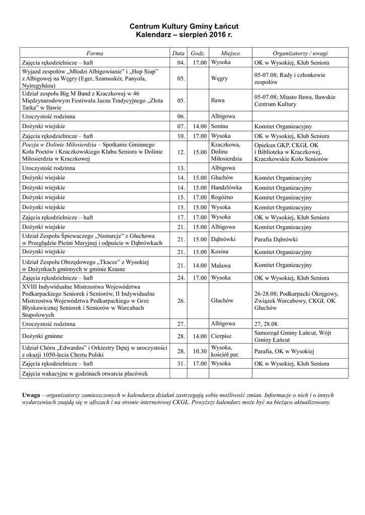 Centrum Kultury Gminy Łańcut Kalendarz – sierpień 2016 r.