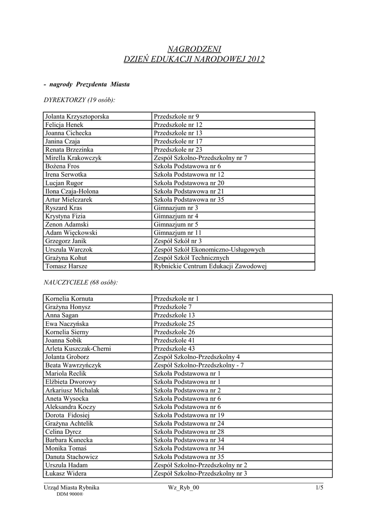 NAGRODZENI DZIEŃ EDUKACJI NARODOWEJ 2012 - nagrody Prezydenta Miasta DYREKTORZY (19 osób): Jolanta Krzysztoporska Felicja Henek Joanna Cichecka Janina Czaja Renata Brzezinka Mirella Krakowczyk Bożena Fros Irena Serwotka Lucjan Rugor Ilona Czaja-Holona Artur Mielczarek Ryszard Kras Krystyna Fizia Zenon Adamski Adam Więckowski Grzegorz Janik Urszula Warczok Grażyna Kohut Tomasz Harsze Przedszkole nr 9 Przedszkole nr 12 Przedszkole nr 13 Przedszkole nr 17 Przedszkole nr 23 Zespół Szkolno-Przedszkolny nr 7 Szkoła Podstawowa nr 6 Szkoła Podstawowa nr 12 Szkoła Podstawowa nr 20 Szkoła Podstawowa nr 21 Szkoła Podstawowa nr 35 Gimnazjum nr 3 Gimnazjum nr 4 Gimnazjum nr 5 Gimnazjum nr 11 Zespół Szkół nr 3 Zespół Szkół Ekonomiczno-Usługowych Zespół Szkół Technicznych Rybnickie Centrum Edukacji Zawodowej NAUCZYCIELE (68 osób): Kornelia Kornuta Grażyna Honysz Anna Sagan Ewa Naczyńska Kornelia Sierny Joanna Sobik Arleta Kuszczak-Cherni Jolanta Groborz Beata Wawrzyńczyk Mariola Reclik Elżbieta Dworowy Arkariusz Michalak Aneta Wysocka Aleksandra Koczy Dorota Fidosiej Grażyna Achtelik Celina Dyrcz Barbara Kunecka Monika Tomaś Danuta Stachowicz Urszula Hadam Łukasz Widera Urząd Miasta Rybnika DDM 9000® Przedszkole nr 1 Przedszkole 7 Przedszkole 13 Przedszkole 25 Przedszkole 26 Przedszkole 41 Przedszkole 43 Zespół Szkolno-Przedszkolny 4 Zespół Szkolno-Przedszkolny - 7 Szkoła Podstawowa nr 1 Szkoła Podstawowa nr 1 Szkoła Podstawowa nr 2 Szkoła Podstawowa nr 6 Szkoła Podstawowa nr 6 Szkoła Podstawowa nr 19 Szkoła Podstawowa nr 24 Szkoła Podstawowa nr 28 Szkoła Podstawowa nr 34 Szkoła Podstawowa nr 34 Szkoła Podstawowa nr 35 Zespół Szkolno-Przedszkolny nr 2 Zespół Szkolno-Przedszkolny nr 3 Wz_Ryb_00 1/5 Beata Kras Agata Sączek Irena Szulc Halina Olborska Teodora Stawiarz Dorota Łęcka-Dudzik Małgorzata Chapuła-Pulit Danuta Demska Agnieszka Alama Joanna Malara Grzegorz Adamczyk Ewa Urbańczyk Katarzyna Androsz Małgorzata Dudek Lech Kowalski Ewa Tyl Mirosław Zaniewicz Zdzisława Siwiaszczyk Danuta Wiosna Izabela Marcol-Perlak Agnieszka Miera Lucyna Orzechowska-Ulbrych Mariusz Absalon Sylwia Janicka Izabela Wróblewska Rafał Morawiec Beata Kocjan Grażyna Szynol-Kowacka Gabriela Gurgul Lech Skała Sylwia Heler-Groborz Bożena Romańska Adelajda Grzegorzyca Maria Strojny Małgorzata Wołowiec Grażyna Winkler Małgorzata Kunka Grzegorz Herman Barbara Kucyniak Stanisław Wojciechowski Zofia Basztoń Ewa Tomas-Modlich Zofia Paszenda Justyna Pieczka Anetta Gawrysiak Alina Drazik Zespół Szkolno-Przedszkolny nr 3 Zespół Szkolno-Przedszkolny nr 3 Zespół Szkolno-Przedszkolny nr 4 Zespół Szkolno-Przedszkolny nr 4 Zespół Szkolno-Przedszkolny nr 5 Zespół Szkolno-Przedszkolny nr 6 Zespół Szkolno-Przedszkolny nr 7 Zespół Szkolno-Przedszkolny nr 11 Gimnazjum nr 1 Gimnazjum nr 1 Gimnazjum nr 1 Gimnazjum nr 2 Gimnazjum nr 2 Gimnazjum nr 2 Gimnazjum nr 2 Gimnazjum nr 3 Gimnazjum nr 4 Gimnazjum nr 5 Gimnazjum nr 7 Gimnazjum nr 10 Zespół Szkół nr 3 Zespół Szkół nr 3 IV Liceum Ogólnokształcące IV Liceum Ogólnokształcące Zespół Szkół nr 1 Zespół Szkół nr 1 Zespół Szkół nr 2 Zespół Szkół nr 3 Zespół Szkół Budowlanych Zespół Szkół Budowlanych Zespół Szkół Budowlanych Zespół Szkół nr 5 Zespół Szkół Ekonomiczno-Usługowych Zespół Szkół Ekonomiczno-Usługowych Zespół Szkół Mechaniczno-Elektrycznych Zespół Szkół Mechaniczno-Elektrycznych Zespół Szkół Technicznych Zespół Szkół Technicznych Zespół Szkół Technicznych Rybnickie Centrum Edukacji Zawodowej Ognisko Pracy Pozaszkolnej Zespół Przygoda Młodzieżowy Dom Kultury Młodzieżowy Dom Kultury Specjalny Ośrodek Szkolno-Wychowawczy Secjalny Zespół Szkolno-Przedszkolny Zespół Szkół nr 6 Medal Komisji Edukacji Narodowej (14 osób) Dyrektorzy Marian Groborz - emerytowany dyrektor IV LO Lucyna Ibrom - Specjalny Zespół Szkolno-Przedszkolny Urząd Miasta Rybnika DDM 9000® Wz_Ryb_00 2/5 Beata Mielczarek - Szkoła Podstawowa nr 34 Iwona Porębska - Przedszkole nr 37 Nauczyciele Jadwiga Abrahamowicz - Zespół Szkół Mechaniczno-Elektrycznych Stanisław Kucharczak – Zespół Szkół nr 1 Dorota Przybyła - Zespół Szkolno-Przedszkolny nr 1 Ewa Gawliczek - Gimnazjum nr 1 Aleksandra Greiner - Szkoła Podstawowa nr 19 Aldona Kaczmarczyk-Kołucka – Młodzieżowy Dom Kultury Dominika Knura – Gimnazjum nr 10 Lucyna Kwiatoń-Skura – Szkoła Podstawowa nr 16 Bogusława Massalska - Szkoła Podstawowa nr 34 Milada Więckowska – Młodzieżowy Dom Kultury Nagroda Ministra Edukacji Narodowej: Grażyna Adamczyk – dyrektor Zespołu Szkół nr 6 Bogumiła Chmiest – Zespół Szkół nr 1 Ewa Gatnar – Zespół Szkół nr 1 Grzegorz Łopatka – Zespół Szkół nr 2 Nagroda Kuratora Oświaty (3 osoby) Ewa Florczyk – dyrektor Zespołu Szkolno-Przedszkolnego nr 2, Barbara Benisz – Szkoła Podstawowa nr 20 Elżbieta Paniczek – Zespół Szkół nr 1 EMERYCI ZWIĄZEK NAUCZYCIELSTWA POLSKIEGO (16 osób) 1. Zofia Borecka - SP nr 19 2. Krystyna Bugla - ZS nr 5 3. Róża Grunberg – P nr 39 4. Jolanta Horst - ZSEU 5. Elżbieta Jakubowska - SP 12 6. Ewa Kilon - SP 21 7. Joanna Kozłowska - P21 8. Eugenia Kusik - ZSME 9. Teresa Marek - G2 10. Wiesława Morawiak-Popczyk - ZS3 11. Danuta Panfil - ZSEU Urząd Miasta Rybnika DDM 9000® Wz_Ryb_00 3/5 12. Mirosław Pilarz - MDK 13. Marianna Serzysko - ZSB 14. Aleksandra Surman - SOSW 15. Krystyna Wąż - ZS3 16. Renata Wiśniowska-Palica - SP12 MIĘDZYZAKŁADOWA ORGANIZACJA ZWIĄZKOWA NSZZ PRACOWNIKÓW OŚWIATY - emeryci i Pani przewodnicząca Hanna Grzelec (2 osoby) 1. Marian Groborz - IV LO „SOLIDARNOŚĆ” 2. Bożena Kuc - SP 22 JUBILEUSZE ZWIĄZEK NAUCZYCIELSTWA POLSKIEGO (24 osoby) 1. Henryka Adaszkiewicz - Zespół Szkolno-Przedszkolny nr 11 2. Małgorzata Bober - Zespół Szkolno-Przedszkolny nr 11 3. Krystyna Bochenek - SP28 4. Carmen Bugla-Dziadek - ZS5 5. Elżbieta Ciwis - P41 6. Iwon