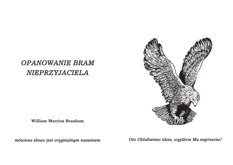 OPANOWANIE BRAM NIEPRZYJACIELA William Marrion Branham mówione sowo jest oryginalnym nasieniem Oto Oblubieniec idzie, wyjd›cie Mu naprzeciw! OPANOWANIE BRAM NIEPRZYJACIELA (Possesing The Enemy’S Gates) 8 listopada 1959 Kaplica Branhama Jeffersonville, Indiana, USA Opanowanie bram nieprzyjaciela (Possessing The Enemy’s Gates ) Poselstwo, wygoszone przez brata Williama Marriona Branhama w niedzielŸ rano, dnia 8 listopada 1959, w Kaplicy Branhama w Jeffersonville, Indiana, USA. PodjŸto wszelkie wysiki, by dokadnie przenie™ø mówione Poselstwo z nagrania na ta™mie magnetofonowej do postaci drukowanej. Podczas korekty korzystano równieŒ z nagra§ na ta™mach w oryginalnym jŸzyku oraz z najnowszej wersji The Message”, wydanej przez Eagle Computing w 1996. Niniejszym zostao opublikowane w penym brzmieniu i jest rozpowszechniane bezpatnie. Wydrukowanie tej broszury zostao umoŒliwione dziŸki wkadom wierzcych, którzy umiowali to Poselstwo i Jego Sawne Przyj™cie. Przetumaczono i opublikowano w 1997. Wszelkie zamówienia naleŒy kierowaø na adres: MÓWIONE S~OWO William Marrion Branham GUTY 74, 739 55 Smilovice, CZ tel. 00420 (0)659 324425 Broszura nie jest przeznaczona na sprzedaŒ. 2 Opanowanie bram nieprzyjaciela `Dzie§ dobry wszystkim. CieszŸ siŸ, Œe mogŸ byø tego dopoudnia w kaplicy, by siŸ dzisiaj modliø za chorych ludzi. Zazwyczaj jest tak, Œe staramy siŸ od czasu do czasu przyj™ø tutaj i modliø siŸ za chorych ludzi, którzy przychodz z róŒnych miejscowo™ci, by siŸ za nich modliø. A obecnie _ odjedziemy teraz niebawem na zgromadzenia do Kalifornii i na Zachodnie WybrzeŒe. I prosimy na pewno o wasze modlitwy, Œeby Bóg Niebios by nam tam mio™ciwy i da nam wspaniae naboŒe§stwa. Wa™nie przybyem tutaj _ wczoraj, wzglŸdnie ubiegego wieczora pó›no. A wczoraj by jeden z^ OtóŒ, dzie§ przedwczorajszy i wczorajszy by jednym z wspaniaych, znamiennych dni mego Œycia. Tam _ znam co najmniej dwóch lub trzech w budynku, którzy s ™wiadkami tego, Œe Pan zstpi do nas wczoraj. I miaa miejsce wielka, wspaniaa rzecz, o której wam nie miaem czasu opowiedzieø dzisiaj do poudnia. Lecz moŒe nastŸpnej niedzieli do poudnia, zanim std odjedziemy, byø moŒe bŸdŸ mia czas podczas goszenia Poselstwa, by wam to opowiedzieø. JeŒeli Pan pozwoli, bŸdŸ tutaj, by siŸ modliø za chorych przynajmniej _ w niedzielŸ do poudnia. MoŒe bŸdziemy chcieli odjechaø okoo poudnia, jeŒeli to bŸdzie moŒliwe, na zgromadzenia w San Jose, w Kalifornii. A jeŒeli tam macie jakich znajomych w okolicy _ tam na Zachodnim WybrzeŒu^ Wierzymy, Œe to moŒe bŸdzie ta godzina, której wygldaem tak dugo _ ta nadchodzca zmiana w mojej usudze. I jest to tak blisko, Œe sobie my™laem, Œe siŸ to stanie wczoraj. I ja wierzŸ, Œe siŸ to stanie obecnie niebawem i bŸdzie to daleko przewyŒszaø wszystko, co dotychczas kiedykolwiek syszeli™my lub widzieli™my. PamiŸtajcie zatem, jest to TAK MÓWI PAN. Rozumiecie? I my tego po prostu oczekujemy w kaŒdej chwili. A obecnie bŸdziemy mieø zgromadzenia na terenie targów miŸdzynarodowych. Ja my™lŸ, Œe to siŸ zgadza, nieprawdaŒ, Gene? Na terenie targów miŸdzynarodowych w San Jose, w Kalifornii. I bŸd to zgromadzenia trwajce dziesiŸø dni, poczwszy od 20. do 29. w San Jose. ProszŸ zatem, Œeby™cie pamiŸtali o nas w modlitwach. Mamy teraz okoo _ jeŒeli sko§czymy w porŸ _ okoo jednej i pó godziny czasu, w którym przyniosŸ Sowo i rozpoczniemy nasz usugŸ modlitwy za chorych. Wybraem na dzisiejsze dopoudnie krótki odstŸp Pisma šwiŸtego _ dwa miejsca w Biblii, by przemawiaø o tym. Lecz zanim bŸdŸ przemawia, pochylmy teraz na chwilŸ nasze gowy w modlitwie. 2 Najaskawszy BoŒe, zbliŒamy siŸ pokornie do Twego tronu aski dzisiaj rano, jako niegodne dzieci, lecz przychodzimy z niezmcon wiar w Boga, która nam bya dana przez Ducha šwiŸtego, a Jego Obecno™ø jest z nami zawsze. A dziŸki obietnicy Pana Jezusa, Œe MÓWIONE S~OWO je™liby™my przyszli pokornie i prosiliby™my o cokolwiek w Jego Imieniu, to nasza pro™ba bŸdzie nam dana. Dlatego nie ogldamy siŸ na nasze zasugi, poniewaŒ nie mamy Œadnych, lecz patrzymy wstecz na dokonane dzieo na Golgocie, gdzie nam bya za darmo darowana aska przez Syna BoŒego. I nie moŒemy niemal powstrzymaø ez, spywajcych nam aŒ na szyjŸ, kiedy my™limy o nas, niegodnych ludziach i jak On uczyni to dla nas z aski tam na Golgocie, Œe moŒemy byø przeniesieni tak blisko Boga _ mianowicie do stosunku pokrewie§stwa. I jeste™my teraz Jego synami i córkami. 3 I przychodzimy dzisiejszego poranka, Panie, pod ten may dach, by po™wiŸciø samych siebie do usugi, wyznajc nasze grzechy i w Boskim oddawaniu czci. Ufamy, Œe Ty bŸdziesz z nami i dasz nam duchowe wejrzenie na Twoje bliskie Przyj™cie, Œeby™my mogli przygotowywaø nasze serca codziennie na to wielkie wydarzenie, którego spodziewano siŸ juŒ tysice lat. NaprawdŸ, caa natura wzdycha, woajc, by zostaa wyzwolona. A nasze duchy w nas, Panie, ustawicznie wyznaj, Œe My jeste™my pielgrzymami i cudzoziemcami, i to nie jest nasz dom, lecz szukamy Miasta, którego Budowniczym i Stwórc jest Bóg”. Wygldamy przyj™cia tego wspaniaego czasu. 4 Panie, chcemy mieø na uwadze, Œe te zgromadzenia, kiedy zgromadzamy siŸ tutaj _ Œe modlimy siŸ za Twoje dzieci, które s chore i cierpice. I prosimy, Œeby™ Ty spotka siŸ z nami dzisiaj w naprawdŸ szczególny sposób, by uzdrowiø wszystkie choroby i dolegliwo™ci w™ród nas. I byø moŒe, Panie, Œe ta obietnica, o której wa™nie poprzednio mówiem _ na naboŒe§stwie z Tob wczoraj zaraz po zachodzie so§ca, i o tym, jak Ty potwierdzae™ to cigle na nowo. I odczuwamy, Œe ta godzina jest bardzo blisko. I niechby to by ten dzie§, Panie, w którym siŸ to stanie _ Œe Ty zmienisz tŸ usugŸ, Panie, w co™, co bŸdzie bardziej mio™ciwe dla Twego ludu. 5 A teraz, Ojcze, BoŒe, nie chcemy siŸ modliø tylko za tych tutaj, ale i za tych roz