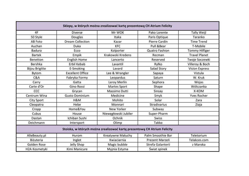 Sklepy, w których można zrealizować kartę prezentową CH Atrium Felicity 4F 50 Style AB Foto Auchan Badura Bartek Benetton Bershka Bijou Brigitte Bytom C&A Carry Carte d'Or CCC Centrum Wina City Sport Cleopatra Cropp Cubus Dastan Deichmann Diverse Douglas Dream Collection Duka Ecco Empik English Home Erbil Kebab E-Smoking Excellent Office Fabryka Formy Gatta Gino Rossi Grycan Gusto Dominium H&M Hebe Home&You House Ichiban Sushi Intersport Mr WOK Itaka Kazar KFC Kolporter Krakowski Kredens Lancerto Lavantil Lavard Lee & Wrangler Leopardus Leroy Merlin Martes Sport Massimo Dutti Medicine Mohito Monnari New Yorker Niewęgłowski Jubiler Ochnik Olimp Pako Lorente Paris Optique Pierre Cardin Pull &Bear Quatro Fashion Recman Reserved Ryłko Salad Story Sapaya Saturn Sephora Shape Sinsay Smyk Solar Stradivarius Subway Super-Pharm Swiss Takko Tally Weijl Taranko Time Trend T-Mobile Tommy Hilfiger Travel Planet Twoje Soczewki Villeroy & Boch Vision Express Vistula W. Kruk Wojas Wólczanka X-KOM Yves Rocher Zara Ziaja Stoiska, w których można zrealizować kartę prezentową CH Atrium Felicity AlleBeauty.pl Biżuteria Golden Rose H2A Kosmetyki Hurom Inglot Jelly Shop Kimi Manicure Kreatywne Maluchy Kwiaciarnia Magic bubble Myjnia Estyma Palm Smoothie Bar Prezent Marzeń Strefa Galanterii Świat spinek Teletorium Telakces.com z Maroka