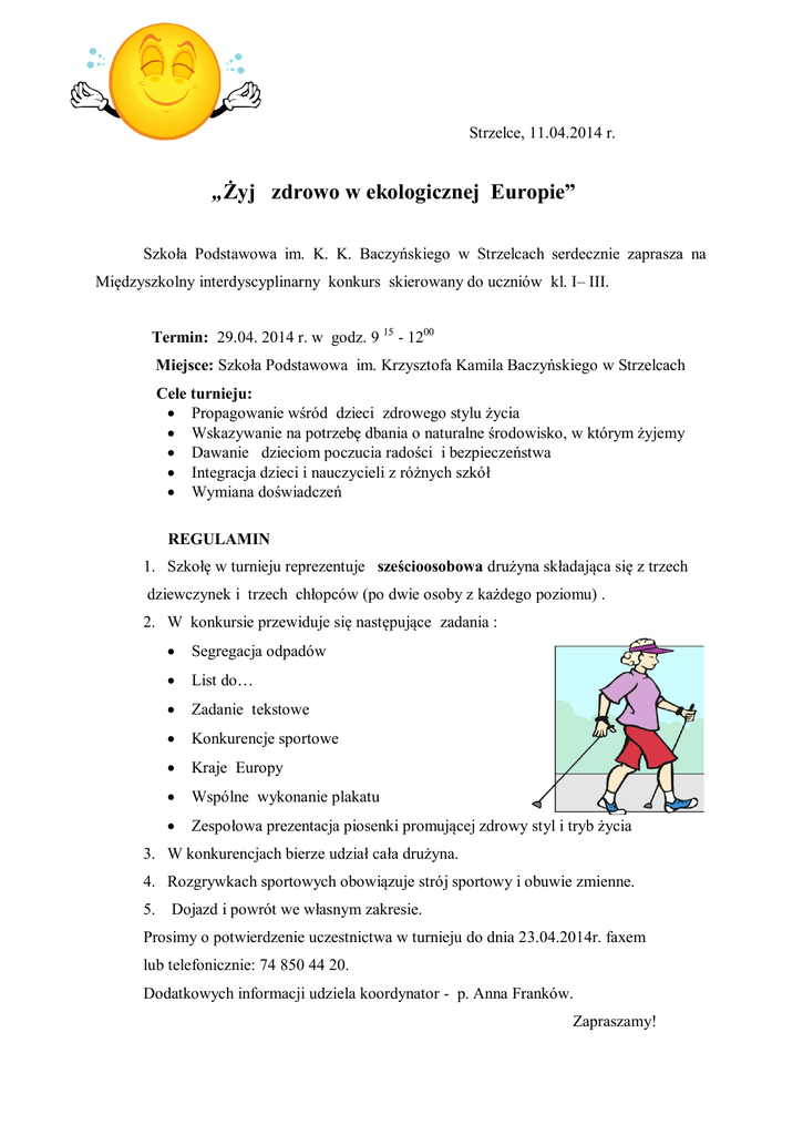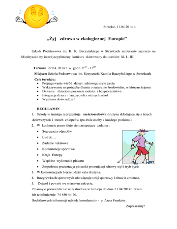 Strzelce, 11.04.2014 r. „Żyj zdrowo w ekologicznej Europie” Szkoła Podstawowa im. K. K. Baczyńskiego w Strzelcach serdecznie zaprasza na Międzyszkolny interdyscyplinarny konkurs skierowany do uczniów kl. I– III. Termin: 29.04. 2014 r. w godz. 9 15 - 1200 Miejsce: Szkoła Podstawowa im. Krzysztofa Kamila Baczyńskiego w Strzelcach Cele turnieju: Propagowanie wśród dzieci zdrowego stylu życia Wskazywanie na potrzebę dbania o naturalne środowisko, w którym żyjemy Dawanie dzieciom poczucia radości i bezpieczeństwa Integracja dzieci i nauczycieli z różnych szkół Wymiana doświadczeń REGULAMIN 1. Szkołę w turnieju reprezentuje sześcioosobowa drużyna składająca się z trzech dziewczynek i trzech chłopców (po dwie osoby z każdego poziomu) . 2. W konkursie przewiduje się następujące zadania : Segregacja odpadów List do… Zadanie tekstowe Konkurencje sportowe Kraje Europy Wspólne wykonanie plakatu Zespołowa prezentacja piosenki promującej zdrowy styl i tryb życia 3. W konkurencjach bierze udział cała drużyna. 4. Rozgrywkach sportowych obowiązuje strój sportowy i obuwie zmienne. 5. Dojazd i powrót we własnym zakresie. Prosimy o potwierdzenie uczestnictwa w turnieju do dnia 23.04.2014r. faxem lub telefonicznie: 74 850 44 20. Dodatkowych informacji udziela koordynator - p. Anna Franków. Zapraszamy! Scenariusz turnieju interdyscyplinarnego w dniu 29.04.2014r. „Żyj zdrowo w ekologicznej Europie” I. Powitanie gości , uczestników turnieju oraz przedstawienie programu : 1. Segregacja odpadów. 2. List do wójta z prośbą o wybudowanie ekologicznej oczyszczalni ścieków w każdej miejscowości naszej gminy. 3. Rozwiązanie zadania tekstowego o treści ekologicznej. 4. Konkurencje sportowe 5. Mapa Europy – kraje i ich stolice 6. Plakat – Dbaj o środowisko, w którym żyjesz! 7. Prezentacja piosenki promującej zdrowy styl życia II. Przebieg turnieju: 1. Segregacja odpadów. Każda drużyna otrzymuje 3 kubły na odpady w powszechnie znanych kolorach oraz worek różnych śmieci. Kto szybciej prawidłowo posegreguje te odpady, zdobywa 3 pkt. 2. List do wójta Gminy Marcinowice w celu wybudowania w każdej miejscowości ekologicznej oczyszczalni, aby ludzie nie zatruwali środowiska wypuszczając ścieki do pobliskich rowów i rzek. Drużyny otrzymują kartkę A 4 długopisy. Mają wspólnie napisać list z przestrzeganiem zasad pisania listów. a) za prawidłowe napisanie listu z zastosowaniem form grzecznościowych – 3 pkt. za błędy, nie zastosowanie zwrotów grzecznościowych kolejno odejmuje się po 1 pkt. b) w przypadku nie wyczerpania tematu – 0 pkt. 3. Rozwiązanie dowolnym sposobem zadania matematycznego o treści ekologicznej. Gospodyni prowadzi ekologiczną hodowlę kur niosek. Codziennie sprzedaje jajka. W środę sprzedała 60 jaj, a w czwartek 96 jaj. Zauważyła, że liczba sprzedanych jaj w danym dniu tygodnia równa jest sumie jaj sprzedanych w dwóch poprzednich dniach. Ile jaj sprzedała w poniedziałek? a) za prawidłowo rozwiązane zadanie wraz z pisemną odpowiedzią – 3 pkt. b) bez odpowiedz – 2 pkt. c) brak rozwiązania – 0 pkt 4. Zestaw konkurencji sportowych Muzyka głośna dopingująca zawodników. „Kto pierwszy? ”. Dzieci stoją w rzędach. Na sygnał prowadzącego pierwsze dzieci z rzędów biegną do półmetka i z powrotem. Wygrywa ten rząd, który szybciej zakończy bieg. Pomoce: pachołki dla każdego rzędu „Wożenie się na kocykach” do półmetka i zmiana ciągnącego z powrotem do linii startu. Zawodnicy dobierają się wzrostem i wagą. Kto pierwszy? Pomoce: kocyk dla każdej drużyny, pachołki dla każdego rzędu „Poprowadź balonik ”. Dzieci prowadzą za pomocą kijków do hokeja nadmuchany balonik do półmetka i z powrotem. Pomoce: wysokie pachołki , hokejki, baloniki dla każdej drużyny. „Skoki w workach” Przed każdym zawodnikiem leży worek. Na sygnał pierwszy zawodnik wskakuje do worka i skacze do półmetka i z powrotem. Przekazuje worek następnemu zawodnikowi. Kto pierwszy ? „Chodzenie z balonikiem”. Dwaj zawodnicy trzymają między brzuchami balonik tak, aby nie upadł. Swoimi rękami, trzymając głowę współćwiczącego, idą bokiem do kierunku trasy do półmetka i z powrotem. Kto pierwszy? Pomoce: balonik dla każdej drużyny, pachołki dla każdego rzędu „Przenoszenie na łyżce mandarynki ” . Dzieci stoją w rzędach. Pierwsi zawodnicy kładą owoc na łyżce idą do półmetka i z powrotem na metę. Przekazują łyżkę i mandarynkę następnemu w rzędach. Kto pierwszy? Pomoce: po1 mandarynce, 1 łyżce , pachołek dla drużyny. Punktacja: Za każde pierwsze miejsce w wyścigu –2 pkt. Drugie – 1 pkt, 5. Mapa Europy. Każda drużyna otrzymuje kontur politycznej mapy Europy. Należy wpisać nazwy 6 stolic państw wybranych przez drużynę. Za prawidłowe rozwiązanie – 3 pkt. Za 1 stolicę – ½ pkt. 6. Plakat – Dbaj o środowisko, w którym żyjesz! Wspólne wykonywanie plakatu. Drużyny otrzymują białe rysunkowe Kartki A3 , kleje w sztyfcie, zeszyt papierów kolorowych . Bez użycia nożyczek ( rwąc papier) tworzą wspólnie plakat. Za ciekawą oprawę, kolorystykę i pomysł drużyna otrzymuje 3 pkt. Po 1 pkt. za poszczególne elementy. 7. Prezentacja piosenki promującej zdrowy styl życia. Każda drużyna otrzymuje 3 pkt. za ładne wykonanie piosenki o tematyce zachęcającej do zdrowego stylu i trybu życia. Uwaga! Jeśli jury usłyszy fałsz w melodii lub pomyłki w słowach – obniża za każdy element o ½ punktu. III. IV. V. Poczęstunek dla zawodników w świetlicy szkolnej. Odczytanie wyników przez jury i rozdanie nagród oraz dyplomów dla szkół. Zakończenie turnieju.
