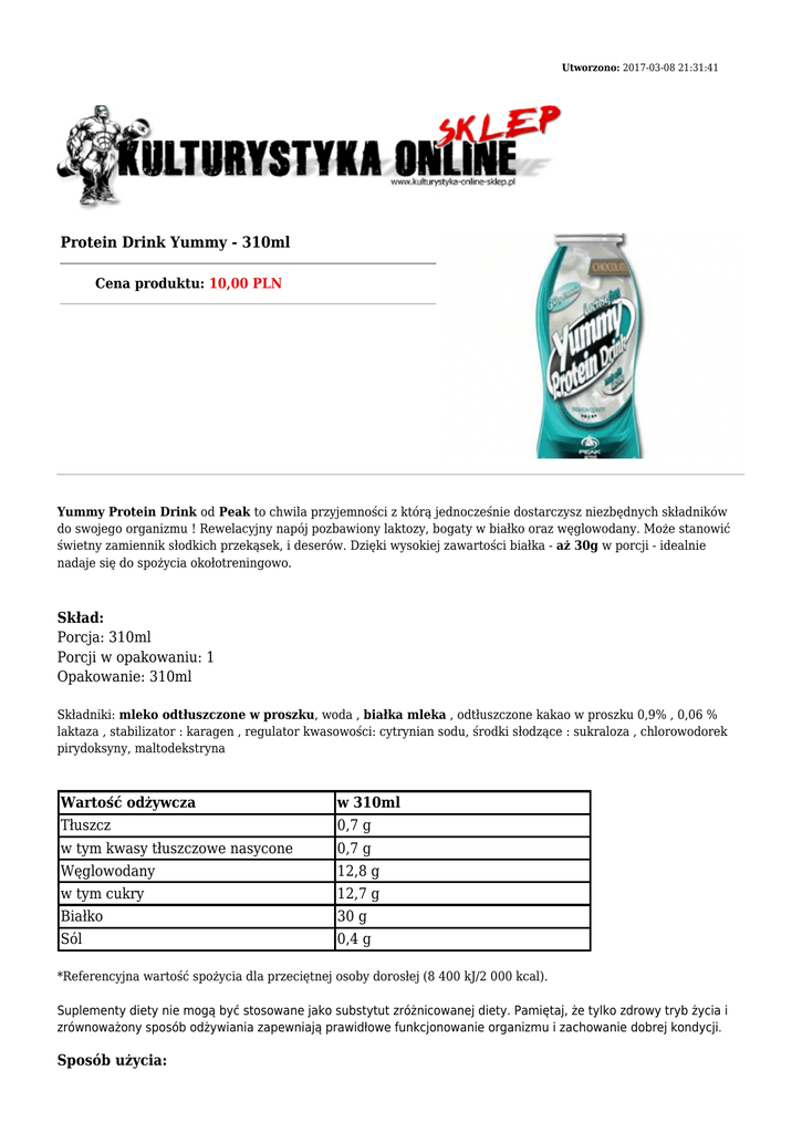 Utworzono: 2017-03-08 21:31:41 Protein Drink Yummy - 310ml Cena produktu: 10,00 PLN Yummy Protein Drink od Peak to chwila przyjemności z którą jednocześnie dostarczysz niezbędnych składników do swojego organizmu ! Rewelacyjny napój pozbawiony laktozy, bogaty w białko oraz węglowodany. Może stanowić świetny zamiennik słodkich przekąsek, i deserów. Dzięki wysokiej zawartości białka - aż 30g w porcji - idealnie nadaje się do spożycia okołotreningowo. Skład: Porcja: 310ml Porcji w opakowaniu: 1 Opakowanie: 310ml Składniki: mleko odtłuszczone w proszku, woda , białka mleka , odtłuszczone kakao w proszku 0,9% , 0,06 % laktaza , stabilizator : karagen , regulator kwasowości: cytrynian sodu, środki słodzące : sukraloza , chlorowodorek pirydoksyny, maltodekstryna Wartość odżywcza w 310ml Tłuszcz 0,7 g w tym kwasy tłuszczowe nasycone 0,7 g Węglowodany 12,8 g w tym cukry 12,7 g Białko 30 g Sól 0,4 g *Referencyjna wartość spożycia dla przeciętnej osoby dorosłej (8 400 kJ/2 000 kcal). Suplementy diety nie mogą być stosowane jako substytut zróżnicowanej diety. Pamiętaj, że tylko zdrowy tryb życia i zrównoważony sposób odżywiania zapewniają prawidłowe funkcjonowanie organizmu i zachowanie dobrej kondycji. Sposób użycia: Zaleca się spożywać w trakcie dnia w zależności od własnego zapotrzebowania. Produkt nie może być stosowany przez osoby uczulone na którykolwiek z jego składników. Najlepiej spożyć przed końcem: miesiąc, rok Numer partii na spodzie opakowania Przechowywać w miejscu niedostępnym dla małych dzieci. Przechowywać w miejscu suchym w temperaturze pokojowej w szczelnie zamkniętych opakowaniach. Adres: http://www.ko.sklep.pl/ Telefon: kom. 782 010 880 Email: [email protected]