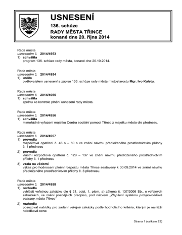 USNESENÍ 136. schůze RADY MĚSTA TŘINCE konané dne 20. října 2014 Rada města usnesením č. 2014/4953 1) schválila program 136. schůze rady města, konané dne 20.10.2014. Rada města usnesením č. 2014/4954 1) určila ověřovatelem usnesení a zápisu 136. schůze rady města místostarostu Mgr. Ivo Kaletu. Rada města usnesením č. 2014/4955 1) schválila zprávu ke kontrole plnění usnesení rady města. Rada města usnesením č. 2014/4956 1) schválila mimořádné vyřazení majetku Centra sociální pomoci Třinec z majetku města dle přednesu. Rada města usnesením č. 2014/4957 1) provedla rozpočtová opatření č. 46 s – 50 s ve znění návrhu předloženého prostřednictvím přílohy č. 1 přednesu 2) provedla vlastní rozpočtová opatření č. 129 – 137 ve znění návrhu předloženého prostřednictvím přílohy č. 1 přednesu 3) vzala na vědomí výkaz pro hodnocení plnění rozpočtu města Třince sestavený k 30.09.2014 ve znění návrhu předloženého prostřednictvím přílohy č. 3 přednesu. Rada města usnesením č. 2014/4958 1) rozhodla vyhlásit veřejnou zakázku dle § 21, odst. 1, písm. a) zákona č. 137/2006 Sb., o veřejných zakázkách, ve znění pozdějších předpisů, pod názvem „Zlepšení systému protipovodňové ochrany města Třinec“ 2) rozhodla posuzovat nabídky pro zadání veřejné zakázky podle hodnotícího kritéria, kterým je nejnižší nabídková cena Strana 1 (celkem 23) 3) rozhodla ustanovit komisi pro posouzení kvalifikace, pro otevírání obálek a pro posouzení a hodnocení nabídek: Komise pro otevírání obálek Mgr. Patrik Žondor Ing. Daniel Fojcik Mgr. Rafał Zawadzki Náhradníci Mgr. Ivo Kaleta Andrea Kufová Mgr. Regina Klusová Komise pro posouzení kvalifikace a hodnocení nabídek Náhradníci Mgr. Ivo Kaleta RNDr. Věra Palkovská Ing. Patrik Žondor Ing. Jana Sikorová Ing. Pavel Moj Leszek Borski Ing. Daniel Fojcik Andrea Kufová Ing. Jana Stonawská Mgr. Ladislav Chromec Mgr. Rafał Zawadzki (hlas poradní) Mgr. Regina Klusová (hlas poradní) 4) schválila zadávací dokumentaci pro akci „Zlepšení systému protipovodňové ochrany města Třinec“, ve znění návrhu předloženého prostřednictvím přílohy č. 1 přednesu 5) pověřila RNDr. Věru Palkovskou, starostku města, ke schválení a podepisování případných rozhodnutí o způsobu vyřízení námitek dle § 110 ve spojení s § 111 zákona č. 137/2006 Sb., o veřejných zakázkách, ve znění pozdějších předpisů, v rámci veřejné zakázky a ke schválení případných změn zadávací dokumentace. Rada města usnesením č. 2014/4959 1) rozhodla o výběru nejvhodnější nabídky dle pořadí nabídek, které stanovila a předložila radě města hodnotící komise, za účelem zadání veřejné zakázky malého rozsahu s názvem „Modernizace výuky na základních školách v Třinci - učební pomůcky - 3“ část - fyzika takto: 1. KVANT, spol. s r. o., FMFI UK Mlynská dolina, 842 48 Bratislava, SK 2. MULTIP Moravia, s. r. o., Palackého 1135/27, 74101 Nový Jičín IČ 313 98 294 IČ 166 27 971 2) rozhodla uzavřít kupní smlouvu č. 2014/06/131/Ho na dodávku učebních pomůcek do učeben základních škol v Třinci mezi městem Třinec a firmou KVANT, spol. s r. o., se sídlem FMFI UK Mlynská dolina, 842 48 Bratislava, Slovakia, IČ 313 98 294, ve znění návrhu předloženého prostřednictvím přílohy č. 1 přednesu 3) rozhodla uzavřít kupní smlouvu č. 2014/06/132/Ho na dodávku učebních pomůcek do učeben základních škol v Třinci mezi městem Třinec a firmou Connexia electric, s. r. o., se sídlem 735 71 Dětmarovice 1170, IČ 286 48 366, ve znění návrhu předloženého prostřednictvím přílohy č. 2 přednesu. Rada města usnesením č. 2014/4960 1) rozhodla o výběru nejvhodnější nabídky dle pořadí nabídek, které stanovila a předložila radě města hodnotící komise, za účelem zadání veřejné zakázky „Úprava zahrady v přírodním stylu u MŠ Sosnová v Třinci“ takto: 1. UPG, s. r. o., 739 61 Třinec IV, Jablunkovská 407 2. FLORA SERVIS, s. r. o., Faměrovo náměstí 31/29, 618 00 Brno IČ 253 66 807 IČ 283 41 627 Strana 2 (celkem 23) 2) rozhodla v souladu s § 82 zákona č. 137/2006 Sb., o veřejných zakázkách, ve znění pozdějších předpisů, uzavřít smlouvu o dílo č. 2014/02/135/Ža na zakázku „Úprava zahrady v přírodním stylu u MŠ Sosnová v Třinci“ mezi městem Třinec a firmou UPG, s. r. o., se sídlem Jablunkovská 407, 739 61 Třinec, IČ 253 66 807, ve znění návrhu předloženého prostřednictvím přílohy č. 1 přednesu. Rada města usnesením č. 2014/4961 1) rozhodla o výběru nejvhodnější nabídky dle pořadí nabídek, které stanovila a předložila radě města hodnotící komise, za účelem zadání veřejné zakázky „Úprava zahrady v přírodním stylu u MŠ Koperníkova v Třinci“ takto: 1. UPG, s. r. o., 73961 Třinec IV, Jablunkovská 407 2. SVOBODNÉ ZAHRADY KLUS, s. r. o., Dolní Líštná 10, Třinec IČ 253 66 807 IČ 277 62 688 2) rozhodla v souladu s § 82 zákona č. 137/2006 Sb., o veřejných zakázkách, ve znění pozdějších předpisů, uzavřít smlouvu o dílo č. 2014/02/136/Ža na zakázku „Úprava zahrady v přírodním stylu u MŠ Koperníkova v Třinci“ mezi městem Třinec a firmou UPG, s. r. o., se sídlem Jablunkovská 407, 739 61 Třinec, IČ 253 66 807, ve znění návrhu předloženého prostřednictvím přílohy č. 1 přednesu. Rada města usnesením č. 2014/4962 1) schválila změny vnitřní směrnice č. 17/2012 „Zásady pro zadávání veřejných zakázek města Třince a příspěvkových organizací města Třince“, a to dle návrhu předloženého prostřednictvím přílohy č. 1 tohoto přednesu 2) uložila viz ÚKOLY. Rada města usnesením č. 2014/4963 1) rozhodla vyloučit uchazeče Z+M Partner, spol.