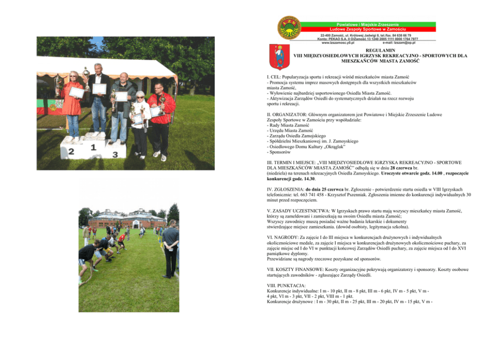 REGULAMIN VIII MIĘDZYOSIEDLOWYCH IGRZYSK REKREACYJNO - SPORTOWYCH DLA MIESZKAŃCÓW MIASTA ZAMOŚĆ I. CEL: Popularyzacja sportu i rekreacji wśród mieszkańców miasta Zamość - Promocja systemu imprez masowych dostępnych dla wszystkich mieszkańców miasta Zamość, - Wyłowienie najbardziej usportowionego Osiedla Miasta Zamość. - Aktywizacja Zarządów Osiedli do systematycznych działań na rzecz rozwoju sportu i rekreacji. II. ORGANIZATOR: Głównym organizatorem jest Powiatowe i Miejskie Zrzeszenie Ludowe Zespoły Sportowe w Zamościu przy współudziale: - Rady Miasta Zamość - Urzędu Miasta Zamość - Zarządu Osiedla Zamojskiego - Spółdzielni Mieszkaniowej im. J. Zamoyskiego - Osiedlowego Domu Kultury „Okrąglak” - Sponsorów III. TERMIN I MIEJSCE: „VIII MIĘDZYOSIEDLOWE IGRZYSKA REKREACYJNO - SPORTOWE DLA MIESZKAŃCÓW MIASTA ZAMOŚĆ” odbędą się w dniu 28 czerwca br. (niedziela) na terenach rekreacyjnych Osiedla Zamoyskiego. Uroczyste otwarcie godz. 14.00 , rozpoczęcie konkurencji godz. 14.30. IV. ZGŁOSZENIA: do dnia 25 czerwca br. Zgłoszenie - potwierdzenie startu osiedla w VIII Igrzyskach telefonicznie: tel. 663 741 458 - Krzysztof Pszenniak. Zgłoszenia imienne do konkurencji indywidualnych 30 minut przed rozpoczęciem. V. ZASADY UCZESTNICTWA: W Igrzyskach prawo startu mają wszyscy mieszkańcy miasta Zamość, którzy są zameldowani i zamieszkują na swoim Osiedlu miasta Zamość; Wszyscy zawodnicy muszą posiadać ważne badania lekarskie i dokumenty stwierdzające miejsce zamieszkania. (dowód osobisty, legitymacja szkolna). VI. NAGRODY: Za zajęcie I do III miejsca w konkurencjach drużynowych i indywidualnych okolicznościowe medale, za zajęcie I miejsca w konkurencjach drużynowych okolicznościowe puchary, za zajęcie miejsc od I do VI w punktacji końcowej Zarządów Osiedli puchary, za zajęcie miejsca od I do XVI pamiątkowe dyplomy. Przewidziane są nagrody rzeczowe pozyskane od sponsorów. VII. KOSZTY FINANSOWE: Koszty organizacyjne pokrywają organizatorzy i sponsorzy. Koszty osobowe startujących zawodników - zgłaszające Zarządy Osiedli. VIII. PUNKTACJA: Konkurencje indywidualne: I m - 10 pkt, II m - 8 pkt, III m - 6 pkt, IV m - 5 pkt, V m 4 pkt, VI m - 3 pkt, VII - 2 pkt, VIII m - 1 pkt. Konkurencje drużynowe : I m - 30 pkt, II m - 25 pkt, III m - 20 pkt, IV m - 15 pkt, V m - 10 pkt, VI m - 8 pkt, VII - 7 pkt, VIII m - 6 pkt, od IX m po 5 pkt. Suma punktów wyłoni miejsce Osiedla. IX. POSTANOWIENIA KOŃCOWE: - Wszystkich zawodników obowiązuje strój sportowy. - Prawo interpretacji regulaminu przysługuje PiM Z LZS Zamość oraz sędziemu głównemu. - Wszystkie dzieci uczestniczące w zawodach startują pod opieką rodziców lub osób dorosłych. - Organizator nie odpowiada za zaginione rzeczy lub przedmioty. - VIiI Międzyosiedlowe Igrzyska Rekreacyjno - Sportowe są ubezpieczone. - Igrzyska odbędą się bez względu na warunki atmosferyczne. KONKURENCJE DRUŻYNOWE 1. PIŁKA NOŻNA - MĘŻCZYZN Losowanie gier o godz. 14 drużyny 4 osobowe. W Igrzyskach uczestniczy jedna drużyna z danego Osiedla Miasta Zamość licząca 4 zawodników w tym bramkarz plus 2 zawodników rezerwowych.(rocz. 1999) Turniej zostanie rozegrany na boisku. System rozgrywek i czas gry zostanie podany podczas losowania i uzależniony będzie od ilości drużyn. Obowiązuje obuwie: lanki, korkotrampki, trampki, tenisówki. 2. PIŁKA SIATKOWA MĘŻCZYZN - drużyn 3-osobowych. Startują zawodnicy ur. w 1998 roku i starsi. W Igrzyskach uczestniczy jedna drużyna z danego osiedla miasta Zamość licząca 3 zawodniczki. Turniej zostanie rozegrany na boisku o wymiarach 7 m x 7 m. System rozgrywek zostanie podany podczas losowania i uzależniony będzie od ilości drużyn. Losowanie gier godz. 14.00. 3. PIŁKA SIATKOWA KOBIET - drużyn 3-osobowych. Startują zawodniczki ur. w 1998 roku i starsze. W Igrzyskach uczestniczy jedna drużyna z danego osiedla miasta Zamość licząca 3 zawodniczki. Turniej zostanie rozegrany na boisku o wymiarach 7 m x 7 m. System rozgrywek zostanie podany podczas losowania i uzależniony będzie od ilości drużyn. Losowanie gier godz. 14.00. 4. PRZECIĄGANIE LINY MĘZCZYZN - drużyn 5 osobowych. Startują zawodnicy ur. w 1998 roku i starsi. W Igrzyskach uczestniczy jedna drużyna z danego osiedla miasta Zamość w obuwiu sportowym bez kolców i korków w podeszwie. Sposób i system rozgrywek zostanie podany podczas losowania i uzależniony będzie od ilości drużyn. KONKURENCJE INDYWIDUALNE 1. RZUT LOTKĄ DO TARCZY - DZIEWCZĘTA Startują zawodniczki ur. w 2002 roku i młodsze. Każde osiedle miasta Zamość ma prawo wystawić 3 zawodniczki. Zawodniczki wykonują rzuty do tarczy punktowej - 3 rzuty próbne - 5 ocenianych z odległości 2,5 m. Łączna ilość pkt. w konkursie decyduje o kolejności zajętych miejsc. W przypadku równej ilości pkt. decydują rzuty 10,9,8. 2. RZUT LOTKĄ DO TARCZY - CHŁOPCY - Startują zawodnicy ur. w 2002 roku i młodsi. Każde osiedle miasta Zamość ma prawo wystawić 3 zawodników. Zasady rozgrywania konkurencji jw. 3. RZUT LOTKĄ DO TARCZY - DZIEWCZĘTA - Startują zawodniczki ur. w 1999 - 2001 roku. Każde osiedle miasta Zamość ma prawo wystawić 3 zawodniczki. Zasady rozgrywania konkurencji jw. 4. RZUT LOTKĄ DO TARCZY - CHŁOPCY - Startują zawodnicy ur. w 1999 - 2001 roku. Każde osiedle miasta Zamość ma prawo wystawić 3 zawodników. Zasady rozgrywania konkurencji jw. 5. RZUT LOTKĄ DO TARCZY – KOBIET - Startują zawodniczki ur. w 1998 roku i starsze. Każde osiedle miasta Zamość ma prawo wystawić 3 zawodniczki. Zasady rozgrywania konkurencji jw. 6. RZUT LOTKĄ DO TARCZY – MĘŻCZYZN- Startują zawodnicy ur. w 1998 i starsi. Każde osiedle miasta Zamość ma prawo wystawić 3 zawodników. Zasady rozgrywania konkurencji jw. 7. WYCISKANIE ODWAŻNIKA - Każde osiedle ma Prawo wystawić dowolną ilość zawodników do konkursu. Rocznik 1998 i starsi. Zawodnicy wyciskają lewą lub 