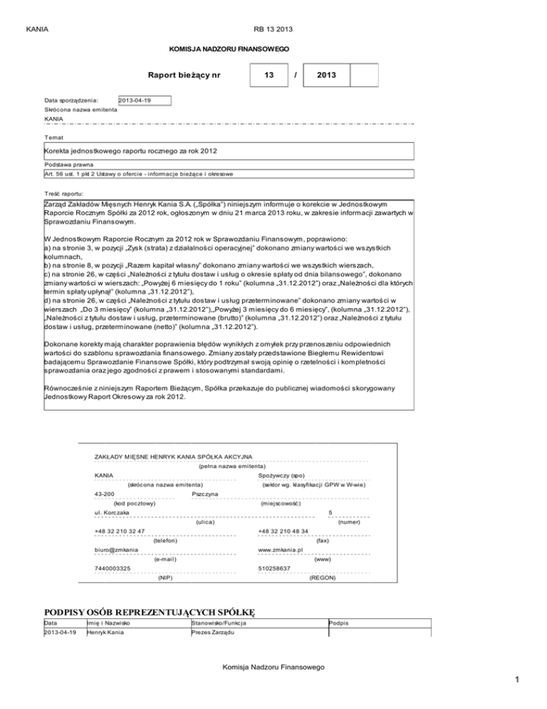 KANIA RB 13 2013 KOMISJA NADZORU FINANSOWEGO Raport bieŜący nr 13 / 2013 2013-04-19 Data sporządzenia: Skrócona nazwa emitenta KANIA Temat Korekta jednostkowego raportu rocznego za rok 2012 Podstawa prawna Art. 56 ust. 1 pkt 2 Ustawy o ofercie - informacje bieŜące i okresowe Treść raportu: Zarząd Zakładów Mięsnych Henryk Kania S.A. („Spółka”) niniejszym informuje o korekcie w Jednostkowym Raporcie Rocznym Spółki za 2012 rok, ogłoszonym w dniu 21 marca 2013 roku, w zakresie informacji zawartych w Sprawozdaniu Finansowym. W Jednostkowym Raporcie Rocznym za 2012 rok w Sprawozdaniu Finansowym, poprawiono: a) na stronie 3, w pozycji „Zysk (strata) z działalności operacyjnej” dokonano zmiany wartości we wszystkich kolumnach, b) na stronie 8, w pozycji „Razem kapitał własny” dokonano zmiany wartości we wszystkich wierszach, c) na stronie 26, w części „NaleŜności z tytułu dostaw i usług o okresie spłaty od dnia bilansowego”, dokonano zmiany wartości w wierszach: „PowyŜej 6 miesięcy do 1 roku” (kolumna „31.12.2012”) oraz „NaleŜności dla których termin spłaty upłynął” (kolumna „31.12.2012”), d) na stronie 26, w części „NaleŜności z tytułu dostaw i usług przeterminowane” dokonano zmiany wartości w wierszach „Do 3 miesięcy” (kolumna „31.12.2012”),„PowyŜej 3 miesięcy do 6 miesięcy”, (kolumna „31.12.2012”), „NaleŜności z tytułu dostaw i usług, przeterminowane (brutto)” (kolumna „31.12.2012”) oraz „NaleŜności z tytułu dostaw i usług, przeterminowane (netto)” (kolumna „31.12.2012”). Dokonane korekty mają charakter poprawienia błędów wynikłych z omyłek przy przenoszeniu odpowiednich wartości do szablonu sprawozdania finansowego. Zmiany zostały przedstawione Biegłemu Rewidentowi badającemu Sprawozdanie Finansowe Spółki, który podtrzymał swoją opinię o rzetelności i kompletności sprawozdania oraz jego zgodności z prawem i stosowanymi standardami. Równocześnie z niniejszym Raportem BieŜącym, Spółka przekazuje do publicznej wiadomości skorygowany Jednostkowy Raport Okresowy za rok 2012. ZAKŁADY MIĘSNE HENRYK KANIA SPÓŁKA AKCYJNA (pełna nazwa emitenta) KANIA SpoŜywczy (spo) (skróc ona nazwa emitenta) 43-200 (sektor wg. klasyfikacji GPW w W-wie) Pszc zyna (kod pocztowy) (miejscowość) ul. Korc zaka 5 (ulica) (numer) +48 32 210 32 47 +48 32 210 48 34 (telefon) (fax) biuro@zmkania www.zmkania.pl (e-mail) (www) 7440003325 510258637 (NIP) (REGON) PODPISY OSÓB REPREZENTUJĄCYCH SPÓŁKĘ Data Imię i Nazwisko Stanowisko/Funkc ja 2013-04-19 Henryk Kania Prezes Zarządu Podpis Komisja Nadzoru Finansowego 1
