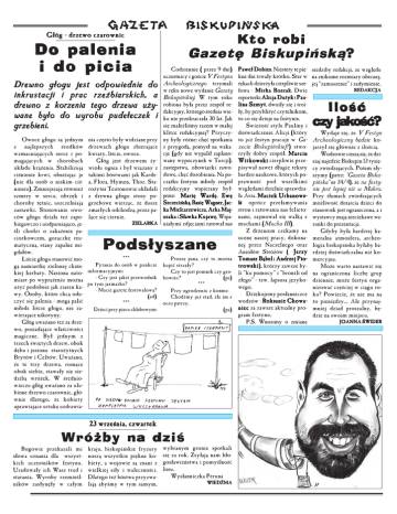 Głóg − drzewo czarownic Do palenia i do picia Drewno głogu jest odpowiednie do inkrustacji i prac rzeźbiarskich, a drewno z korzenia tego drzewa uży− wane było do wyrobu pudełeczek i grzebieni. Owoce głogu są jednym z najlepszych środków wzmacniających serce i po− magających w chorobach układu krążenia. Stabilizują ciśnienie krwi, obniżając je (nie dla osób o niskim ciś− nieniu). Zmniejszają również szmery w sercu, obrzęk i choroby tętnic, uszczelniają zastawki. Stosowanie owo− ców głogu działa też zapo− biegawczo i uodparniająco, je− śli chodzi o zakażenie pa− ciorkowcem, gorączkę reu− matyczną, stany zapalne mi− gdałów. Liście głogu stanowić mo− gą namiastkę zielonej chińs− kiej herbaty. Nasiona nato− miast po wyprażeniu można użyć podobnie jak ziaren ka− wy. Osoby, które chcą odu− czyć się palenia − mogą palić młode liście głogu, nie za− wierające nikotyny. Głóg uważano też za drze− wo, posiadające właściwości magiczne. Był jednym z trzech świętych drzew, obok dębu i jesionu starożytnych Brytów i Celtów. Uważano, że te trzy drzewa, rosnące obok siebie, stawały się sie− dzibą wróżek. W średnio− wieczu głóg uważano za ulu− bione drzewo czarownic, głó− wnie dlatego, że kobiety uprawiające sztukę uzdrawia− nia często były widziane przy drzewach głogu zbierające kwiaty, liście, owoce. Głóg jest drzewem ży− wiołu ognia i był wiązany z takimi bóstwami jak Karde− a, Flora, Hymen, Thor. Sta− rożytni Teutonowie układali z drewna głogu stosy po− grzebowe wierząc, że dusze zmarłych odchodzą, przez pa− lące się ciernie. ZIELARKA Kto robi Gazetę Biskupińską ? Codziennie ( przez 9 dni) uczestnicy i goście V Festynu Archeologicznego trzymali w ręku nowe wydanie Gazety Biskupińskiej. W tym roku robiona była przez zespół re− dakcyjny, którego średnia wie− ku nie przekraczała 30 lat. Jak się znaleźliśmy razem w małej klitce redakcyjnej? Przyczy− ny były różne: chęć spotkania z przygodą, pomysł na waka− cje (gdy nie wypalił zaplano− wany wypoczynek w Turcji), zastępstwa, obowiązki zawo− dowe, chęć dorobienia. Na po− czątku festynu młody zespół redakcyjny wspierany był− przez: Marię Wardę Wardę, Ewę Szczecińską Szczecińską, Basię Wagner, Jac− ka Mielcarzewicza Mielcarzewicza, Arka Maj− szaka i Sławka Kujawę Kujawę. Wspa− niałymi zdjęciami ratował nas Podsłyszane *** Pytania do osób w punkcie informacyjnym: − Czy jest jakiś przewodnik po tym jarmarku? − Macie gazetę festiwalową? (ad) *** Dzieci przy piecu chlebowym: Proszę pana, czy tu można kupić strzały? Czy to jest pomnik czy gro− bowiec? (ps) *** Przy ogrodzeniu z końmi: Chodźmy już stąd, źle im z oczu patrzy. (ps) 23 września, czwartek Wróżby na dziś Bogowie przekazali mi słowa uznania dla wszyst− kich uczestników festynu. Uradowały ich Wasz trud i starania. Wyroby rzemieśl− ników zasłynęły w całym kraju, biskupińskie fryzury noszą wszystkie piękne ko− biety, a wojowie są znani z wielkiej siły i waleczności. Dlatego też bóstwa przyzwa− lają abyśmy w tym samym, wybranym gronie spotkali się za rok. Zsyłają nam bło− gosławieństwa i pomyślność losu. Wysłanniczka Peruna WIEDŹMA Paweł Dobies Dobies. Niestety te pię− kne dni trwały krótko. Ster w rękach dzierżyła cierpliwie sze− fowa − Mirka Roszak Roszak. Dwie reporterki Alicja Dużyk i Pau− lina Szmyt Szmyt, dwoiły się i troi− ły, by przybliżyć czytelnikom, to co się dzieje na festynie. Świeżość stylu Pauliny i doświadczenie Alicji (który to już festyn pracuje w Ga− zecie Biskupińskiej?) stwo− rzyły dobry zespół. Marcin Witkowski cierpliwie prze− pisywał nawet długie teksty bardzo naukowe, których po− prawność pod wszelkimi względami dzielnie sprawdza− ła Asia. Maciek Urbanows− ki oprócz przełamywania stron i ratowania nas felieto− nami, zajmował się walką z muchami (Mucha III). Z drżeniem czekamy na ocenę naszej pracy, dokona− nej przez Naczelnego oraz Aniołów Stróżów ( Jerzy Tomasz Bąbel i Andrzej Pio− trowski trowski), którzy zawsze by− li “ku pomocy” i “bronili od złego” − tzw. lapsusa języko− wego. Dziękujemy posłanniczce wodzów − Roksanie Chowa− niec za zawsze aktualny pro− gram festynu. P.S. Wnosimy o zmianę siedziby redakcji, ze względu na znikome rozmiary obecnej, jej “zamuszenie” i zadymienie. REDAKCJA Ilość czy jakość? Wydaje się, że V Festyn Archeologiczny będzie ko− jarzył się głównie z ilością. Wodzowie cieszą się, że dzi− siaj najedzie Biskupin 13 tysię− cy zwiedzających. Potem sły− szymy (patrz: "Gazeta Bisku− pińska" nr 34/4), że na festy− nie jest lepiej niż w Makro. Przy tłumach zwiedzających możliwość dotarcia dzieci do stanowisk jest ograniczona, a i wystawcy mają nieciekawe wa− runki do prezentacji. Gdyby była bardziej ka− meralna atmosfera, archeo− logia biskupińska byłaby ba− rdziej doświadczalna niż ko− mercyjna. Może warto nastawić się na ograniczoną liczbę grup dziennie, może festyn orga− nizować częściej w ciągu ro− ku? Powiecie, że nie ma na to pieniędzy... Ale przynaj− mniej dziad proszalny, bę− dzie na swoim miejscu. JOANNA ŚWIDER