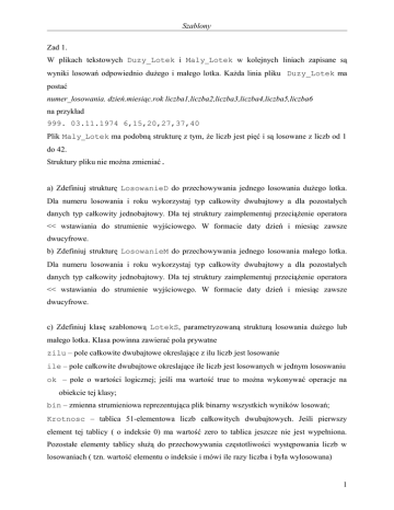Szablony Zad 1. W plikach tekstowych Duzy_Lotek i Maly_Lotek w kolejnych liniach zapisane są wyniki losowań odpowiednio dużego i małego lotka. Każda linia pliku Duzy_Lotek ma postać numer_losowania. dzień.miesiąc.rok liczba1,liczba2,liczba3,liczba4,liczba5,liczba6 na przykład 999. 03.11.1974 6,15,20,27,37,40 Plik Maly_Lotek ma podobną strukturę z tym, że liczb jest pięć i są losowane z liczb od 1 do 42. Struktury pliku nie można zmieniać. a) Zdefiniuj strukturę LosowanieD do przechowywania jednego losowania dużego lotka. Dla numeru losowania i roku wykorzystaj typ całkowity dwubajtowy a dla pozostałych danych typ całkowity jednobajtowy. Dla tej struktury zaimplementuj przeciążenie operatora << wstawiania do strumienie wyjściowego. W formacie daty dzień i miesiąc zawsze dwucyfrowe. b) Zdefiniuj strukturę LosowanieM do przechowywania jednego losowania małego lotka. Dla numeru losowania i roku wykorzystaj typ całkowity dwubajtowy a dla pozostałych danych typ całkowity jednobajtowy. Dla tej struktury zaimplementuj przeciążenie operatora << wstawiania do strumienie wyjściowego. W formacie daty dzień i miesiąc zawsze dwucyfrowe. c) Zdefiniuj klasę szablonową LotekS, parametryzowaną strukturą losowania dużego lub małego lotka. Klasa powinna zawierać pola prywatne zilu – pole całkowite dwubajtowe okreslające z ilu liczb jest losowanie ile – pole całkowite dwubajtowe okreslające ile liczb jest losowanych w jednym lososwaniu ok – pole o wartości logicznej; jeśli ma wartość true to można wykonywać operacje na obiekcie tej klasy; bin – zmienna strumieniowa reprezentująca plik binarny wszystkich wyników losowań; Krotnosc – tablica 51-elementowa liczb całkowitych dwubajtowych. Jeśli pierwszy element tej tablicy ( o indeksie 0) ma wartość zero to tablica jeszcze nie jest wypełniona. Pozostałe elementy tablicy służą do przechowywania częstotliwości występowania liczb w losowaniach ( tzn. wartość elementu o indeksie i mówi ile razy liczba i była wylosowana) 1 Szablony Wszystkie metody, z wyjątkiem konstruktora będą pracowały na pliku binarnym skojarzonym ze zmienną strumieniową bin. W metodach należy dbać o to by ten plik był gotowy do użytkowania w sensie odczytu danych w nim zapisanych. Większość metod wykonuje swoje działanie tylko wtedy gdy na obiekcie można wykonywać operacje. Metody klasy: prywatne (pomocnicze) zapis_binarny – zapisująca dane z pliku tekstowego (o danych zapisanych jak opisano wyżej) do pliku binarnego w postaci struktur typu z szablonu klasy; wynikiem funkcji jest liczba rekordów zapisanych do pliku TablicaKrotnosc metoda wypełniająca tablicę Krotność publiczne: -konstruktor dwoma parametrami typu short i z trzecim parametrem tekstowym o wartości domyślnej pusty łańcuch. Parametry całkowite określają: ile liczb losujemy a drugi z ilu liczb losujemy. Trzecim parametrem jest łańcuch określający plik tekstowy z wynikami losowań. Jeśli łańcuch nie jest pusty konstruktor zapisuje dane tekstowe w pliku binarnym o rozszerzeniu dat i co najwyżej ośmiu znakach zadanej w parametrze nazwy pliku tekstowego (np. 2015_lot.dat) a później otwiera go do czytania. Jeśli łańcuch jest pusty konstruktor otwiera odpowiedni (w zależności od ilości liczb spośród których odbywa się losowanie) plik binarny (np. Duzy_lot.dat) do odczytu (plik binarny wcześniej utworzony). W zależności od powodzenia operacji na plikach ustawia odpowiednio wartość pola ok. Zeruje tablicę Krotnosc; - Niepusty metoda dająca w wyniku wartość pola ok; - Czestotliwosci metoda wyświetlająca częstotliwość występowania w losowaniach poszczególnych liczb; - NajrzadziejLosowane - metoda wyświetlająca najrzadziej wylosowane liczby ; - NajczesciejLosowane- metoda wyświetlająca najczęściej losowane liczby ; - LosowanieNr – metoda wyświetlająca zadane parametrem (numer losowania) losowanie - IleTakich – metoda z parametrem będącym tablicą liczb całkowitych dwubajtowych reprezentujących liczby jednego losowania; wynikiem funkcji jest liczba mówiąca ile było losowań z wynikami jak parametr metody, ponadto metoda wyświetla te losowania; - WybierzDoPliku – metoda o dwóch parametrach całkowitych dwubajtowych rok i miesiąc; parametr miesiąc ma zerową wartość domyślną, metoda tworzy plik tekstowy o nazwie LDrrrrmm.txt (jeśli jest to duży lotek) lub LMrrrrmm.txt (jeśli jest to mały lotek) i 2 Szablony zapisuje do niego wyniki losowań z zadanego roku i miesiąca; jeśli miesiąc jest zerowy to z całego roku. - inne metody według autora programu Wykonaj odpowiednie testowania. W testowaniach należy utworzyć pliki tekstowe dla każdego miesiąca z roku 2014 dla obu lotków (razem 24 pliki tekstowe) Zad 2. Napisz funkcję minimumTablicy, wyznaczającą wartość minimalną z n pierwszych elementów tablicy zawierającej dane, dla których określony jest operator relacji < służący do porównywania danych. Wynikiem funkcji jest wartość minimalnego elementu. Testowanie funkcji należy wykonać na tablicach zawierających - liczby całkowite - liczby rzeczywiste - struktury(klasy) zawierające daty (operator< określa daty wcześniejsze) - obiekty typu Auto. Klasa Auto zawiera nazwę auta, rok produkcji, cenę (inne pola wg. uznania) i przeciążony operator < zastosowany do ceny auta. Zad 3. Zdefiniuj i przetestuj klasę szablonową TablicaS pozwalającą na przechowywanie danych dowolnego typu. Dla obiektów tej klasy powinien być przeciążony operator indeksowania oraz powinna być możliwość zmiany rozmiaru tablicy. Tablica tworzona powinna być dynamicznie. W przypadku gdy dynamiczna tablica jest za mała to należy zwiększyć jej pojemność o 100 następnych danych ( oczywiście jeśli się da). W przypadku niepowodzenia (np. za mało pamięci) lub niepoprawnych operacji (przekroczenie zakresu indeksów) należy rzucać wyjątki. Inne operacje n