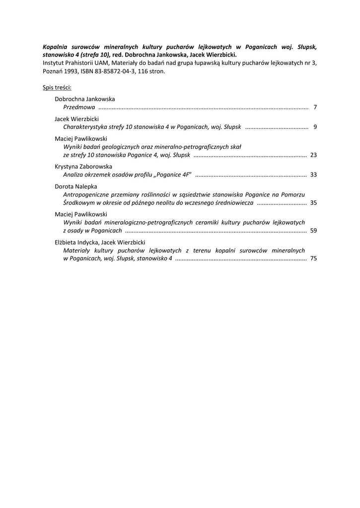 Kopalnia surowców mineralnych kultury pucharów lejkowatych w Poganicach woj. Słupsk, stanowisko 4 (strefa 10), red. Dobrochna Jankowska, Jacek Wierzbicki. Instytut Prahistorii UAM, Materiały do badań nad grupa łupawską kultury pucharów lejkowatych nr 3, Poznań 1993, ISBN 83-85872-04-3, 116 stron. Spis treści: Dobrochna Jankowska Przedmowa .............................................................................................................................. 7 Jacek Wierzbicki Charakterystyka strefy 10 stanowiska 4 w Poganicach, woj. Słupsk ...................................... 9 Maciej Pawlikowski Wyniki badań geologicznych oraz mineralno-petrograficznych skał ze strefy 10 stanowiska Poganice 4, woj. Słupsk .................................................................... 23 Krystyna Zaborowska Analiza okrzemek osadów profilu „Poganice 4F” ................................................................... 33 Dorota Nalepka Antropogeniczne przemiany roślinności w sąsiedztwie stanowiska Poganice na Pomorzu Środkowym w okresie od późnego neolitu do wczesnego średniowiecza .............................. 35 Maciej Pawlikowski Wyniki badań mineralogiczno-petrograficznych ceramiki kultury pucharów lejkowatych z osady w Poganicach ............................................................................................................. 59 Elżbieta Indycka, Jacek Wierzbicki Materiały kultury pucharów lejkowatych z terenu kopalni surowców mineralnych w Poganicach, woj. Słupsk, stanowisko 4 ............................................................................... 75
