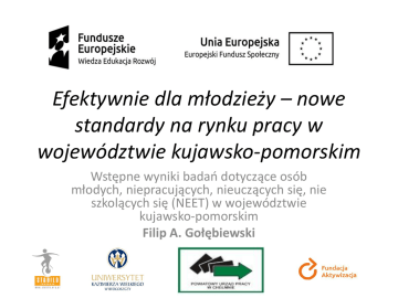 Efektywnie dla młodzieży – nowe standardy na rynku pracy w województwie kujawsko-pomorskim Wstępne wyniki badań dotyczące osób młodych, niepracujących, nieuczących się, nie szkolących się (NEET) w województwie kujawsko-pomorskim Filip A. Gołębiewski Próba badawcza 1. Wymiar ilościowy: • 300 ankiet z osobami z kategorii NEET • 50 ankiet z pracodawcami • 50 ankiet z przedstawicielami Instytucji Rynku Pracy 2. Wymiar jakościowy: • 30 IDI oraz 2 FGI z osobami z kategorii NEET • 25 IDI oraz 2 FGI z pracodawcami • 25 IDI oraz 2 FGI z przedstawicielami Instytucji Rynku Pracy Dobór próby: 1. Brodnica 2. Toruń 3. Bydgoszcz 4. Grudziądz 5. Nakło 6. Włocławek 7. Chełmno 8. Lipno 9. Tuchola W każdym z powiatów realizowana jest podpróba: 33 ankiety NEET, 6 ankiet IRP, 6 ankiet Pracodawcy, 4 IDI NEET, 4 IDI IRP, 4 IDI Pracodawcy Główne założenia badania: 1. W odniesieniu do NEETS zbadanie głównie: • motywacji • uwarunkowań (socjalizacyjnych i materialnych) • ścieżek edukacyjnych • doświadczeń zawodowych i postrzegania pracodawców • sposobów poszukiwania pracy • codziennych zachowań • postrzegania siebie i barier, jakie utrudniają zdobycie pracy Główne założenia badania: 2. W odniesieniu do Pracodawców zbadanie głównie: • doświadczeń z pracownikami młodymi (15-29 lat) • porównania młodszych i starszych pracowników • form zatrudniania • sposobów rekrutacji • postrzegania młodych ludzi na rynku pracy • postrzegania i współpracy z IRP • barier utrudniających zatrudnianie młodych ludzi Główne założenia badania: 3. W odniesieniu do IRP zbadanie głównie: • proponowanych form aktywizacji zawodowej i ich oceny • postrzegania osób młodych na rynku pracy • systemowych barier utrudniających realizację misji placówki • wewnętrznych barier utrudniających realizację misji placówki • współpracy z pracodawcami Wstępnie zaobserwowane zjawiska i prawidłowości: 1. Są różne typy NEETsów: • „niezaradny życiowo” • „klient opieki społecznej” • „prawdopodobnie pracujący” • „ambitny pechowiec” • „niepełnosprawny” • „dziecko bogatych” • „korzystający z używek” Wstępnie zaobserwowane zjawiska i prawidłowości: 2. W odniesieniu do Pracodawców: • częsta racjonalność działań posunięta do skrajności (minimalizowanie kosztów, maksymalizowanie zysków) • najbardziej zaufaną formą zatrudniania jest tzw. „z polecenia” • raczej negatywna ocena młodych pracowników (roszczeniowość, zainteresowanie głównie wynagrodzeniem, brak zaangażowania w pracę i identyfikacji z firmą) • częsta krytyka „fikcyjności” działań IRP Wstępnie zaobserwowane zjawiska i prawidłowości: 3. W odniesieniu do IRP: • krytyka nadmiernej pomocy społecznej, głównie programu 500+ • negatywne postrzeganie młodych na rynku pracy • krytyka pracodawców, którzy zatrudniają „na czarno” Dziękuję za uwagę! Filip A. Gołębiewski Kierownik badania w ramach projektu: Efektywnie dla młodzieży – nowe standardy na rynku pracy w województwie kujawsko-pomorskim Projekt współfinansowany w ramach Europejskiego Funduszu Społecznego. Działanie 2.4 – Modernizacja publicznych i prywatnych służb zatrudnienia oraz lepsze dostosowanie ich do potrzeb rynku pracy, Program Operacyjny Wiedza Edukacja Rozwój