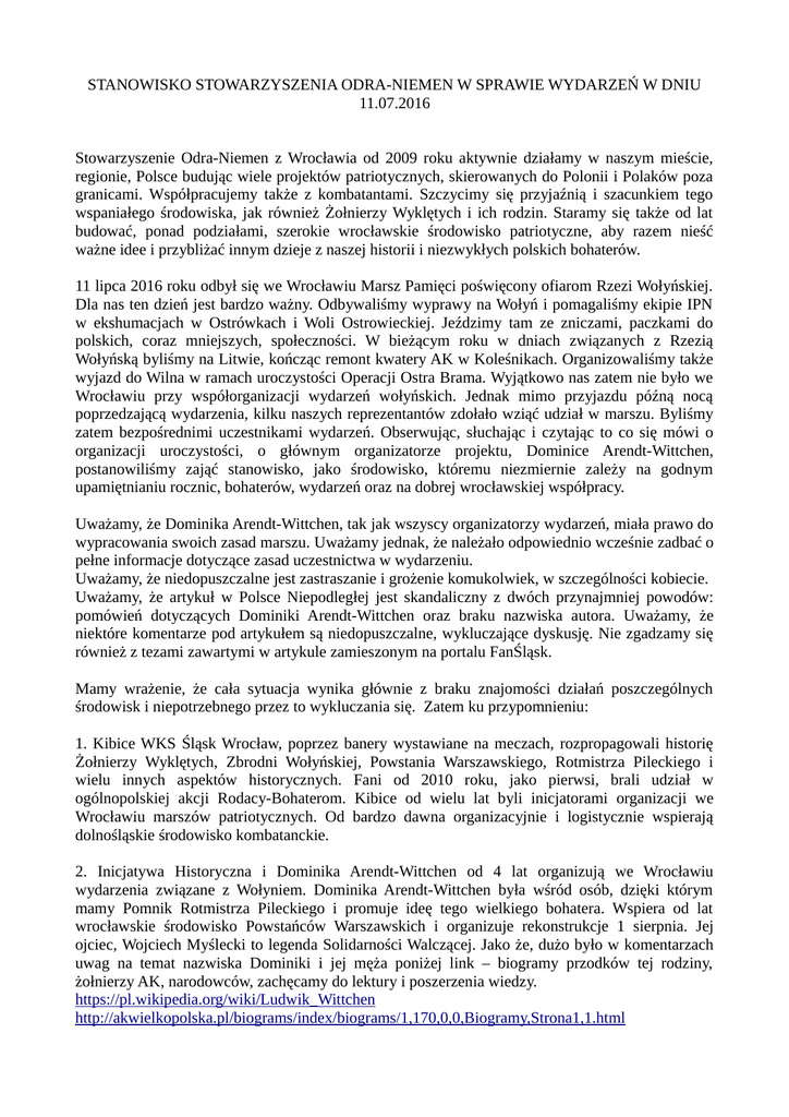 STANOWISKO STOWARZYSZENIA ODRA-NIEMEN W SPRAWIE WYDARZEŃ W DNIU 11.07.2016 Stowarzyszenie Odra-Niemen z Wrocławia od 2009 roku aktywnie działamy w naszym mieście, regionie, Polsce budując wiele projektów patriotycznych, skierowanych do Polonii i Polaków poza granicami. Współpracujemy także z kombatantami. Szczycimy się przyjaźnią i szacunkiem tego wspaniałego środowiska, jak również Żołnierzy Wyklętych i ich rodzin. Staramy się także od lat budować, ponad podziałami, szerokie wrocławskie środowisko patriotyczne, aby razem nieść ważne idee i przybliżać innym dzieje z naszej historii i niezwykłych polskich bohaterów. 11 lipca 2016 roku odbył się we Wrocławiu Marsz Pamięci poświęcony ofiarom Rzezi Wołyńskiej. Dla nas ten dzień jest bardzo ważny. Odbywaliśmy wyprawy na Wołyń i pomagaliśmy ekipie IPN w ekshumacjach w Ostrówkach i Woli Ostrowieckiej. Jeździmy tam ze zniczami, paczkami do polskich, coraz mniejszych, społeczności. W bieżącym roku w dniach związanych z Rzezią Wołyńską byliśmy na Litwie, kończąc remont kwatery AK w Koleśnikach. Organizowaliśmy także wyjazd do Wilna w ramach uroczystości Operacji Ostra Brama. Wyjątkowo nas zatem nie było we Wrocławiu przy współorganizacji wydarzeń wołyńskich. Jednak mimo przyjazdu późną nocą poprzedzającą wydarzenia, kilku naszych reprezentantów zdołało wziąć udział w marszu. Byliśmy zatem bezpośrednimi uczestnikami wydarzeń. Obserwując, słuchając i czytając to co się mówi o organizacji uroczystości, o głównym organizatorze projektu, Dominice Arendt-Wittchen, postanowiliśmy zająć stanowisko, jako środowisko, któremu niezmiernie zależy na godnym upamiętnianiu rocznic, bohaterów, wydarzeń oraz na dobrej wrocławskiej współpracy. Uważamy, że Dominika Arendt-Wittchen, tak jak wszyscy organizatorzy wydarzeń, miała prawo do wypracowania swoich zasad marszu. Uważamy jednak, że należało odpowiednio wcześnie zadbać o pełne informacje dotyczące zasad uczestnictwa w wydarzeniu. Uważamy, że niedopuszczalne jest zastraszanie i grożenie komukolwiek, w szczególności kobiecie. Uważamy, że artykuł w Polsce Niepodległej jest skandaliczny z dwóch przynajmniej powodów: pomówień dotyczących Dominiki Arendt-Wittchen oraz braku nazwiska autora. Uważamy, że niektóre komentarze pod artykułem są niedopuszczalne, wykluczające dyskusję. Nie zgadzamy się również z tezami zawartymi w artykule zamieszonym na portalu FanŚląsk. Mamy wrażenie, że cała sytuacja wynika głównie z braku znajomości działań poszczególnych środowisk i niepotrzebnego przez to wykluczania się. Zatem ku przypomnieniu: 1. Kibice WKS Śląsk Wrocław, poprzez banery wystawiane na meczach, rozpropagowali historię Żołnierzy Wyklętych, Zbrodni Wołyńskiej, Powstania Warszawskiego, Rotmistrza Pileckiego i wielu innych aspektów historycznych. Fani od 2010 roku, jako pierwsi, brali udział w ogólnopolskiej akcji Rodacy-Bohaterom. Kibice od wielu lat byli inicjatorami organizacji we Wrocławiu marszów patriotycznych. Od bardzo dawna organizacyjnie i logistycznie wspierają dolnośląskie środowisko kombatanckie. 2. Inicjatywa Historyczna i Dominika Arendt-Wittchen od 4 lat organizują we Wrocławiu wydarzenia związane z Wołyniem. Dominika Arendt-Wittchen była wśród osób, dzięki którym mamy Pomnik Rotmistrza Pileckiego i promuje ideę tego wielkiego bohatera. Wspiera od lat wrocławskie środowisko Powstańców Warszawskich i organizuje rekonstrukcje 1 sierpnia. Jej ojciec, Wojciech Myślecki to legenda Solidarności Walczącej. Jako że, dużo było w komentarzach uwag na temat nazwiska Dominiki i jej męża poniżej link – biogramy przodków tej rodziny, żołnierzy AK, narodowców, zachęcamy do lektury i poszerzenia wiedzy. https://pl.wikipedia.org/wiki/Ludwik_Wittchen http://akwielkopolska.pl/biograms/index/biograms/1,170,0,0,Biogramy,Strona1,1.html 3. ONR Brygada Dolnośląska wspiera środowisko kombatantów NSZ, stawia tablice, opiekuje się grobami żołnierzy, rozwozi paczki dla weteranów, bierze udział w patriotycznych wydarzeniach jako organizator lub wspierający działania wielu innych środowisk. Powyższe informacje wynikają z naszych doświadczeń współpracy. Nie ingerujemy w inne działania, poglądy, postawy, ale jest kilka spraw, łączących wiele wrocławskich środowisk. Znamy je i osoby z nich pochodzące, gdyż poznaliśmy się we wspólnej pracy. Mamy przekonanie, że zdobywając szacunek, poprzez swoja postawę i działania oraz w wielu miejscach pomoc wszystkim środowiskom w różnych działaniach, mamy prawo do apelu. Prosimy bardzo wszystkie strony o wzajemne przeproszenie się, wycofanie obraźliwych tekstów i komentarzy, próbę zrozumienia siebie, wytłumaczenia błędnych decyzji czy postaw. Stowarzyszenie Odra-Niemen od kilku dni poza Facebookiem stara się rozmawiać z każdą ze stron konfliktu, pomagamy w nawiązywaniu relacji pomiędzy stronami, próbujemy zorganizować spotkanie, aby razem uporządkować dalsze patriotyczne działania i wzajemne relacje. Wcześniej przesłaliśmy każdej ze stron wypracowane przez naszych członków stanowisko Stowarzyszenia Odra-Niemen. Złych słów, niedobrych emocji padło już zbyt dużo, teraz czas na wspólną rozmowę, poza internetem. Bardzo prosimy wszystkich o nieumieszczanie w internecie kolejnych wpisów i komentarzy na powyższy temat. Dla dobra nas wszystkich, ale głównie dla Tych, dla których wszyscy pracujemy, dla wrocławskich bohaterów i na rzecz narodowej pamięci historycznej. Stowarzyszenie Odra-Niemen było, jest i będzie organizacją, dla której autentycznie prawdziwa jest walka o pamięć historyczną. Słuchamy pokolenia bohaterów i stosujemy się do ich wskazań, dbamy o współpracę pomiędzy nami, jesteśmy lojalnymi partnerami i nikogo nigdy nie wykluczamy. Dalej będziemy ciężko pracować i pewnie sporo będzie nam się udawa