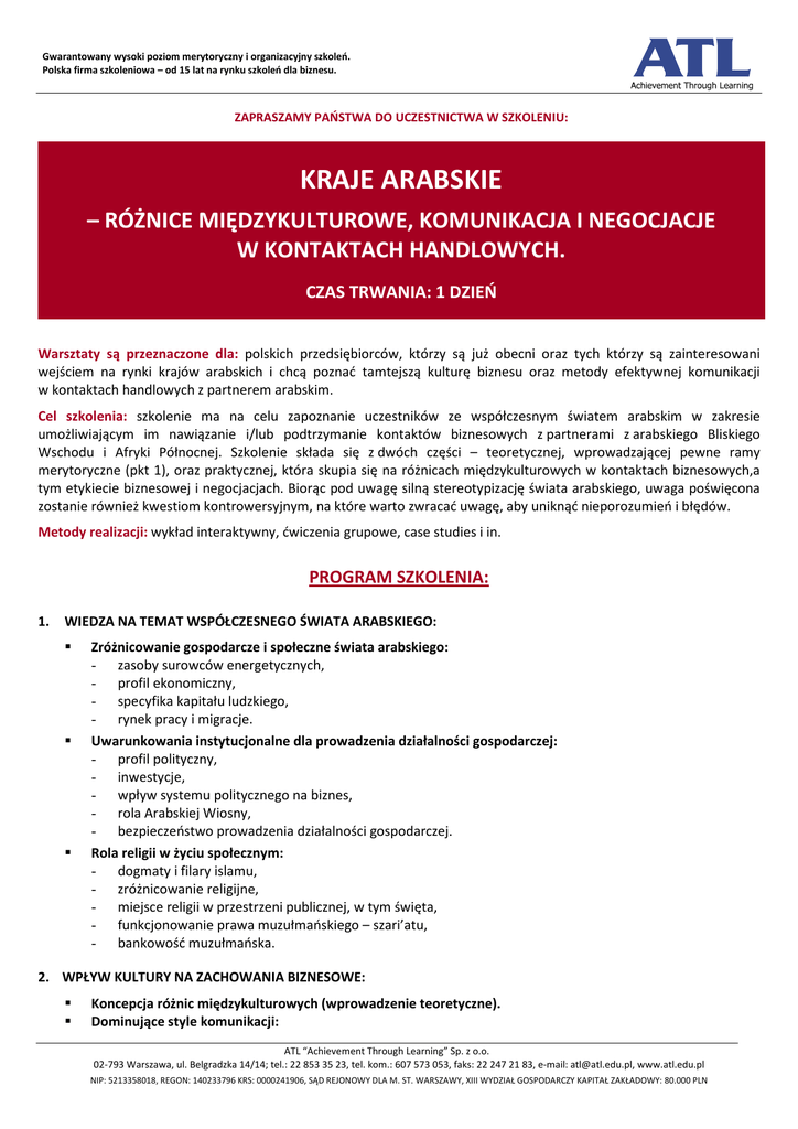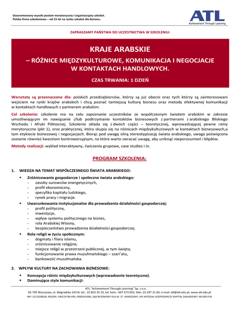 Gwarantowany wysoki poziom merytoryczny i organizacyjny szkoleń. Polska firma szkoleniowa – od 15 lat na rynku szkoleń dla biznesu. ZAPRASZAMY PAŃSTWA DO UCZESTNICTWA W SZKOLENIU: KRAJE ARABSKIE – RÓŻNICE MIĘDZYKULTUROWE, KOMUNIKACJA I NEGOCJACJE W KONTAKTACH HANDLOWYCH. CZAS TRWANIA: 1 DZIEŃ Warsztaty są przeznaczone dla: polskich przedsiębiorców, którzy są już obecni oraz tych którzy są zainteresowani wejściem na rynki krajów arabskich i chcą poznać tamtejszą kulturę biznesu oraz metody efektywnej komunikacji w kontaktach handlowych z partnerem arabskim. Cel szkolenia: szkolenie ma na celu zapoznanie uczestników ze współczesnym światem arabskim w zakresie umożliwiającym im nawiązanie i/lub podtrzymanie kontaktów biznesowych z partnerami z arabskiego Bliskiego Wschodu i Afryki Północnej. Szkolenie składa się z dwóch części – teoretycznej, wprowadzającej pewne ramy merytoryczne (pkt 1), oraz praktycznej, która skupia się na różnicach międzykulturowych w kontaktach biznesowych,a tym etykiecie biznesowej i negocjacjach. Biorąc pod uwagę silną stereotypizację świata arabskiego, uwaga poświęcona zostanie również kwestiom kontrowersyjnym, na które warto zwracać uwagę, aby uniknąć nieporozumień i błędów. Metody realizacji: wykład interaktywny, ćwiczenia grupowe, case studies i in. PROGRAM SZKOLENIA: 1. WIEDZA NA TEMAT WSPÓŁCZESNEGO ŚWIATA ARABSKIEGO: Zróżnicowanie gospodarcze i społeczne świata arabskiego: - zasoby surowców energetycznych, - profil ekonomiczny, - specyfika kapitału ludzkiego, - rynek pracy i migracje. Uwarunkowania instytucjonalne dla prowadzenia działalności gospodarczej: - profil polityczny, - inwestycje, - wpływ systemu politycznego na biznes, - rola Arabskiej Wiosny, - bezpieczeństwo prowadzenia działalności gospodarczej. Rola religii w życiu społecznym: - dogmaty i filary islamu, - zróżnicowanie religijne, - miejsce religii w przestrzeni publicznej, w tym święta, - funkcjonowanie prawa muzułmańskiego – szari’atu, - bankowość muzułmańska. 2. WPŁYW KULTURY NA ZACHOWANIA BIZNESOWE: Koncepcja różnic międzykulturowych (wprowadzenie teoretyczne). Dominujące style komunikacji: ATL “Achievement Through Learning” Sp. z o.o. 02-793 Warszawa, ul. Belgradzka 14/14; tel.: 22 853 35 23, tel. kom.: 607 573 053, faks: 22 247 21 83, e-mail: [email protected], www.atl.edu.pl NIP: 5213358018, REGON: 140233796 KRS: 0000241906, SĄD REJONOWY DLA M. ST. WARSZAWY, XIII WYDZIAŁ GOSPODARCZY KAPITAŁ ZAKŁADOWY: 80.000 PLN Gwarantowany wysoki poziom merytoryczny i organizacyjny szkoleń. Polska firma szkoleniowa – od 15 lat na rynku szkoleń dla biznesu. 3. - język arabski i jego rola w kulturze, - sposoby komunikowania, w tym rola figur retorycznych, - rola emocji i wysoki kontekst. Podejście do czasu i losu: - polichronoczność i jej wpływ na prowadzenie biznesu; rola losu (arab. kadar). Dystans władzy i symbole statusu: - wskaźniki hierarchiczności, - ceremonialność, - elementy etykiety biznesowej – formy grzecznościowe, podarunki, strój. Swoi i obcy: - typowe techniki negocjacyjne, - identyfikowanie partnerów do negocjacji - wasta (klientelizm). Elementy strategii reklamowych: - rola ikonoklazmu, - globalizacja, - cenzura. NA CO UWAŻAĆ? Determinizm kulturowy – czy wszyscy Arabowie są religijni? - pułapki postrzegania świata arabskiego – na co zwracać uwagę i czego unikać, - sposoby spędzania wolnego czasu, - Arab a muzułmanin. Krzywe zwierciadło orientalizmu – Zachód a świat arabski: - Arabowie o Zachodzie w świetle badań sondażowych, - rola wzajemnych stereotypów i uprzedzeń. Kobieta w arabskim świecie biznesu: - pozycja kobiet w islamie i w państwach arabskich, - postrzeganie kobiet zachodnich, - elementy ubioru, - rozdział płci i role społeczne związane z płcią. Alkohol i inne używki: - rodzaje dostępnych używek i ich funkcje społeczne, - zasady spożywania i niespożywania. ATL “Achievement Through Learning” Sp. z o.o. 02-793 Warszawa, ul. Belgradzka 14/14; tel.: 22 853 35 23, tel. kom.: 607 573 053, faks: 22 247 21 83, e-mail: [email protected], www.atl.edu.pl NIP: 5213358018, REGON: 140233796 KRS: 0000241906, SĄD REJONOWY DLA M. ST. WARSZAWY, XIII WYDZIAŁ GOSPODARCZY KAPITAŁ ZAKŁADOWY: 80.000 PLN Gwarantowany wysoki poziom merytoryczny i organizacyjny szkoleń. Polska firma szkoleniowa – od 15 lat na rynku szkoleń dla biznesu. KRAJE ARABSKIE - RÓŻNICE MIĘDZYKULTUROWE, KOMUNIKACJA I NEGOCJACJE W KONTAKTACH HANDLOWYCH. FORMULARZ ZAINTERESOWANIA: prosimy o przesłanie faksem (22) 247 21 83 lub mailem: [email protected] Jesteśmy zainteresowani zorganizowaniem szkolenia zamkniętego w naszej firmie dla grupy około ......................... osób Jesteśmy zainteresowani uczestnictwem w szkoleniu otwartym (proszę podać ilość osób) - .......................... zorganizowanym w mieście: Białystok Kraków Łódź Toruń Szczecin Gdańsk Kielce Poznań Warszawa inne ………… Katowice Lublin Rzeszów Wrocław Firma:........................................................................................................................................................................................................... Miejscowość: ............................................................................. ulica .......................................................................... kod ...................... Osoba kontaktowa: ...................................................................................... Stanowisko: ......................................................................... Kontakt e-mail: ............................................................................................. Kontakt telefoniczny: .......................................................... Wyrażamy zgodę na umieszczenie w bazie ATL danych osobowych zawartych w formularzu w celu realizacji niniejszego zgłoszenia or