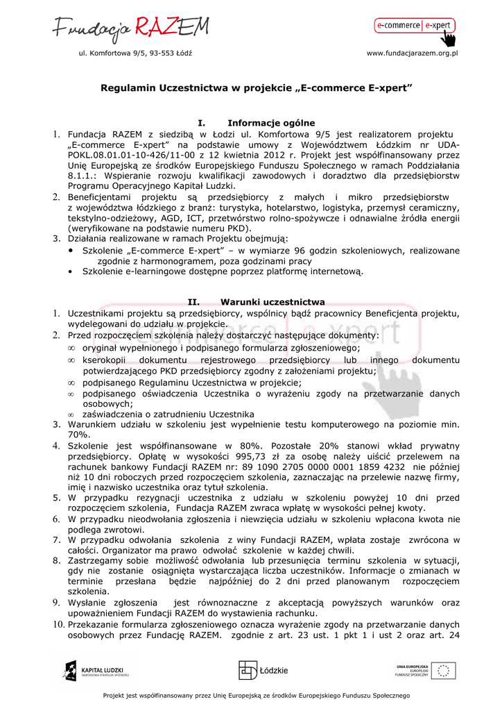 ul. Komfortowa 9/5, 93-553 Łódź www.fundacjarazem.org.pl Regulamin Uczestnictwa w projekcie „E-commerce E-xpert” I. Informacje ogólne 1. Fundacja RAZEM z siedzibą w Łodzi ul. Komfortowa 9/5 jest realizatorem projektu „E-commerce E-xpert” na podstawie umowy z Województwem Łódzkim nr UDAPOKL.08.01.01-10-426/11-00 z 12 kwietnia 2012 r. Projekt jest współfinansowany przez Unię Europejską ze środków Europejskiego Funduszu Społecznego w ramach Poddziałania 8.1.1.: Wspieranie rozwoju kwalifikacji zawodowych i doradztwo dla przedsiębiorstw Programu Operacyjnego Kapitał Ludzki. 2. Beneficjentami projektu są przedsiębiorcy z małych i mikro przedsiębiorstw z województwa łódzkiego z branż: turystyka, hotelarstwo, logistyka, przemysł ceramiczny, tekstylno-odzieżowy, AGD, ICT, przetwórstwo rolno-spożywcze i odnawialne źródła energii (weryfikowane na podstawie numeru PKD). 3. Działania realizowane w ramach Projektu obejmują: • Szkolenie „E-commerce E-xpert” – w wymiarze 96 godzin szkoleniowych, realizowane zgodnie z harmonogramem, poza godzinami pracy • Szkolenie e-learningowe dostępne poprzez platformę internetową. II. Warunki uczestnictwa 1. Uczestnikami projektu są przedsiębiorcy, wspólnicy bądź pracownicy Beneficjenta projektu, 2. 3. 4. 5. 6. 7. 8. 9. 10. wydelegowani do udziału w projekcie. Przed rozpoczęciem szkolenia należy dostarczyć następujące dokumenty: • oryginał wypełnionego i podpisanego formularza zgłoszeniowego; • kserokopii dokumentu rejestrowego przedsiębiorcy lub innego dokumentu potwierdzającego PKD przedsiębiorcy zgodny z założeniami projektu; • podpisanego Regulaminu Uczestnictwa w projekcie; • podpisanego oświadczenia Uczestnika o wyrażeniu zgody na przetwarzanie danych osobowych; • zaświadczenia o zatrudnieniu Uczestnika Warunkiem udziału w szkoleniu jest wypełnienie testu komputerowego na poziomie min. 70%. Szkolenie jest współfinansowane w 80%. Pozostałe 20% stanowi wkład prywatny przedsiębiorcy. Opłatę w wysokości 995,73 zł za osobę należy uiścić przelewem na rachunek bankowy Fundacji RAZEM nr: 89 1090 2705 0000 0001 1859 4232 nie później niż 10 dni roboczych przed rozpoczęciem szkolenia, zaznaczając na przelewie nazwę firmy, imię i nazwisko uczestnika oraz tytuł szkolenia. W przypadku rezygnacji uczestnika z udziału w szkoleniu powyżej 10 dni przed rozpoczęciem szkolenia, Fundacja RAZEM zwraca wpłatę w wysokości pełnej kwoty. W przypadku nieodwołania zgłoszenia i niewzięcia udziału w szkoleniu wpłacona kwota nie podlega zwrotowi. W przypadku odwołania szkolenia z winy Fundacji RAZEM, wpłata zostaje zwrócona w całości. Organizator ma prawo odwołać szkolenie w każdej chwili. Zastrzegamy sobie możliwość odwołania lub przesunięcia terminu szkolenia w sytuacji, gdy nie zostanie osiągnięta wystarczająca liczba uczestników. Informacje o zmianach w terminie przesłana będzie najpóźniej do 2 dni przed planowanym rozpoczęciem szkolenia. Wysłanie zgłoszenia jest równoznaczne z akceptacją powyższych warunków oraz upoważnieniem Fundacji RAZEM do wystawienia rachunku. Przekazanie formularza zgłoszeniowego oznacza wyrażenie zgody na przetwarzanie danych osobowych przez Fundację RAZEM. zgodnie z art. 23 ust. 1 pkt 1 i ust 2 oraz art. 24 Projekt jest współfinansowany przez Unię Europejską ze środków Europejskiego Funduszu Społecznego ul. Komfortowa 9/5, 93-553 Łódź www.fundacjarazem.org.pl ustawy z dnia 29.08.1997 o ochronie danych osobowych Dz. U. Nr 133 poz. 883. III. Obowiązki Realizatora Projektu 1. Realizator projektu zobowiązuje się do: • • • • • zorganizowania i przeprowadzenia zajęć zgodnie z programem i harmonogramem szkolenia, zapewnienia zaplecza lokalowego, technicznego i kadrowego zapewnienia materiałów dydaktycznych niezbędnych do realizacji projektu wyznaczenia dodatkowego terminu odrobienia zajęć w przypadku, gdy z powodu zdarzeń losowych zajęcia nie będą mogły odbyć się w przewidzianym terminie zapewnienia dostępu do materiałów dydaktycznych zamieszczonych na platformie internetowej w postaci loginu i hasła umożliwiających korzystanie z e-learningu przez 3 miesiące od aktywacji. IV. Obowiązki Uczestnika 1. Uczestnik projektu zobowiązuje się do: • regularnego, punktualnego i aktywnego uczestnictwa w zajęciach, potwierdzonego wpisem na listę obecności • aktywacji i korzystania z e-learningu w okresie jego dostępności • przystąpienia do sprawdzianów weryfikujących postępy w nauce w trakcie szkolenia • wypełniania, w trakcie i po zakończeniu szkolenia, ankiet ewaluacyjnych oceniających m.in. pracę trenerów, poziom kursu, jego organizację i wpływ na poziom uzyskanej wiedzy, kwalifikacji i umiejętności • udzielania informacji (na prośbę Organizatora projektu lub Instytucji Zarządzających Ministerstwo Rozwoju Regionalnego, Urząd Marszałkowski w Łodzi), w okresie projektu oraz po jego zakończeniu, związanych z uczestnictwem w projekcie • dostarczenia Organizatorowi na wezwanie dokumentów wymaganych przez Instytucje Zarządzające. 2. Uczestnik otrzymuje Certyfikat ukończenia szkolenia po pomyślnie zdanym egzaminie. V. Pomoc publiczna 1. Beneficjent oświadcza, iż ma świadomość, że jego osobisty udział lub udział jego pracowników w projekcie stanowi formę pomocy publicznej udzieloną Beneficjentowi. Pomoc ta zostanie udzielona wyłącznie przedsiębiorcom z mikro i małych przedsiębiorstw z woj. łódzkiego, po spełnieniu wszystkich warunków określonych w niniejszym Regulaminie. 2. Całkowity koszt uczestnictwa jednej osoby w projekcie wynosi 4.978,67 zł. 3. Beneficjenci objęci są dofinansowaniem w ramach pomocy publicznej w wysokości 80% w przypadku mikro i małych przedsiębiorstw. 4. Wkład prywatny Beneficjenta w przeliczeniu na jedną osobę (uczestnika szkolenia) wynosi: 995,73 zł (słownie: dziewięćset dziewięćdzies