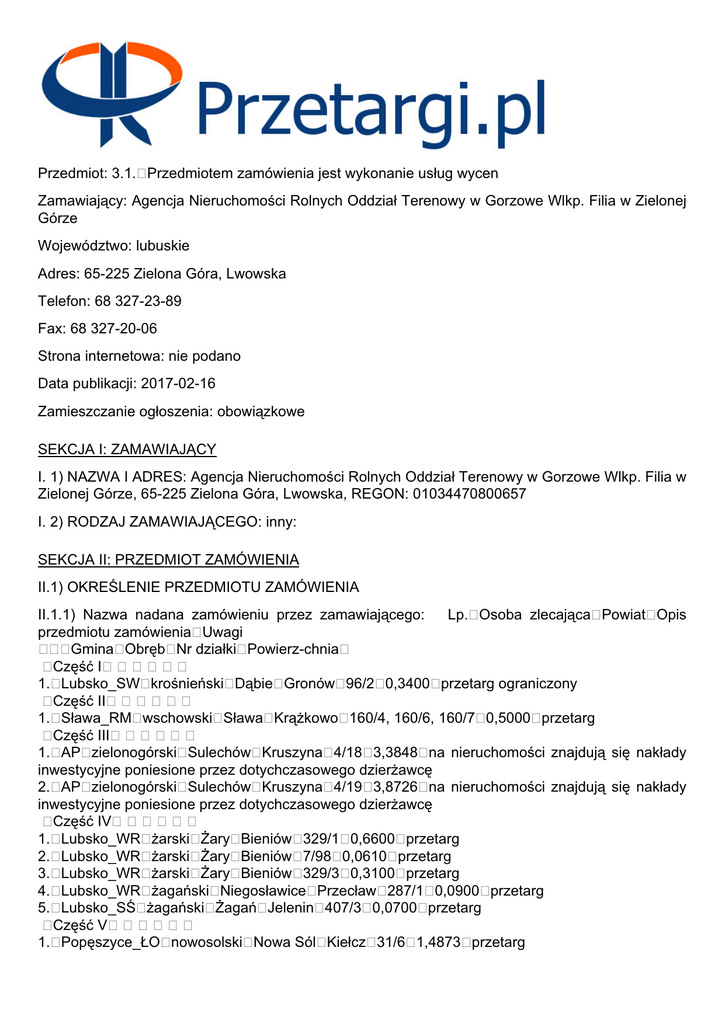 Przedmiot: 3.1. Przedmiotem zamówienia jest wykonanie usług wycen Zamawiający: Agencja Nieruchomości Rolnych Oddział Terenowy w Gorzowe Wlkp. Filia w Zielonej Górze Województwo: lubuskie Adres: 65-225 Zielona Góra, Lwowska Telefon: 68 327-23-89 Fax: 68 327-20-06 Strona internetowa: nie podano Data publikacji: 2017-02-16 Zamieszczanie ogłoszenia: obowiązkowe SEKCJA I: ZAMAWIAJĄCY I. 1) NAZWA I ADRES: Agencja Nieruchomości Rolnych Oddział Terenowy w Gorzowe Wlkp. Filia w Zielonej Górze, 65-225 Zielona Góra, Lwowska, REGON: 01034470800657 I. 2) RODZAJ ZAMAWIAJĄCEGO: inny: SEKCJA II: PRZEDMIOT ZAMÓWIENIA II.1) OKREŚLENIE PRZEDMIOTU ZAMÓWIENIA II.1.1) Nazwa nadana zamówieniu przez zamawiającego: Lp. Osoba zlecająca Powiat Opis przedmiotu zamówienia Uwagi Gmina Obręb Nr działki Powierz-chnia Część I 1. Lubsko_SW krośnieński Dąbie Gronów 96/2 0,3400 przetarg ograniczony Część II 1. Sława_RM wschowski Sława Krążkowo 160/4, 160/6, 160/7 0,5000 przetarg Część III 1. AP zielonogórski Sulechów Kruszyna 4/18 3,3848 na nieruchomości znajdują się nakłady inwestycyjne poniesione przez dotychczasowego dzierżawcę 2. AP zielonogórski Sulechów Kruszyna 4/19 3,8726 na nieruchomości znajdują się nakłady inwestycyjne poniesione przez dotychczasowego dzierżawcę Część IV 1. Lubsko_WR żarski Żary Bieniów 329/1 0,6600 przetarg 2. Lubsko_WR żarski Żary Bieniów 7/98 0,0610 przetarg 3. Lubsko_WR żarski Żary Bieniów 329/3 0,3100 przetarg 4. Lubsko_WR żagański Niegosławice Przecław 287/1 0,0900 przetarg 5. Lubsko_SŚ żagański Żagań Jelenin 407/3 0,0700 przetarg Część V 1. Popęszyce_ŁO nowosolski Nowa Sól Kiełcz 31/6 1,4873 przetarg 2. Popęszyce_ŁO nowosolski 3. Popęszyce_ŁO nowosolski 4. Popęszyce_ŁO nowosolski 5. Popęszyce_ŁO nowosolski 6. Popęszyce_ŁO nowosolski 7. Popęszyce_ŁO nowosolski 8. Popęszyce_ŁO nowosolski 364/9 0,6348 przetarg 9. Popęszyce_ŁO nowosolski Nowa Sól Nowa Sól Nowa Sól Nowa Sól Nowa Sól Nowa Sól Nowe Kiełcz 347/1, 362 0,9205 przetarg Kiełcz 396/2, 397/16, 397/21 0,7386 przetarg Kiełcz 383, 397/14 0,4573 przetarg Kiełcz 393 1,6226 przetarg Kiełcz 404/2 0,3020 przetarg Kiełcz 93/4, 93/5, 93/6 1,9156 przetarg Miasteczko Borów Wielki 364/6, 364/7, Nowa Sól Kiełcz 93/8, 92/8 0,6000 przetarg II.1.2) Rodzaj zamówienia: usługi II.1.3) Określenie przedmiotu oraz wielkości lub zakresu zamówienia: Lp. Osoba zlecająca Powiat Opis przedmiotu zamówienia Uwagi Gmina Obręb Nr działki Powierz-chnia Część I 1. Lubsko_SW krośnieński Dąbie Gronów 96/2 0,3400 przetarg ograniczony Część II 1. Sława_RM wschowski Sława Krążkowo 160/4, 160/6, 160/7 0,5000 przetarg Część III 1. AP zielonogórski Sulechów Kruszyna 4/18 3,3848 na nieruchomości znajdują się nakłady inwestycyjne poniesione przez dotychczasowego dzierżawcę 2. AP zielonogórski Sulechów Kruszyna 4/19 3,8726 na nieruchomości znajdują się nakłady inwestycyjne poniesione przez dotychczasowego dzierżawcę Część IV 1. Lubsko_WR żarski Żary Bieniów 329/1 0,6600 przetarg 2. Lubsko_WR żarski Żary Bieniów 7/98 0,0610 przetarg 3. Lubsko_WR żarski Żary Bieniów 329/3 0,3100 przetarg 4. Lubsko_WR żagański Niegosławice Przecław 287/1 0,0900 przetarg 5. Lubsko_SŚ żagański Żagań Jelenin 407/3 0,0700 przetarg Część V 1. Popęszyce_ŁO nowosolski Nowa Sól Kiełcz 31/6 1,4873 przetarg 2. Popęszyce_ŁO nowosolski Nowa Sól Kiełcz 347/1, 362 0,9205 przetarg 3. Popęszyce_ŁO nowosolski Nowa Sól Kiełcz 396/2, 397/16, 397/21 0,7386 przetarg 4. Popęszyce_ŁO nowosolski Nowa Sól Kiełcz 383, 397/14 0,4573 przetarg 5. Popęszyce_ŁO nowosolski Nowa Sól Kiełcz 393 1,6226 przetarg 6. Popęszyce_ŁO nowosolski Nowa Sól Kiełcz 404/2 0,3020 przetarg 7. Popęszyce_ŁO nowosolski Nowa Sól Kiełcz 93/4, 93/5, 93/6 1,9156 przetarg 8. Popęszyce_ŁO nowosolski Nowe Miasteczko Borów Wielki 364/6, 364/7, 364/9 0,6348 przetarg 9. Popęszyce_ŁO nowosolski Nowa Sól Kiełcz 93/8, 92/8 0,6000 przetarg II.1.4) Wspólny Słownik Zamówień (CPV): 71000000-8 II.1.5) Czy dopuszcza się złożenie oferty częściowej: II.1.6) Czy dopuszcza się złożenie oferty wariantowej: II.1.7) Czy przewiduje się udzielenie zamówień uzupełniających: SEKCJA III: INFORMACJE O CHARAKTERZE PRAWNYM, EKONOMICZNYM, FINANSOWYM I TECHNICZNYM III.1) WARUNKI DOTYCZĄCE ZAMÓWIENIA Informacja na temat wadium: III.2) WARUNKI UDZIAŁU Opis warunków udziału w postępowaniu oraz opis sposobu dokonywania oceny spełniania tych warunków: Informacja o oświadczeniach i dokumentach, jakie mają dostarczyć wykonawcy w celu potwierdzenia spełniania warunków udziału w postępowaniu: SEKCJA IV: PROCEDURA IV.1) TRYB UDZIELENIA ZAMÓWIENIA IV.1.1) Tryb udzielenia zamówienia: przetarg nieograniczony IV.2) KRYTERIA OCENY OFERT IV.2.1) Kryteria oceny ofert: IV.2.2) Wykorzystana będzie aukcja elektroniczna: nie IV.3) INFORMACJE ADMINISTRACYJNE IV.3.1) Adres strony internetowej, na której dostępna jest specyfikacja istotnych warunków zamówienia: IV.3.4) Termin składania wniosków o dopuszczenie do udziału w postępowaniu lub ofert: 2017-02-23 godzina: 9:00, miejsce: IV.3.5) Termin związania ofertą, okres w dniach: 30 (od ostatecznego terminu składania ofert)