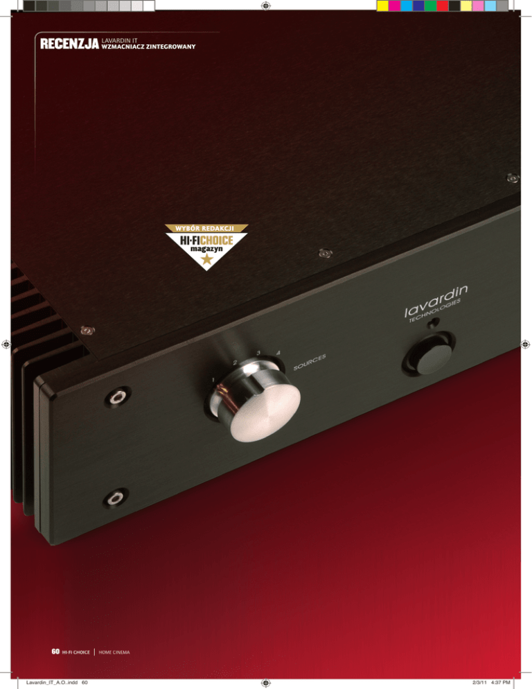 IT RECENZJA LAVARDIN WZMACNIACZ ZINTEGROWANY 60 HI-FI CHOICE Lavardin_IT_A.O..indd 60 | HOME CINEMA 2/3/11 4:37 PM LAVARDIN IT WZMACNIACZ ZINTEGROWANY Hi-end nie ma ceny! Lavardin IT to wyjątkowa konstrukcja, od wielu lat znajdująca się na szczycie oferty Francuzów statni test wzmacniacza Lavardin IS (zob. nr 03/2010 HFC&HC) okazał się niezwykle satysfakcjonujący. Ta elegancka i niepozorna integra, dysponująca mocą zaledwie 38W na kanał, klasą brzmienia dorównuje urządzeniom ze znacznie wyższego zakresu cenowego, ocierając się o hi-end – obszar, w którym bezkompromisowe rozwiązania i uzyskane efekty brzmieniowe są podyktowane bardziej twórczą pasją niż ceną. Wspomniany model IS pozostawił po sobie bardzo miłe wspomnienia, toteż wiadomość, że dane nam będzie przetestować znacznie droższą, topową integrę Francuzów bardzo nas ucieszyła. Firma Lavardin Technologies dosyć głośno i odważnie głosi tezę dotyczącą wyższości swoich wzmacniaczy nad produktami konkurencji – ma to przede wszystkim związek z odkryciem tzw. efektu zniekształceń pamięciowych (szerzej pisaliśmy o tym przy okazji testu modelu IS) i opracowaniem sposobu ich eliminacji. Otóż ślady pozostające w elementach półprzewodnikowych po przepłynięciu przez nie sygnału mogą powodować zniekształcenia stanowiące przeszkodę w uzyskaniu aksamitnego brzmienia o pięknej barwie, charakterystycznego przede wszystkim dla amplifikacji lampowych single-ended zrealizowanych na słynnych triodach 300B. Wzmacniacze lampowe mają jednak tendencję (w przeciwieństwie do konstrukcji tranzystorowych) do tworzenia wysokich zniekształceń harmonicznych. Zatem stworzenie wzmacniacza łączącego zalety półprzewodników (brak zniekształceń harmonicznych) i lamp (gładkie, aksamitne brzmienie), niebędącego przy tym konstrukcją hybrydową, a w 100% tranzystorową stało się „obsesją” Francuzów. Lavardin IT jest dużo większym i sprawniejszym wzmacniaczem od modelu IS – mimo iż dysponuje tylko nieco wyższą mocą, to jego wydajność prądowa jest znacznie większa. Poza tym model IT to zupełnie inna konstrukcja o topologii quasi dual-mono, dysponująca przede wszystkim wydajniejszym układem O zasilającym oraz bardziej rozbudowanymi końcówkami mocy. Budowa Model IT, choć gabarytami nie przypomina wielkich amerykańskich pieców, to klasą wykonania i wzornictwem nie odbiega od ogólnie przyjętych trendów wśród konstrukcji hi-endowych. Obudowę w dużej części wykonano z wysokiej jakości aluminium anodyzowanego na czarny mat. Przedni panel, jak i górna pokrywa są szczotkowane, a dobrego wrażenia dopełniają dwa pokrętła, obsługujące selektor źródeł i potencjometr, wykonane z wielką precyzją i starannością. Jako dyskretne elementy ozdobne zastosowano chromowane śruby na przednim panelu oraz te mocujące górną pokrywę. Tylny panel jest absolutnie minimalistyczny. Znajdziemy tam cztery wejścia liniowe, w tym jedno sprzężone z druga parą wyjść dla pętli magnetofonowej, oraz dosyć szeroko rozstawione terminale dla kabli głośnikowych (konstrukcja wymusza zachowanie jak największej odległości między elektroniką obsługującą lewy i prawy kanał). Z ciekawostek warto podkreślić, że Lavardin Technologies jako jedna z niewielu firm zwraca uwagę na właściwą polaryzację w linii zasilającej. Wyraźnie zaznaczono (czerwonym kolorem), do którego bolca gniazda IEC należy doprowadzić żyłę gorącą. Co ciekawe i godne uwagi, producent wyraźnie odradza stosowanie wszelkich urządzeń „uzdatniających” prąd, jak kondycjonery czy listwy sieciowe, uznając DETALE PRODUKT Lavardin IT RODZAJ Wzmacniacz zintegrowany CENA 26.250 zł WAGA 12 kg WYMIARY (SxWxG) 43x13,5x34 cm NAJWAŻNIEJSZE CECHY •Moc wyjściowa: 55Wx2 •Wejścia liniowe: 4 + pętla magnetofonowa •Zniekształcenia harmoniczne: 0,001% przy mocy maks. •Pobór mocy: 35W w stanie spoczynku; 400W maks. DYSTRYBUCJA Moje Audio www.mojeaudio.pl RECENZJA że wzmacniacz zadowoli się prądem prosto z gniazdka w ścianie. I tak właśnie zrobiliśmy podczas testów, korzystając z dedykowanego kabla zasilającego Lavardin CMR. Zresztą podobnie wygląda sytuacja z właściwym „miejscem spoczynku” wzmacniacza – zdaniem producenta IT najlepiej poradzi sobie z eliminacją wibracji, jeśli postawimy go na drewnianej komodzie bądź stoliku ze sklejki. Widocznie gumowe nóżki, na których opiera się obudowa, oraz badania w zakresie tłumienia drgań określiły jednoznacznie, jakie rozwiązanie jest najkorzystniejsze. Jeśli chodzi o budowę wewnętrzną, to mamy do czynienia z niepełną konstrukcją dual-mono, dysponującą jednym transformatorem będącym źródłem prądu dla obydwu końcówek mocy. Sporej wielkości toroid zamknięto wraz z układami filtrującymi prąd w aluminiowej puszce będącej jednocześnie skutecznie działającym ekranem, chroniącym pozostałą elektronikę przed oddziaływaniem pola magnetycznego. Dalszą część układu zasilania rozplanowano na wspólnej płytce drukowanej, a w jej obrębie znalazły się elementy filtrujące prąd podzielone już na dwie niezależne gałęzie dla obydwu kanałów. Znalazły się tam po cztery kondensatory BC Component (każdy o pojemności 10.000μF) na kanał oraz mniejsze pojemności filtrujące na selekcjonowanych elektrolitach Nichicona dla pozostałych elementów aktywnych w torze sygnałowym. Selektor źródeł zbudowano na bazie mechanicznego przełącznika sterującego wysokiej klasy przekaźnikami Finder z pozłacanymi stykami. Sygnał biegnie bezpośrednio do potencjometru Alps, a stamtąd ekranowanymi odcinkami trafia na płytki drukowane po lewej i prawej stronie, przymocowane do masywnych aluminiowych radiatorów stanowiących jednocześnie ścianki boczne obudowy. Lavardin Technologies pilnie strzeże tajemnicy swoich konstrukcji, toteż wszystkie aktywne elementy pracujące we ws