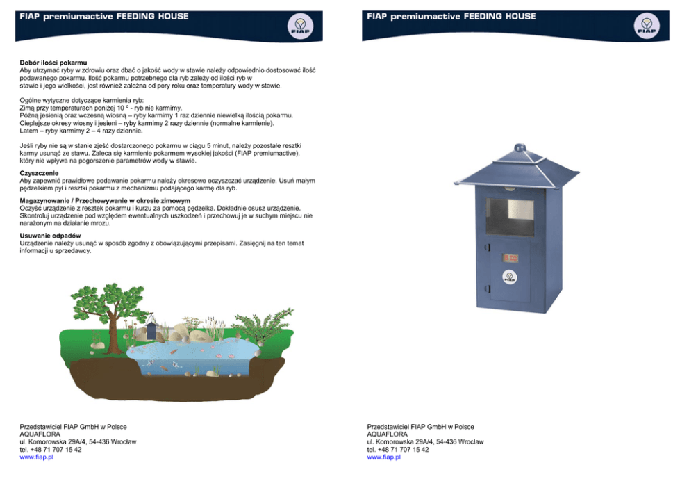 FIAP premiumactive FEEDING HOUSE FIAP premiumactive FEEDING HOUSE Dobór ilości pokarmu Aby utrzymać ryby w zdrowiu oraz dbać o jakość wody w stawie należy odpowiednio dostosować ilość podawanego pokarmu. Ilość pokarmu potrzebnego dla ryb zależy od ilości ryb w stawie i jego wielkości, jest również zależna od pory roku oraz temperatury wody w stawie. Ogólne wytyczne dotyczące karmienia ryb: Zimą przy temperaturach poniżej 10 º - ryb nie karmimy. Późną jesienią oraz wczesną wiosną – ryby karmimy 1 raz dziennie niewielką ilością pokarmu. Cieplejsze okresy wiosny i jesieni – ryby karmimy 2 razy dziennie (normalne karmienie). Latem – ryby karmimy 2 – 4 razy dziennie. Jeśli ryby nie są w stanie zjeść dostarczonego pokarmu w ciągu 5 minut, należy pozostałe resztki karmy usunąć ze stawu. Zaleca się karmienie pokarmem wysokiej jakości (FIAP premiumactive), który nie wpływa na pogorszenie parametrów wody w stawie. Czyszczenie Aby zapewnić prawidłowe podawanie pokarmu należy okresowo oczyszczać urządzenie. Usuń małym pędzelkiem pył i resztki pokarmu z mechanizmu podającego karmę dla ryb. Magazynowanie / Przechowywanie w okresie zimowym Oczyść urządzenie z resztek pokarmu i kurzu za pomocą pędzelka. Dokładnie osusz urządzenie. Skontroluj urządzenie pod względem ewentualnych uszkodzeń i przechowuj je w suchym miejscu nie narażonym na działanie mrozu. Usuwanie odpadów Urządzenie należy usunąć w sposób zgodny z obowiązującymi przepisami. Zasięgnij na ten temat informacji u sprzedawcy. Przedstawiciel FIAP GmbH w Polsce AQUAFLORA ul. Komorowska 29A/4, 54-436 Wrocław tel. +48 71 707 15 42 www.fiap.pl Przedstawiciel FIAP GmbH w Polsce AQUAFLORA ul. Komorowska 29A/4, 54-436 Wrocław tel. +48 71 707 15 42 www.fiap.pl FIAP premiumactive FEEDING HOUSE Wybór lokalizacji instalacji podajnika pokarmu Istnieje wiele sposobów montaży podajnika. Przy montażu należy pamiętać aby zapewnić wygodny dostęp do urządzenia oraz swobodny montaż górnej pokrywy pojemnika na paszę. Zwróć również uwagę na to by pokarm był dostarczany w miejsce, w którym ryby mogą swobodnie go zjeść. Instalacja baterii zasilających Otwórz pokrywę sterownika i baterii. Włóż baterie stosując się do opisanej polaryzacji (+ i -). Do zasilania urządzenia niezbędne są dwie baterie alkaliczne 1,5 V typu C (R14) – nie używaj akumulatorów. Jeśli w lewej części wyświetlacza widoczny jest symbol „LO” oznacza to konieczność wymiany baterii na nowe. Wymiana baterii powinna nastąpić najpóźniej w ciągu 2 dni. W warunkach testowych urządzenie pracowało na jednym komplecie baterii 3 miesiące. Czas pracy urządzenia może się skrócić ze względu na oddziaływanie niskiej temperatury otoczenia oraz może być zależny od rodzaju zastosowanych baterii. Ustawienie aktualnej godziny Naciśnij przycisk „MODE” a następnie przycisk „SET”. Ustaw godzinę za pomocą przycisku „+”. Naciśnij przycisk „SET”. Ustaw minuty za pomocą przycisku „+”. Potwierdź ustawienie naciskając ponownie przycisk „SET”. Ustawienie czasu karmienia Dla każdego czasu karmienia może być ustalona ilość używanej paszy (15g lub 30g). W zależności od ilości ryb w stawie, można przypisać każdej porze karmienia podanie pokarmu po raz drugi – w tym celu wybierz (↓ 1 lub 1 ↓↓). Odstęp pomiędzy pierwszym (↓ 1) i drugim (1 ↓↓) karmieniem o jednej ustalonej porze wynosi 1 minutę. Aby ustawić porę karmienia naciśnij przycisk „MODE”. Na wyświetlaczy pojawi się czas 00:00 oraz numer 1 w górnej części wyświetlacza. Naciśnij przycisk „SET” – godziny zaczną migać. Za pomocą przycisku „+” ustaw godzinę karmienia. Naciśnij przycisk „SET” – minuty zaczną migać. Za pomocą przycisku „+” ustaw minuty. Naciśnij przycisk „SET” – numer 1 w górnej części wyświetlacza zacznie migać. Naciskając przycisk „+” wybierz ilość podawanej karmy (↓ 1 lub 1 ↓↓). Naciśnij przycisk „MODE” aby ustawić czas kolejnego karmienia. Aby zakończyć programowanie naciśnij ponownie przycisk „MODE”. W celu ustawienia kolejnych czasów karmienia (2-4) należy postępować dokładnie tak jak przy programowaniu pierwszego karmienia. Aby sprawdzić i skorygować czasy karmienia naciśnij przycisk „MODE”. Na wyświetlaczu pojawią się kolejno czasy karmienia. Aby skorygować czas karmienia postępuj dokładnie tak jak przy programowaniu. Jeśli podczas programowania czasów karmienia nie zostanie naciśnięty żaden przycisk w ciągu 5 minut, sterownik automatycznie zakończy proces programowania zapisując wszystkie ustawione czasy karmienia. Przedstawiciel FIAP GmbH w Polsce AQUAFLORA ul. Komorowska 29A/4, 54-436 Wrocław tel. +48 71 707 15 42 www.fiap.pl FIAP premiumactive FEEDING HOUSE Przedmowa do instrukcji obsługi Przed pierwszym użyciem należy przeczytać instrukcję obsługi i dokładnie zapoznać się z urządzeniem. Należy bezwzględnie przestrzegać przepisów bezpieczeństwa pracy w odniesieniu do prawidłowego i bezpiecznego użytkowania. Zastosowanie zgodne z przeznaczeniem FIAP premiumactive FEEDING HOUSE – zwany dalej urządzeniem – jest przeznaczony wyłącznie do karmienia ryb. Urządzenie zaprojektowane jest do karmienia ryb stawowych od 1 do 4 razy wciągu doby w określonych godzinach i podaje stałą porcję pokarmu automatycznie. Regularne karmienie jest kluczem do zdrowego i długiego życia ryb. Zastosowanie niezgodne z przeznaczeniem W razie zastosowania niezgodnego z przeznaczeniem lub niewłaściwej obsługi, urządzenie to może być źródłem zagrożenia dla ludzi. W przypadku zastosowania niezgodnego z przeznaczeniem wygasa prawo do roszczeń z tytułu gwarancji producenta, a także traci swoją moc ogólne dopuszczenie do użytkowania. Oświadczenie producenta dotyczące CE W myśl przepisów UE, producent oświadcza zgodność wy