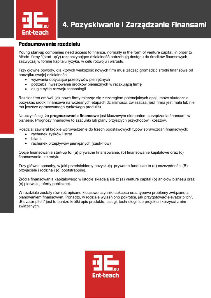 4. Pozyskiwanie i Zarządzanie Finansami Podsumowanie rozdziału Young start-up companies need access to finance, normally in the form of venture capital, in order to Młode firmy *(start-up'y) rozpoczynające działalność potrzebują dostępu do środków finansowych, zazwyczaj w formie kapitału ryzyka, w celu rozwoju i wzrostu. Trzy główne powody, dla których większość nowych firm musi zacząć gromadzić środki finansowe od początku swojej działalności: • wyzwania dotyczące przepływów pieniężnych • potrzeba inwestowania środków pieniężnych w raczkującą firmę • długie cykle rozwoju technologii Rozdział ten omówił, jak nowe firmy mierząc się z szeregiem potencjalnych opcji, może skutecznie pozyskać środki finansowe na wczesnych etapach działalności, zwłaszcza, jeśli firma jest mała lub nie ma jeszcze opracowanego rynkowego produktu. Nauczyłeś się, że prognozowanie finansowe jest kluczowym elementem zarządzania finansami w biznesie. Prognozy finansowe to szacunki lub plany przyszłych przychodów i kosztów. Rozdział zawierał krótkie wprowadzenie do trzech podstawowych typów sprawozdań finansowych: • rachunek zysków i strat • bilans • rachunek przepływów pieniężnych (cash-flow) Opcje finansowania start-up to: (a) prywatne finansowanie, (b) finansowanie kapitałowe oraz (c) finansowanie z kredytu. Trzy główne sposoby, w jaki przedsiębiorcy pozyskują prywatne fundusze to (a) oszczędności (B) przyjaciele i rodzina i (c) bootstrapping. Źródła finansowania kapitałowego w istocie składają się z: (a) venture capital (b) aniołów biznesu oraz (c) pierwszej oferty publicznej. W rozdziale zostały również opisane kluczowe czynniki sukcesu oraz typowe problemy związane z planowaniem finansowym. Ponadto, w rodziale wyjaśniono pokrótce, jak przygotować”elevator pitch”. „Elevator pitch” jest to bardzo krótki opis produktu, usługi, technologii lub projektu i korzyści z nim związanych.