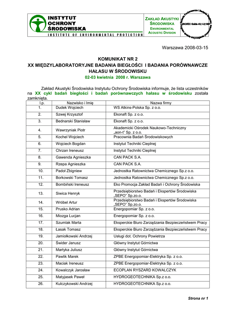 ZAKŁAD AKUSTYKI ŚRODOWISKA ENVIRONMENTAL ACOUSTIC DIVISION Warszawa 2008-03-15 KOMUNIKAT NR 2 XX MIĘDZYLABORATORYJNE BADANIA BIEGŁOŚCI I BADANIA PORÓWNAWCZE HAŁASU W ŚRODOWISKU 02-03 kwietnia 2008 r. Warszawa Zakład Akustyki Środowiska Instytutu Ochrony Środowiska informuje, Ŝe lista uczestników na XX cykl badań biegłości i badań porównawczych hałasu w środowisku została zamknięta. l.p. 1. Nazwisko i Imię Dudek Wojciech Nazwa firmy WS Atkins-Polska Sp. z o.o. 2. Szwej Krzysztof Ekonaft Sp. z o.o. 3. Bednarski Stanisław Ekonaft Sp. z o.o. 4. Wawrzyniak Piotr 5. Kochel Wojciech Akademicki Ośrodek Naukowo-Techniczny „aon-t” Sp. z o.o. Pracownia Badań Środowiskowych 6. Wojciech Bogdan Instytut Techniki Cieplnej 7. Chrzan Ireneusz Instytut Techniki Cieplnej 8. Gawenda Agnieszka CAN PACK S.A. 9. Rzepa Agnieszka CAN PACK S.A. 10. Padoł Zbigniew Jednostka Ratownictwa Chemicznego Sp.z o.o. 11. Borkowski Tomasz Jednostka Ratownictwa Chemicznego Sp.z o.o. 12. Bombiński Ireneusz Eko Promocja Zakład Badań i Ochrony Środowiska 13. Siwica Henryk 14. Wróbel Artur 15. Prusko Adrian Przedsiębiorstwo Badań i Ekspertów Środowiska „SEPO” Sp.zo.o. Przedsiębiorstwo Badań i Ekspertów Środowiska „SEPO” Sp.zo.o. Energopomiar Sp. z o.o. 16. Miozga Lucjan Energopomiar Sp. z o.o. 17. Szumlak Marta Eksperckie Biuro Zarządzania Bezpieczeństwem Pracy 18. Łasak Tomasz Eksperckie Biuro Zarządzania Bezpieczeństwem Pracy 19. Jamiołkowski Andrzej Usługi dot. Ochrony Powietrza 20. Świder Janusz Główny Instytut Górnictwa 21. Martyka Juliusz Główny Instytut Górnictwa 22. Pawlik Marek ZPBE Energopomiar-Elektryka Sp. z o.o. 23. Maciak Ireneusz ZPBE Energopomiar-Elektryka Sp. z o.o. 24. Kowalczyk Jarosław ECOPLAN RYSZARD KOWALCZYK 25. Matyjasek Paweł HYDROGEOTECHNIKA Sp.z o.o. 26. Kulczykowski Andrzej HYDROGEOTECHNIKA Sp.z o.o. Strona nr 1 ZAKŁAD AKUSTYKI ŚRODOWISKA ENVIRONMENTAL ACOUSTIC DIVISION 27. Centner Joanna O.B.P.P.i W.O.Ś i B „OIKOS” Sp. z o.o. 28. Hilszer Piotr HYDROACUSTIC PIOTR HILSZER 29. Gołębiewski Zbigniew HYDROACUSTIC PIOTR HILSZER 30. Grochocki Ryszard EKOPERFEX s.c. 31. Zasztoft Jarosław EKOPERFEX s.c. 32. Frańczak Jerzy „SECURA” Zakład Ochrony Środowiska 33. Fidelus Jan P.I.O.Ś. „EKOTEST” 34. Masłowski Andrzej P.I.O.Ś. „EKOTEST” 35. Artur Szymański Towarzystwo WIR s.c. 36. Maciejko Waldemar EkoNorm Sp. z o.o. 37. Zapart Łukasz EkoNorm Sp. z o.o. 38. Broszkiewicz Aleksander PPHU „BM-EKOS” Sp. z o.o. 39. Ziemkiewicz Marcin Laboratorium Badawcze- BLACHOWNIA Sp.z o.o. 40. Kubiak Mateusz LABOTEST – Laboratorium Analiz Fizykochemicznych 41. Pacholczyk Piotr LABOTEST – Laboratorium Analiz Fizykochemicznych Lista uczestników XX badań biegłości została zamknięta. Podział na zespoły ćwiczące i harmonogram ćwiczenia zostanie podany w kolejnym komunikacie nr 3, podobnie jak dalsze szczegóły organizacyjne ćwiczenia. Prosimy uczestników o potwierdzenie pocztą elektroniczną poprawności zapisu swoich danych na zamkniętej liście ćwiczenia. Organizator nie przewiduje moŜliwości udziału w ćwiczeniu osób z zewnątrz lub osób nie objętych programem badania biegłości i nie zarejestrowanych na ćwiczeniu. Organizator nie zapewnia noclegu ani wyŜywienia za wyjątkiem kawy, herbaty i wody w trakcie prowadzenia ćwiczeń oraz ciepłego posiłku typu obiadowego w godzinach 14.00 – 16.00. Pozostałe informacje zostaną zamieszczone w kolejnych komunikatach. Informacji nt. porównań międzylaboratoryjnych udziela się: w sprawach merytorycznych pod nr tel. 022 832 39 66: mgr Zbigniew Szymański oraz pracownicy Zakładu Akustyki Środowiska IOŚ, w sprawach organizacyjnych pod nr tel/fax. 022 833 42 41 lub 022 833 42 42 : Pani Renata Parvi lub inŜ. Mariusz Truszkowski. Badania interkalibracyjne, z uwagi na swą specyfikę realizacji pomiarów w przestrzeni otwartej (środowisku), odbędą się w planowanym terminie jedynie w sprzyjających warunkach atmosferycznych. W wypadku złych warunków atmosferycznych nastąpi przesunięcie terminu. Nowy, rezerwowy termin ćwiczenia zostanie ustalony w komunikacie podanym do dnia 28.03.2008 Strona nr 2