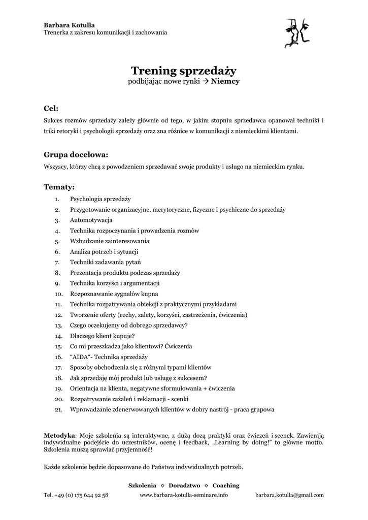 Barbara Kotulla Trenerka z zakresu komunikacji i zachowania Trening sprzedaży podbijając nowe rynki Niemcy Cel: Sukces rozmów sprzedaży zależy głównie od tego, w jakim stopniu sprzedawca opanował techniki i triki retoryki i psychologii sprzedaży oraz zna różnice w komunikacji z niemieckimi klientami. Grupa docelowa: Wszyscy, którzy chcą z powodzeniem sprzedawać swoje produkty i usługo na niemieckim rynku. Tematy: 1. Psychologia sprzedaży 2. Przygotowanie organizacyjne, merytoryczne, fizyczne i psychiczne do sprzedaży 3. Automotywacja 4. Technika rozpoczynania i prowadzenia rozmów 5. Wzbudzanie zainteresowania 6. Analiza potrzeb i sytuacji 7. Techniki zadawania pytań 8. Prezentacja produktu podczas sprzedaży 9. Technika korzyści i argumentacji 10. Rozpoznawanie sygnałów kupna 11. Technika rozpatrywania obiekcji z praktycznymi przykładami 12. Tworzenie oferty (cechy, zalety, korzyści, zastrzeżenia, ćwiczenia) 13. Czego oczekujemy od dobrego sprzedawcy? 14. Dlaczego klient kupuje? 15. Co mi przeszkadza jako klientowi? Ćwiczenia 16. “AIDA“- Technika sprzedaży 17. Sposoby obchodzenia się z różnymi typami klientów 18. Jak sprzedaję mój produkt lub usługę z sukcesem? 19. Orientacja na klienta, negatywne sformułowania + ćwiczenia 20. Rozpatrywanie zażaleń i reklamacji - scenki 21. Wprowadzanie zdenerwowanych klientów w dobry nastrój - praca grupowa Metodyka: Moje szkolenia są interaktywne, z dużą dozą praktyki oraz ćwiczeń i scenek. Zawierają indywidualne podejście do uczestników, ocenę i feedback, „Learning by doing!” to główne motto. Szkolenia muszą sprawiać przyjemność! Każde szkolenie będzie dopasowane do Państwa indywidualnych potrzeb. Szkolenia ◊ Doradztwo ◊ Coaching Tel. +49 (0) 175 644 92 58 www.barbara-kotulla-seminare.info [email protected]