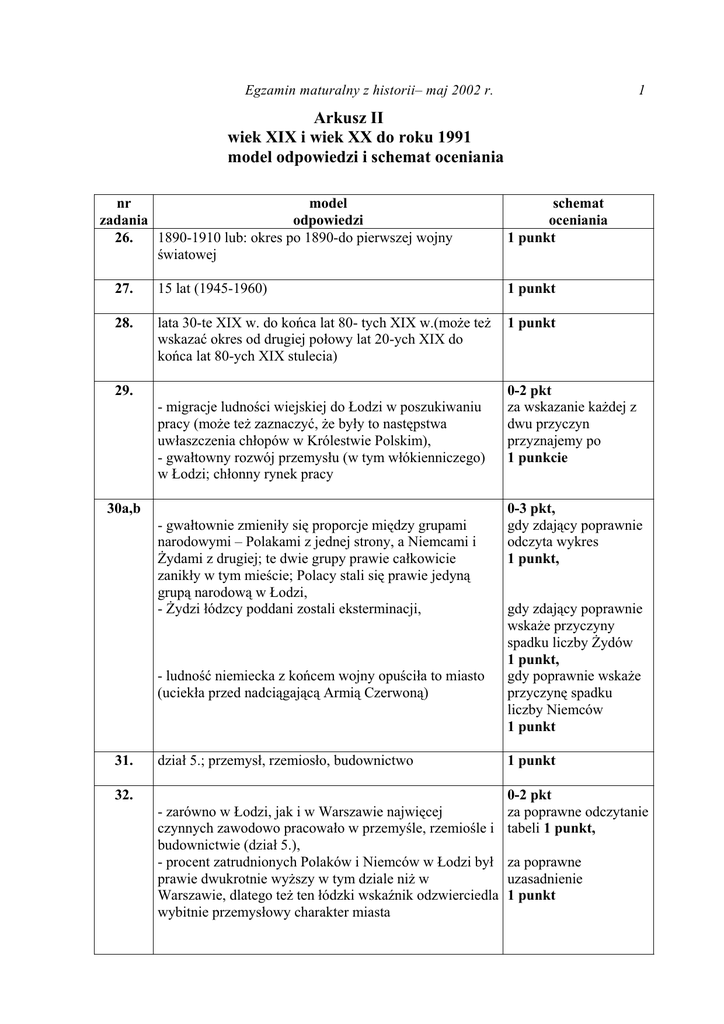 Egzamin maturalny z historii– maj 2002 r. 1 Arkusz II wiek XIX i wiek XX do roku 1991 model odpowiedzi i schemat oceniania nr model zadania odpowiedzi 26. 1890-1910 lub: okres po 1890-do pierwszej wojny wiatowej schemat oceniania 1 punkt 27. 15 lat (1945-1960) 1 punkt 28. lata 30-te XIX w. do koñca lat 80- tych XIX w.(mo¿e te¿ wskazaæ okres od drugiej po³owy lat 20-ych XIX do koñca lat 80-ych XIX stulecia) 1 punkt 29. 30a,b - migracje ludnoci wiejskiej do £odzi w poszukiwaniu pracy (mo¿e te¿ zaznaczyæ, ¿e by³y to nastêpstwa uw³aszczenia ch³opów w Królestwie Polskim), - gwa³towny rozwój przemys³u (w tym w³ókienniczego) w £odzi; ch³onny rynek pracy - gwa³townie zmieni³y siê proporcje miêdzy grupami narodowymi – Polakami z jednej strony, a Niemcami i ¯ydami z drugiej; te dwie grupy prawie ca³kowicie zanik³y w tym miecie; Polacy stali siê prawie jedyn¹ grup¹ narodow¹ w £odzi, - ¯ydzi ³ódzcy poddani zostali eksterminacji, - ludnoæ niemiecka z koñcem wojny opuci³a to miasto (uciek³a przed nadci¹gaj¹c¹ Armi¹ Czerwon¹) 31. 32. dzia³ 5.; przemys³, rzemios³o, budownictwo - zarówno w £odzi, jak i w Warszawie najwiêcej czynnych zawodowo pracowa³o w przemyle, rzemiole i budownictwie (dzia³ 5.), - procent zatrudnionych Polaków i Niemców w £odzi by³ prawie dwukrotnie wy¿szy w tym dziale ni¿ w Warszawie, dlatego te¿ ten ³ódzki wskanik odzwierciedla wybitnie przemys³owy charakter miasta 0-2 pkt za wskazanie ka¿dej z dwu przyczyn przyznajemy po 1 punkcie 0-3 pkt, gdy zdaj¹cy poprawnie odczyta wykres 1 punkt, gdy zdaj¹cy poprawnie wska¿e przyczyny spadku liczby ¯ydów 1 punkt, gdy poprawnie wska¿e przyczynê spadku liczby Niemców 1 punkt 1 punkt 0-2 pkt za poprawne odczytanie tabeli 1 punkt, za poprawne uzasadnienie 1 punkt 2 Egzamin maturalny z historii– maj 2002 r. 33. 34a,b wysoki udzia³ wszystkich zawodowo czynnych ¯ydów w handlu (mo¿e cytowaæ dane: w obu miastach odpowiednio: 28,6% i 29,4%) - wysoki udzia³ wszystkich zawodowo czynnych Rosjan w wojsku (w obu miastach odpowiednio 64,4% i 65,6%) - spowodowane to by³o sytuacj¹ polityczn¹ w Królestwie Polskim; zabór rosyjski; czêæ Imperium Rosyjskiego; zachodnie rubie¿e pañstwa rosyjskiego - militaryzacja kraju, po powstaniu styczniowym 35. 1. specyficzny uk³ad urbanistyczny miasta, jedna g³ówna o miasta [ul. Piotrkowska], 2. wyranie wyodrêbnione dzielnice fabryczne, 3. rozmiary zabudowy fabrycznej, 4. typ rezydencji bur¿uazji ³ódzkiej [pa³ace, wille], 5. nowoczesna infrastruktura miejska [tramwaje elektryczne], 6. wyj¹tkowe miejsce wypoczynku [zwierzyniec], 7. wystêpuj¹cy w ca³ym miecie [³¹cznie z cmentarzami] kontrast miedzy bogactwem a nêdz¹; 1 punkt 0-3 pkt, gdy odczyta poprawnie tabelê 1 punkt, gdy poda trafnie ogóln¹ przyczynê przyznajemy 1 punkt, gdy odniesie siê do sytuacji po powstaniu styczniowym 1 punkt 0-5 pkt za poprawne wskazanie jednej cechy, 1 punkt 36. ³ódzkie cmentarze odwzorowywa³y zró¿nicowanie spo³eczne [i maj¹tkowe] mieszkañców tego miasta 1 punkt 37. przemys³ 1 punkt podobieñstwo: Reymont opisuj¹c architekturê miasta [Piotrkowskiej], podobnie jak autor Przewodnika, dostrzeg³ ró¿nice spo³eczne ( wiat ³ódzkich kontrastów); 0-6 pkt za dostrze¿enie podobieñstw miêdzy tekstami [³ódzkie kontrasty] 2 punkty, 38. ró¿nice: - w ródle E (przewodnik) przewa¿a fascynacja miastem przemys³owym i jego specyfik¹, - Reymont oceni³ miasto krytycznie, - Reymont zanalizowa³ ironicznie nowobogack¹ architekturê pa³aców i kamienic Piotrkowskiej; za dostrze¿enie fascynacji w ródle E 2 punkty, za dostrze¿enie krytycyzmu Reymonta 1 punkt oraz za dostrze¿enie ironii 1 punkt Egzamin maturalny z historii– maj 2002 r. 39. 3 - Królestwo Polskie (w tym £ód) by³o jednym z najwa¿niejszych okrêgów przemys³owych Rosji, 0-3 pkt za odczytanie informacji 1 punkt, - Królestwo Polskie ( w tym £ód) by³o silnie powi¹zane z rynkiem rosyjskim i dalekowschodnim, za odczytanie informacji 1 punkt, - £ód by³a miastem w guberni piotrkowskiej (informacja za odczytanie w ródle C), na tysi¹c mieszkañców tej guberni informacji 1 punkt przypada³o 105 robotników; to trzeci w kolejnoci wskanik uprzemys³owienia w Imperium Rosyjskim po Moskwie i Petersburgu (informacja w ródle G) 40. - jest z¿yty z fabryk¹ (d³u¿ej ni¿ jedno pokolenie), - nie jest robotnikiem sezonowym (jak w Rosji), - zbli¿a siê swoim typem do zachodnioeuropejskiego, - ulega wp³ywom ideologii socjalistycznej, o czym wiadczy wzmiankowany zwyczaj wiêtowania 1 Maja 41. 1. 1820-1831 (do upadku powstania listopadowego), od za³o¿enia przez w³adze Królestwa Polskiego (Kongresowego) osady fabrycznej w latach dwudziestych XIX stulecia do wprowadzenia przez Rosjê represyjnej polityki celnej po klêsce powstania listopadowego; 2. 1831 (od upadku powstania listopadowego) – 1864 od wprowadzenia przez Rosjê ce³ po klêsce powstania listopadowego do uw³aszczenia ch³opów w Królestwie Polskim; 3. 1864-1914 od uw³aszczenia ch³opów w Królestwie Polskim do wybuchu pierwszej wojny wiatowej, okres wielkoprzemys³owego rozwoju miasta; 4. 1914 (1915) –1918 (I wojna wiatowa), regres w rozwoju ekonomicznym miasta podczas I wojny wiatowej; 5. 1918-1939 (okres miêdzywojenny, II Rzeczpospolita), mniej dynamiczny rozwój przemys³u ³ódzkiego w okresie miêdzywojennym (w tym czasie utrata rosyjskich rynków zbytu); 6. 1939-1945 (II wojna wiatowa), II wojna wiatowa okres ogromnych strat ludnociowych, stagnacji gospodarczej i zniszczeñ. 0-3 pkt za poprawne wskazanie jednej cechy 1 punkt 0-6 pkt za poprawn¹ propozycjê cezur i ich uzasadnienie 1 punkt, za poprawn¹ propozycjê cezur i ich uzasadnienie 1 punkt, za poprawn¹ propozycjê cezur i ich uzasadnienie 1 punkt, za poprawn¹ propozycjê cezur i ich uzasadnienie 1 punkt, za poprawn¹ propozycjê cezur i ich uzasadnienie 1 punkt, za poprawn¹ propozycjê cezur i ich uzasadnienie 1 punkt.