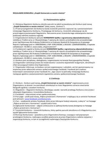 REGULAMIN KONKURSU „Znajdź Komserwis w swoim mieście” § 1 Postanowienia ogólne 1.1 Niniejszy Regulamin Konkursu określa warunki na jakich prowadzony jest Konkurs pod nazwą „Znajdź Komserwis w swoim mieście” (dalej zwany „Konkurs”). 1.2 Przed przystąpieniem do Konkursu każdy Uczestnik powinien zapoznać się z postanowieniami niniejszego Regulaminu Konkursu. Przystępując do konkursu, Uczestnik zobowiązuje się do przestrzegania postanowień Regulaminu. Naruszenie przez Uczestnika tego zobowiązania stanowi podstawę odmowy wydania nagrody. 1.3 Organizatorem Konkursu jest jest KOMSERWIS Spółka z ograniczoną odpowiedzialnością z siedzibą w Trzebini przy ul. Wyspiańskiego 7 wpisaną do rejestru przedsiębiorców prowadzonego przez Sąd Rejonowy dla Krakowa Śródmieścia w Krakowie Wydział XII Gospodarczy Krajowego Rejestru Sądowego pod nr: 0000300444, o NIP: 6282190580, o REGON: 12069509300000, o kapitale zakładowym: 50.000 zł, zwana dalej „Organizatorem”. 1.4 Fundatorem nagród w Konkursie jest KOMSERWIS Spółka z ograniczoną odpowiedzialnością z siedzibą w Trzebini przy ul. Wyspiańskiego 7 wpisaną do rejestru przedsiębiorców prowadzonego przez Sąd Rejonowy dla Krakowa Śródmieścia w Krakowie Wydział XII Gospodarczy Krajowego Rejestru Sądowego pod nr: 0000300444, o NIP: 6282190580, o REGON: 12069509300000, o kapitale zakładowym: 50.000 zł, zwana dalej „Fundatorem”. 1.5 Konkurs jest zarządzany, obsługiwany i organizowany na terenie Rzeczypospolitej Polskiej. 1.6 Organizator zachowuje prawo do moderowania i usuwania wypowiedzi wulgarnych, obraźliwych i/lub naruszających dobre imię Organizatora. 1.7 Organizator informuje, że Konkurs nie jest organizowany z udziałem, ani też sponsorowany czy wspierany przez właściciela serwisu społecznościowego Facebook. Facebook jest znakiem towarowym zastrzeżonym przez Facebook Inc., jego użycie na potrzeby niniejszego Konkursu następuje zgodnie z postanowieniami regulaminu serwisu społecznościowego Facebook. § 2 Definicje 2.1 Konkurs - Konkurs pod nazwą „Znajdź Komserwis w swoim mieście” organizowany przez Organizatora, w okresie i na warunkach określonych w treści Regulaminu oznacza stworzenie fotografii zgodnej z zasadami konkursu. 2.2 Regulamin – Regulamin Konkursu, określający zasady i warunki przebiegu Konkursu oraz prawa i obowiązki Organizatora i Uczestników Konkursu. 2.3 Facebook – internetowy serwis społecznościowy. 2.4 Fan page – profil pod nazwą „Piękno przestrzeni z Komserwis” znajdujący się w serwisie Facebook pod adresem: www.facebook.com/komserwis. 2.5 Fan – użytkownik serwisu Facebook, który przez kliknięcie funkcji natywnej „Lubię to” na Fanpage „Piękno przestrzeni z Komserwis” uzyskał status Fana. 2.6 Zgłoszenie konkursowe – zdjęcie umieszczone w aplikacji konkursowej dostępnej na Fanpage „Piękno przestrzeni z Komserwis”. 2.7 Uczestnik Konkursu – Uczestnik Konkursu, który spełnia warunki określone w § 4 Regulaminu oraz wysłał Zgłoszenie Konkursowe. 2.8 Komisja Konkursowa – powołana przez Organizatora Komisja, czuwająca nad poprawnym przebiegiem Konkursu, realizująca wszelkie powierzone jej przez Organizatora zadania związane z organizacją Konkursu, w tym w szczególności wyłaniająca Zwycięzców Konkursu. § 3 Czas trwania Konkursu 3.1 Konkurs rozpoczyna się 21.03.2015, a kończy 04.05.2015. 3.2 Ogłoszenie wyników Konkursu przewidziane jest na 11.05.2015. Laureat zostanie poinformowany o wygranej drogą telefoniczną lub e-mailową oraz na profilu facebook „Piękno wspólnej przestrzeni” dostępnym pod adresem: www.facebook.com/komserwis § 4 Uczestnik Konkursu 4.1 W Konkursie, przestrzegając postanowień niniejszego Regulaminu, może brać udział każdy internauta bez względu na wiek, który posiada własne, rzeczywiste, osobiste konto w serwisie społecznościowym Facebook. Co za tym idzie, jeden użytkownik nie może zgłosić pracy z więcej niż jednego konta. W konkursie nie można zgłaszać prac z kont fikcyjnych. 4.2 Uczestnicy małoletni biorą udział w Konkursie za zgodą jednego z rodziców lub innego opiekuna prawnego, który wyraża zgodę na publikację materiałów i wykorzystanie wizerunku małoletniego w momencie zakwalifikowania do procesu oceny zdjęcia. 4.3 W Konkursie nie mogą brać udziału pracownicy Organizatora oraz innych firm współpracujących przy organizacji i przeprowadzaniu Konkursu, ani członkowie najbliższej rodziny pracowników tych podmiotów, czyli wstępni, zstępni, rodzeństwo, małżonkowie, rodzeństwo małżonków, rodzice małżonków oraz osoby pozostające w stosunku przysposobienia. 4.4 Warunkiem uczestnictwa w Konkursie jest zapoznanie się z postanowieniami niniejszego Regulaminu i jego akceptacja (w razie wątpliwości uznaje się, iż przesłanie pracy na Konkurs jest równoznaczne z bezwarunkową akceptacją niniejszego Regulaminu). 4.5 Naruszenie Regulaminu powoduje utratę prawa uczestnictwa w Konkursie oraz utratę prawa do otrzymania jakiejkolwiek nagrody. § 5 Zasady zgłoszenia i uczestnictwa w Konkursie 5.1 Zadaniem Uczestnika Konkursu jest wysłanie Zgłoszenia konkursowego czyli zdjęcia na adres [email protected], a także opublikowanie go na swoim profilu facebook z hasztagiem #Komserwis. Zdjęcie powinno być zgodne z zadaniem konkursowym, które brzmi: „Znajdź w swoim mieście/miejscowości produkt Komserwis (ławkę, słupek, stojak rowerowy etc.), a następnie sfotografuj go w kreatywny sposób”. 5.2 Zgłoszenia konkursowe będą publikowane na Fan page Komserwis oraz poddawane ocenie członkom Komisji Konkursowej. 5.3 Główna nagroda oraz 2 wyróżnienia zostaną przyznane przez Komisję Konkursową według swojego uznania. 5.4 Konkurs realizowany jest następująco: a) Od 21.03.2015 do 04.03.2015 Uczestnik Konkursu może dodać swoje Zgłoszenie b) Po zakończeniu przyjmowania Zgłoszeń Konkursowych 