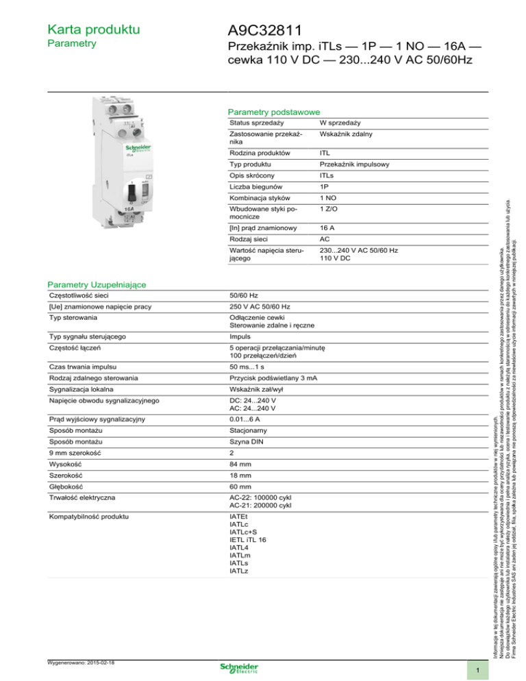 Karta produktu Parametry A9C32811 Przekaźnik imp. iTLs — 1P — 1 NO — 16A — cewka 110 V DC — 230...240 V AC 50/60Hz Status sprzedaży W sprzedaży Zastosowanie przekaźnika Wskaźnik zdalny Rodzina produktów ITL Typ produktu Przekaźnik impulsowy Opis skrócony ITLs Liczba biegunów 1P Kombinacja styków 1 NO Wbudowane styki pomocnicze 1 Z/O [In] prąd znamionowy 16 A Rodzaj sieci AC Wartość napięcia sterującego 230...240 V AC 50/60 Hz 110 V DC Informacje w tej dokumentacji zawierają ogólne opisy i/lub parametry techniczne produktów w niej wymienionych. Niniejsza dokumentacja nie zastępuje ani nie może być wykorzystywana dla oceny przydatności lub niezawodności produktów w ramach konkretnego zastosowania przez danego użytkownika. Do obowiązków każdego użytkownika lub instalatora należy odpowiednia i pełna analiza ryzyka, ocena i testowanie produktu z należytą starannością w odniesieniu do każdego konkretnego zastosowania lub użycia. Firma Schneider Electric Industries SAS ani żaden jej oddział, filia, spółka zależna lub powiązana nie ponoszą odpowiedzialności za niewłaściwe użycie informacji zawartych w niniejszej publikacji. Parametry podstawowe Parametry Uzupełniające Częstotliwość sieci 50/60 Hz [Ue] znamionowe napięcie pracy 250 V AC 50/60 Hz Typ sterowania Odłączenie cewki Sterowanie zdalne i ręczne Typ sygnału sterującego Impuls Częstość łączeń 5 operacji przełączania/minutę 100 przełączeń/dzień Czas trwania impulsu 50 ms...1 s Rodzaj zdalnego sterowania Przycisk podświetlany 3 mA Sygnalizacja lokalna Wskaźnik zał/wył Napięcie obwodu sygnalizacyjnego DC: 24...240 V AC: 24...240 V Prąd wyjściowy sygnalizacyjny 0.01...6 A Sposób montażu Stacjonarny Sposób montażu Szyna DIN 9 mm szerokość 2 Wysokość 84 mm Szerokość 18 mm Głębokość 60 mm Trwałość elektryczna AC-22: 100000 cykl AC-21: 200000 cykl Kompatybilność produktu IATEt IATLc IATLc+S IETL iTL 16 IATL4 IATLm IATLs IATLz Wygenerowano: 2015-02-18 1 Środowisko pracy Normy EN 669-1 EN 669-2-2 Certyfikaty CCC GOST Etykiety jakościowe CEBEC IMQ KEMA NF VDE Poziom hałasu <= 60 dB Tropikalizacja 2 Wilgotność względna 95 % ( 55 °C ) Temepratura otoczenia dla pracy -20...50 °C Oferta zrównoważonego rozwoju Status Green Premium RoHS (date code: YYWW) Produkt nieoznaczony jako Green Premium Compliant - since 1312 - Schneider Electric declaration of conformity REACh Reference not containing SVHC above the threshold Profil ekologiczny produktu Dostępne Gwarancja Period 2 18 miesiecy Pobrane Profil Środowiskowy Produktu