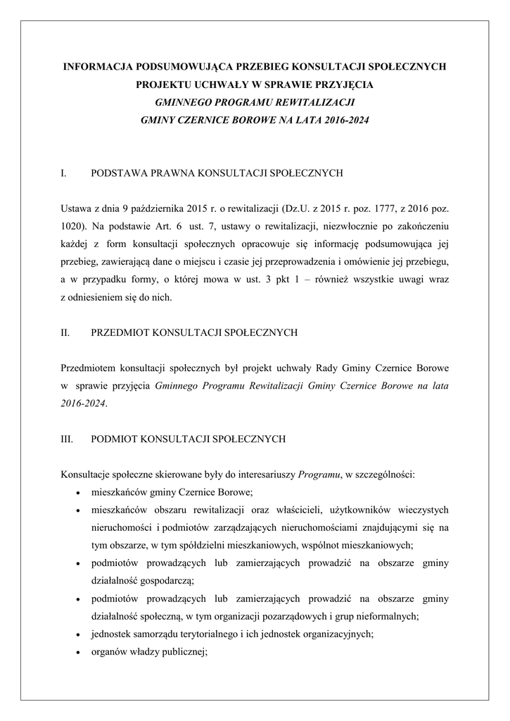 INFORMACJA PODSUMOWUJĄCA PRZEBIEG KONSULTACJI SPOŁECZNYCH PROJEKTU UCHWAŁY W SPRAWIE PRZYJĘCIA GMINNEGO PROGRAMU REWITALIZACJI GMINY CZERNICE BOROWE NA LATA 2016-2024 PODSTAWA PRAWNA KONSULTACJI SPOŁECZNYCH I. Ustawa z dnia 9 października 2015 r. o rewitalizacji (Dz.U. z 2015 r. poz. 1777, z 2016 poz. 1020). Na podstawie Art. 6 ust. 7, ustawy o rewitalizacji, niezwłocznie po zakończeniu każdej z form konsultacji społecznych opracowuje się informację podsumowująca jej przebieg, zawierającą dane o miejscu i czasie jej przeprowadzenia i omówienie jej przebiegu, a w przypadku formy, o której mowa w ust. 3 pkt 1 – również wszystkie uwagi wraz z odniesieniem się do nich. PRZEDMIOT KONSULTACJI SPOŁECZNYCH II. Przedmiotem konsultacji społecznych był projekt uchwały Rady Gminy Czernice Borowe w sprawie przyjęcia Gminnego Programu Rewitalizacji Gminy Czernice Borowe na lata 2016-2024. PODMIOT KONSULTACJI SPOŁECZNYCH III. Konsultacje społeczne skierowane były do interesariuszy Programu, w szczególności: mieszkańców gminy Czernice Borowe; mieszkańców obszaru rewitalizacji oraz właścicieli, użytkowników wieczystych nieruchomości i podmiotów zarządzających nieruchomościami znajdującymi się na tym obszarze, w tym spółdzielni mieszkaniowych, wspólnot mieszkaniowych; podmiotów prowadzących lub zamierzających prowadzić na obszarze gminy działalność gospodarczą; podmiotów prowadzących lub zamierzających prowadzić na obszarze gminy działalność społeczną, w tym organizacji pozarządowych i grup nieformalnych; jednostek samorządu terytorialnego i ich jednostek organizacyjnych; organów władzy publicznej; innych podmiotów realizujących na obszarze rewitalizacji uprawnienia Skarbu Państwa. IV. CEL KONSULTACJI SPOŁECZNYCH Celem konsultacji było zebranie uwag, opinii, sugestii i propozycji dotyczących Gminnego Programu Rewitalizacji Gminy Czernice Borowe na lata 2016-2024. V. PRZEBIEG KONSULTACJI Konsultacje społeczne przeprowadzono w okresie od dnia 10 sierpnia 2016 r. do dnia 9 września 2016 r. O rozpoczęciu konsultacji społecznych powiadomiono Obwieszczeniem Wójta Gminy Czernice Borowe dnia 2 sierpnia 2016 r.: w Biuletynie Informacji Publicznej; na stronie internetowej Urzędu Gminy; na tablicy ogłoszeń; w prasie lokalnej. Konsultacje społeczne przeprowadzone były w formie: zbierania uwag i opinii w formie papierowej oraz elektronicznej; spotkań; debat; ankiet. Osobami wyznaczonymi do udzielania wyjaśnień w sprawie projektu uchwały Rady Gminy Czernice Borowe, będącego przedmiotem konsultacji, były: Pani Justyna Zerman i Pani Anna Kamińska, Urząd Gminy Czernice Borowe, pokój nr 8 w godzinach pracy urzędu, tel. 23 674 60 66, wew. 36. Nieprzedstawienie w wyznaczonym terminie konsultacji, opinii i uwag, oznacza akceptację zaproponowanych w projekcie uchwały rozwiązań i regulacji, z przysługującego prawa do przedstawienia swojego stanowiska. bądź rezygnację Informacja podsumowująca przebieg spotkania konsultacyjnego dotyczącego projektu uchwały w sprawie przyjęcia Gminnego Programu Rewitalizacji Gminy Czernice Borowe na lata 2016-2024 W dniu 2 września 2016 r. o godz. 11.00 w sali konferencyjnej Urzędu Gminy Czernice Borowe odbyło się spotkanie konsultacyjne dotyczące projektu uchwały w sprawie przyjęcia Gminnego Programu Rewitalizacji Gminy Czernice Borowe na lata 2016-2024. Na spotkanie zaproszono (poprzez: ogłoszenia, obwieszczenia, informację prasową) wszystkich mieszkańców gminy Czernice Borowe, organizacje pozarządowe, przedsiębiorców, sołtysów, radnych (w spotkaniu wzięło udział 19 osób - lista obecności stanowi załącznik nr 1 do informacji. – załącznik dostępny w p. 8, UG Czernice Borowe). Udział w spotkaniu miał formę otwartą. Spotkanie otworzył Pan Wojciech Brzeziński, Wójt Gminy Czernice Borowe, który na wstępie podziękował wszystkim obecnym mieszkańcom za przybycie i żywe zainteresowanie sprawami Gminy. Następnie głos zabrał Pan Marcin Gębka – Wykonawca Gminnego Programu Rewitalizacji Gminy Czernice Borowe na lata 2016-2024. Podczas spotkania wyjaśniono i przedstawiono w formie prezentacji multimedialnej podstawowe zagadnienia oraz założenia dotyczące rewitalizacji, omówiono definicję obszaru zdegradowanego i obszaru rewitalizacji w oparciu o ustawę o rewitalizacji, a także założenia i cele Gminnego Programu Rewitalizacji Gminy Czernice Borowe na lata 2016-2024, oraz przedstawiono zadania zaplanowane do realizacji w ramach Programu. Po zakończeniu prezentacji głos zabrały osoby z sali. Zaproponowano cztery nowe zadania do ujęcia w Programie. Propozycje zostaną ujęte w ostatecznej wersji Programu. Zadano również pytania dotyczące szczegółowych zapisów zadań określonych w Programie i możliwości wprowadzania ewentualnych zmian. Na wszystkie pytania odpowiedzi udzielał Pan Marcin Gębka - Wykonawca. Uczestnikom spotkania została rozdysponowana ankieta konsultacyjna, której celem jest pozyskanie opinii na temat Gminnego Programu Rewitalizacji Gminy Czernice Borowe na lata 2016-2024, a także formularz zgłaszania uwag do wyznaczonych obszarów. Ankieta konsultacyjna oraz formularz zgłaszania uwag dostępny był na stronie internetowej Urzędu Gminy Czernice Borowe, w zakładce „Gminny program Rewitalizacji”, BIP Urzędu oraz w siedzibie Urzędu Gminy. Uczestnicy spotkania nie wnieśli innych uwag i propozycji do Gminnego Programu Rewitalizacji Gminy Czernice Borowe na lata 2016-2024. Informacja podsumowująca przebieg debaty dotyczącego projektu uchwały w sprawie przyjęcia Gminnego Programu Rewitalizacji Gminy Czernice Borowe na lata 2016-2024 W dniu 9 września 2016 r. o godz. 11.00 w sali konferencyjnej Urzędu Gminy Czernice Borowe odbyła się debata dotycząca projektu uchwały w sprawie wyznaczenia obszaru zdegradowanego i obszaru rewitalizacji. Na debatę zaproszono (poprzez: ogłoszenia, obwieszczenia, informac