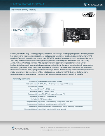 KARTA KATALOGOWA Rejestrator cyfrowy 4 kanały LTR4704Q-15 Cyfrowy rejestrator wizji - 4 kanały; Triplex, umożliwia obserwację, obróbkę i przeglądanie zapisanych sesji bez przerywania nagrywania oraz zdalnego podglądu; do współpracy ze standardowym komputerem PC (slot PCI-Express); rozdzielczość obrazu: max 720x576, prędkość nagrywania do 25 klatek/sek (dla rozdz. 704x288); zaawansowana wideodetekcja ruchu, prealarm, kompresja M-JPEG/MPEG4/H.264, 4 tory Audio, funkcja Watchdog, kontrola PTZ, Oprogramowanie operatora wyposażone w wiele funkcji inteligentnej obserwacji: wykrywanie brakujących przedmiotów, wykrywanie pozostawionych przedmiotów, wirtualne ogrodzenie, strefy zabronione, wykrywanie płomienia, zliczanie osób, automatyczne alarmowe sterowanie kamerami PTZ; Oprogramowanie Zdalnego Klienta do komunikacji po sieciach komputerowych; moduł programowy do współpracy z PDA; skład zestawu: karta wizyjna PCI-Express do komputera; zaawansowane oprogramowanie i instrukcja w j. polskim - system maks. 4 karty / 16 kanałów Parametry techniczne Typ produktu do współpracy z komputerem klasy PC Ilość wejść wideo 4 x BNC, 1 V p-p 75 Ohm (1 karta wizyjna PCI-Express) Format pracy Tripleks Transmisja 25 kl/s (704x288) (1 karta) Kompresja MPEG-4 / MJPEG / H.264 Rozdzielczość maks. 720x576 (dla zoptymaliowanego PC) Rejestracja na dysku HDD komputera PC Tor Audio 4x RCA LineIn wejście Oprogramowanie w j. polskim - Serwer Główny, Zdalny Klient, Klient PDA Praca sieciowa WebSerwer (www); Zdalny klient; CMS; PDA Inne funkcje wideodetekcja ruchu, kontrola dostępu, funkcja Watchdog, kontrola PTZ Filmy instruktażowe maks. 4 karty w systemie (16 kamer łącznie) VOLTA, ul. Jutrzenki 94, 02-230 Warszawa, tel. 022 572 90 20, 022 331 33 00 e-mail: [email protected], www.volta.com.pl 1