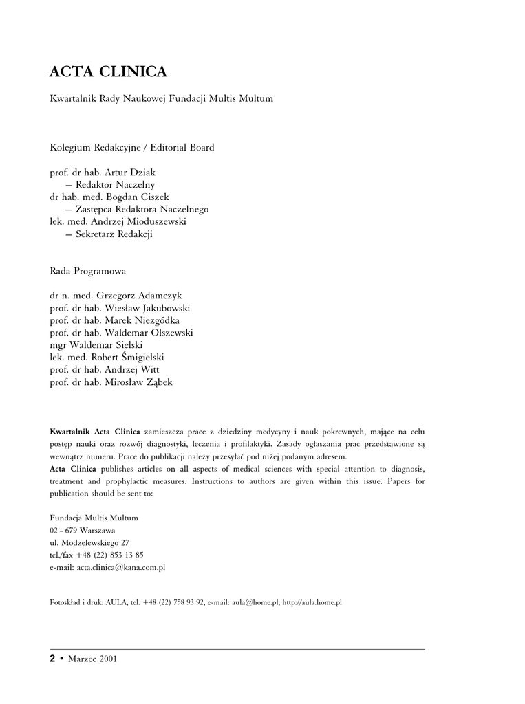 ACTA CLINICA Kwartalnik Rady Naukowej Fundacji Multis Multum Kolegium Redakcyjne / Editorial Board prof. dr hab. Artur Dziak — Redaktor Naczelny dr hab. med. Bogdan Ciszek — Zastæpca Redaktora Naczelnego lek. med. Andrzej Mioduszewski — Sekretarz Redakcji Rada Programowa dr n. med. Grzegorz Adamczyk prof. dr hab. WiesÆaw Jakubowski prof. dr hab. Marek Niezgódka prof. dr hab. Waldemar Olszewski mgr Waldemar Sielski lek. med. Robert ÿmigielski prof. dr hab. Andrzej Witt prof. dr hab. MirosÆaw Zåbek Kwartalnik Acta Clinica zamieszcza prace z dziedziny medycyny i nauk pokrewnych, majåce na celu postæp nauki oraz rozwój diagnostyki, leczenia i profilaktyki. Zasady ogÆaszania prac przedstawione så wewnåtrz numeru. Prace do publikacji naleºy przesyÆaì pod niºej podanym adresem. Acta Clinica publishes articles on all aspects of medical sciences with special attention to diagnosis, treatment and prophylactic measures. Instructions to authors are given within this issue. Papers for publication should be sent to: Fundacja Multis Multum 02 – 679 Warszawa ul. Modzelewskiego 27 tel./fax +48 (22) 853 13 85 e-mail: [email protected] FotoskÆad i druk: AULA, tel. +48 (22) 758 93 92, e-mail: [email protected], http://aula.home.pl 2 • Marzec 2001