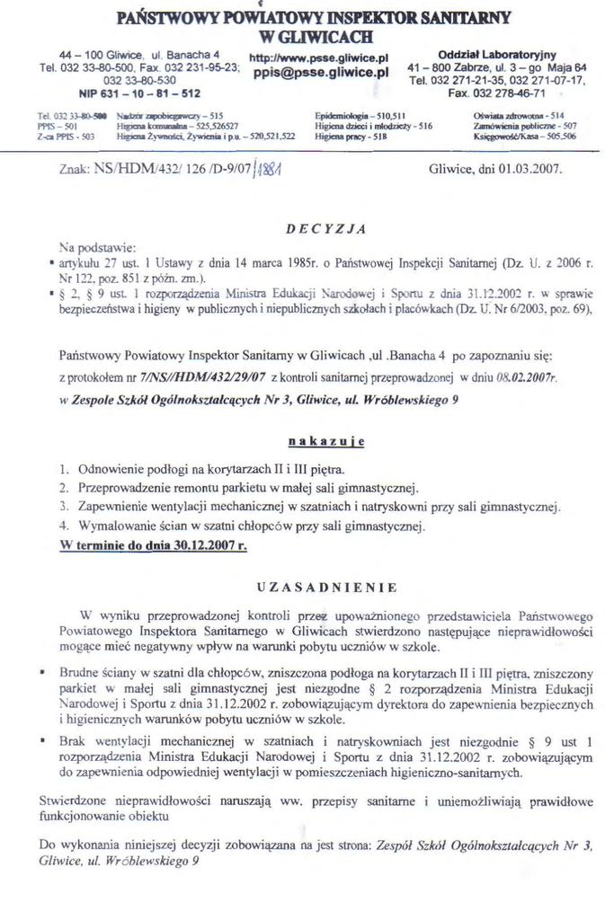 f PANS1WOWY POWIATOWY INSPEKTOR SANITARNY W GLIWICACB 44 - 100 Gliwlce ul Banacha 4 http:Jiwww.ps.se.gliwice.pl Tel. 032 33-80-500, Fax. 032 231-95-23, [email protected] 032 33-80-530 NIP 631 - 10 - 81 - 512 Td. 032 3.3-»-511 Nadzar ~-S I S PPtS - 50 I HigJala kDuumalna- S2S,S26S27 Higicoaly" 'DOSct. l )'\\''lenia i p.u. - S20,521,S22 Z<a PPtS- 50.3 OddziM Laboratoryjny 41 - 800 Zabrze, ul. 3 - go Maja 64 Tel. 032 271-21-35, 032 271-07-17, Fax. 032 278-46-71 Epidcmiologia - SIO,S II l ligiena dzieci i rmodziety - 16 Higiena pracy - Sl8 s Znak: ~S HDM ~32 126 /D-9/07 /-1~~ ~ata zdrowoma- 51 4 Zam6wienia publk:zne - 507 Ks~woWKasa- 505.506 Gliwice, dni 0 1.03.2007. D ECYZJA ~a podstawie: • anykulu 27 ust Ustawy z dnia 14 marca 1985r. o Pailstwowej Inspekcji Sanitarnej (Dz. U. z 2006 r. Nr 122. poz. 851 z p6in. zm.). • ~ 2. § 9 ust 1 rozporzctdzenia ~finb-ua ~;i ~..uod\lwej i Sporru z drua 3l.l~.:wo~ r. w sprawie bezpieczeilstwa i higieny w publicznych i niepublicmych szkotach i plac6wkach (Dz. U. Nr 6/2003. poz. 69). Pailstwowy Powiatowy lnspektor Sanitarny w Gliwicach ,ul .Banacha 4 po zapoznaniu si~: z protokotem nr 7/NS//HD M/43212910 7 z kontroli sanitarnej przeprowadzonej w dniu 08.02.2007r. w Zespole S zkol Ogolnoksztalcqcych N r 3, Gliwice, ul. Wr6 blewskiego 9 nakazuj e 1. Odnowienie podlogi na korytarzach ll i Ill pi~tra 2. Przeprowadzenie remontu parkietu w malej sali gimnastycznej. 3. Zapewnienie wentylacj i mechanicznej w szatniach i natryskowni przy sali gimnastycznej. ~. Wymalowanie scian w szatni chlopc6w przy sali gimnastycznej. W terminie do dnia 30.12.2007 r. UZASA D N I E N I E \\' v.yniku przeprowadzonej kontroli prz& upov.atnionego przedsta\\iciela Pansrwowego Po v.iatowego Inspektora Sanitamego w Gliwicach stwierdzono nast~puj ~ niepra\\i dlowosci mog~ce miec negatywny wplyw na warunki pobytu uczni6w w szkole. • Brudne sciany w szatni d la chlopc6w, zniszczona podtoga na korytarzach II i Ill pi~tra zniszczony parkiet w malej sali gimnastycznej jest niezgodne § 2 rozporz~dzenia Ministra Edukacji i Sportu z dnia 31. 12.2002 r. zobowi~uj ~cym dyrektora do zapewnienia bezpiecznych i higienicznych warunk6w pobytu uczni6w w szk.ole . ~arodowej • Brak wentylacj i mecbanicznej w szatniach i natryskowniach jest niezgodnie § 9 ust 1 rozpol7..<\dzenia Ministra Edukacji Narodowej i Sportu z dnia 31.12.2002 r. zobowi(\_Zllj<\_cym do zapev.nienia odpowiedniej wentylacji w pomieszczeniach higieniczno-sanitamych. Stwierdzone nieprawidlowosci funkcjonowanie obiektu naruszaj ~ ww. przepisy sanitarne i uniemoZliwiajct prawidlowe Do wykonania niniejszej decyzj i zobowillZ3fla na jest strona: Zesp6l SzkOl Og6lnoksztalcqcych Nr 3. Gliwice. ul. Wr6blewskiego 9 Osob<\_ zobow1~anct do bezposredniego czuwania nad wykonaniem przez Zespolu Szkol Ogo/noksztalcqcych Nr 3. Gliwice, ul. Wr6b/ewskiego 9 stron~ decyzji jes.: ~~ \\. przypadk'U niewykonania lub niewla5ciwego wykonania niniejszej decyzji w oznaczonym terminie ~ nakladane grzywny celem przymuszenia zgodnie z ustaw<t z dnia 17.06.66r. o pos~powaniu egzekucyjnym ~ administracji (tekst jednolity Dz. U. Nr 110. poz. 968 z 2002r. z poi. zm.) Od decyzji ninicjszej sluty stronom odwolanie do Panstwowcgo Wojcw6dzkiego Inspektora Sanitamego \\ Katowicach. za posrednictwem Pa.nstwowego Powiatowego lnspektora Sanitarnego w G1iwicach, w terrninie 14-tu dni od dnia jeJ do~czema Otr/.vmuje: l. 2. Zesp6l Szkol Ogolnoksztale<tcych ~r 3. NSIHDM " /m Glr~'roblewskiego ' ~\ 1 <J 9
