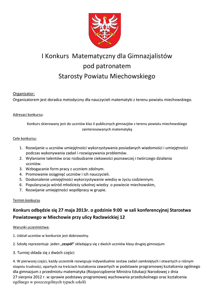 I Konkurs Matematyczny dla Gimnazjalistów pod patronatem Starosty Powiatu Miechowskiego Organizator: Organizatorem jest doradca metodyczny dla nauczycieli matematyki z terenu powiatu miechowskiego. Adresaci konkursu: Konkurs skierowany jest do uczniów klas II publicznych gimnazjów z terenu powiatu miechowskiego zainteresowanych matematyką Cele konkursu: 1. Rozwijanie u uczniów umiejętności wykorzystywania posiadanych wiadomości i umiejętności podczas wykonywania zadań i rozwiązywania problemów. 2. Wyłanianie talentów oraz rozbudzanie ciekawości poznawczej i twórczego działania uczniów. 3. Wzbogacanie form pracy z uczniem zdolnym. 4. Promowanie osiągnięć uczniów i ich nauczycieli. 5. Doskonalenie umiejętności wykorzystywanie wiedzy w życiu codziennym. 6. Popularyzacja wśród młodzieży szkolnej wiedzy o powiecie miechowskim, 7. Rozwijanie umiejętności współpracy w grupie. Termin konkursu Konkurs odbędzie się 27 maja 2013r. o godzinie 9:00 w sali konferencyjnej Starostwa Powiatowego w Miechowie przy ulicy Racławickiej 12 Warunki uczestnictwa: 1. Udział uczniów w konkursie jest dobrowolny. 2. Szkołę reprezentuje jeden „zespół” składający się z dwóch uczniów klasy drugiej gimnazjum 3. Turniej składa się z dwóch części: 4. W pierwszej części, każdy uczestnik rozwiązuje indywidualnie zestaw zadań zamkniętych i otwartych o różnym stopniu trudności, opartych na treściach kształcenia zawartych w podstawie programowej kształcenia ogólnego dla gimnazjum z przedmiotu matematyka (Rozporządzenie Ministra Edukacji Narodowej z dnia 27 sierpnia 2012 r. w sprawie podstawy programowej wychowania przedszkolnego oraz kształcenia ogólnego w poszczególnych typach szkół) 5.W drugiej części każdy „zespół”, wykonując zdanie łączące wiadomości i umiejętności matematyczne z wiedzą o powiecie miechowskim Zadania w II części konkursu dotyczą: - puzzli -zagadek matematycznych -krzyżówek matematycznych -wykorzystania planu i mapy 6. w drugiej części „zespoły” otrzymują instrukcję do zadań. 7. Klasyfikację końcową ustala jury konkursu, biorąc pod uwagę łączną liczbę uzyskanych punktów z części I i II przez zespół. 8. W przypadku uzyskania tej same liczby punktów o miejscu decyduje dogrywka w postaci wykonania dodatkowego zadania. 9. Laureatami konkursu zostaną trzy zespoły, które w obu etapów uzyskają największą liczbę punktów. 10. Rozstrzygnięcie konkursu i wręczenie nagród odbywa się w dniu konkursu. 11. Podczas rozwiązywania zadań w obu etapach zawodnicy nie mogą korzystać z kalkulatorów i telefonów komórkowych. 12. Prace sprawdzane są tego samego dnia. 13. Wgląd w prace uczniów wyłącznie w dniu konkursu. 14. Wszelkie sprawy nie objęte niniejszym regulaminem rozstrzyga komisja konkursowa wyłącznie w dniu konkursu. 15. Decyzje komisji konkursowej są ostateczne i nie ma od nich odwołania. 16. Komisja konkursowa zabezpiecza i przechowuje prace uczniów do dnia 31 sierpnia 2013 r. Treści kształcenia obowiązujące do konkursu: Zadania konkursowe zostaną opracowane w oparciu o podstawę programową kształcenia ogólnego dla gimnazjum z przedmiotu matematyka - rozporządzenie Ministra Edukacji Narodowej z dnia 27 sierpnia 2012 r. w sprawie podstawy programowej wychowania przedszkolnego oraz kształcenia ogólnego w poszczególnych typach szkół . W przygotowaniu do konkursu z podstawy programowej należy pominąć zagadnienia związane z bryłami (graniastosłup , ostrosłup i bryły obrotowe). Szczególną uwagę należy zwrócić na: 1) podejmowanie przez ucznia działań o charakterze twórczym - stawianie hipotez, uogólnianie, dostrzeganie analogii, formułowanie pytań, dobieranie kontrprzykładów; 2) formułowanie wniosków, definicji lub twierdzeń na podstawie analizy podanego tekstu o charakterze matematycznym; 3) argumentowanie przy użyciu języka matematyki; 4) dowodzenie nieskomplikowanych twierdzeń 5) ogólne wiadomości o powiecie miechowskim Karta zgłoszeniowa Imię i nazwisko ucznia Szkoła Klasa Imię i nazwisko opiekuna Pieczęć dyrektora szkoły Kartę zgłoszeniową szkoła przesyła na adres [email protected] lub osobiście do dniu 20 maja 2013r. do pokoju nr36 budynek B Starostwa Powiatowego ul Sienkiewicza Literatura 1)G ó r o w s k i J., Ł o m n i c k i A.:1996, Czwarty stopień wtajemniczenia, KLEKS 2)G a r d i n e r T.: 2001, Matematyczne potyczki cz. I i II, Nowa Era, Warszawa 3)N o d z y ń s k i P. B o b i ń s k i Z., U s t k i M.: 2010, Koło matematyczne w gimnazjum”, Aksjomat Toruń 4)Konkursy matematyczne dla gimnazjalistów.:2010, JERSZ -Wrocław 5)Matematyka z wesołym Kangurem - Poziom Kadet, Aksjomat Toruń 6)Matematyka - Czasopismo dla nauczycieli - Spółka Wydawnicza Raabe 7)Przykłady zadań konkursowych lub zadań dla kół matematycznych 8) Informacje o powiecie miechowskim zawarte na stronie internetowej Powiatu Miechowskiego http://www.miechow.pl/page/_Powiat/id=22 http://www.miechow.pl/page/_Gminy_w_powiecie/id=71