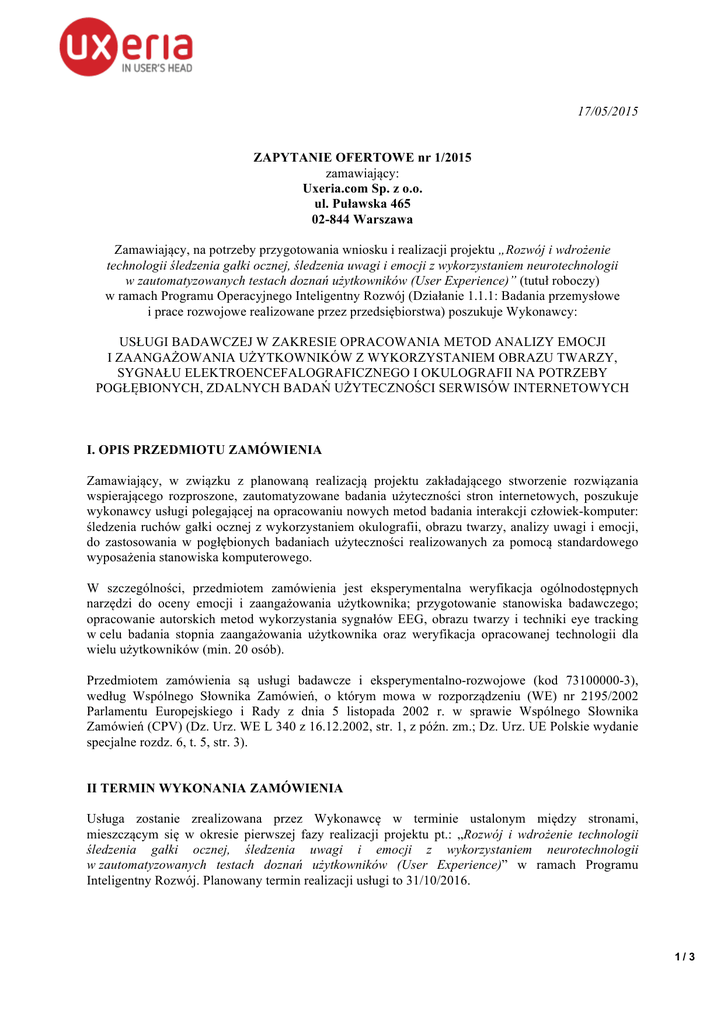 17/05/2015 ZAPYTANIE OFERTOWE nr 1/2015 zamawiający: Uxeria.com Sp. z o.o. ul. Puławska 465 02-844 Warszawa Zamawiający, na potrzeby przygotowania wniosku i realizacji projektu „Rozwój i wdrożenie technologii śledzenia gałki ocznej, śledzenia uwagi i emocji z wykorzystaniem neurotechnologii w zautomatyzowanych testach doznań użytkowników (User Experience)” (tutuł roboczy) w ramach Programu Operacyjnego Inteligentny Rozwój (Działanie 1.1.1: Badania przemysłowe i prace rozwojowe realizowane przez przedsiębiorstwa) poszukuje Wykonawcy: USŁUGI BADAWCZEJ W ZAKRESIE OPRACOWANIA METOD ANALIZY EMOCJI I ZAANGAŻOWANIA UŻYTKOWNIKÓW Z WYKORZYSTANIEM OBRAZU TWARZY, SYGNAŁU ELEKTROENCEFALOGRAFICZNEGO I OKULOGRAFII NA POTRZEBY POGŁĘBIONYCH, ZDALNYCH BADAŃ UŻYTECZNOŚCI SERWISÓW INTERNETOWYCH I. OPIS PRZEDMIOTU ZAMÓWIENIA Zamawiający, w związku z planowaną realizacją projektu zakładającego stworzenie rozwiązania wspierającego rozproszone, zautomatyzowane badania użyteczności stron internetowych, poszukuje wykonawcy usługi polegającej na opracowaniu nowych metod badania interakcji człowiek-komputer: śledzenia ruchów gałki ocznej z wykorzystaniem okulografii, obrazu twarzy, analizy uwagi i emocji, do zastosowania w pogłębionych badaniach użyteczności realizowanych za pomocą standardowego wyposażenia stanowiska komputerowego. W szczególności, przedmiotem zamówienia jest eksperymentalna weryfikacja ogólnodostępnych narzędzi do oceny emocji i zaangażowania użytkownika; przygotowanie stanowiska badawczego; opracowanie autorskich metod wykorzystania sygnałów EEG, obrazu twarzy i techniki eye tracking w celu badania stopnia zaangażowania użytkownika oraz weryfikacja opracowanej technologii dla wielu użytkowników (min. 20 osób). Przedmiotem zamówienia są usługi badawcze i eksperymentalno-rozwojowe (kod 73100000-3), według Wspólnego Słownika Zamówień, o którym mowa w rozporządzeniu (WE) nr 2195/2002 Parlamentu Europejskiego i Rady z dnia 5 listopada 2002 r. w sprawie Wspólnego Słownika Zamówień (CPV) (Dz. Urz. WE L 340 z 16.12.2002, str. 1, z późn. zm.; Dz. Urz. UE Polskie wydanie specjalne rozdz. 6, t. 5, str. 3). II TERMIN WYKONANIA ZAMÓWIENIA Usługa zostanie zrealizowana przez Wykonawcę w terminie ustalonym między stronami, mieszczącym się w okresie pierwszej fazy realizacji projektu pt.: „Rozwój i wdrożenie technologii śledzenia gałki ocznej, śledzenia uwagi i emocji z wykorzystaniem neurotechnologii w zautomatyzowanych testach doznań użytkowników (User Experience)” w ramach Programu Inteligentny Rozwój. Planowany termin realizacji usługi to 31/10/2016. 1/ 3 III. OPIS SPOSOBU PRZYGOTOWANIA OFERTY Oferta powinna zawierać co najmniej: 1. Nazwę i adres Oferenta 2. Datę sporządzenia oferty 3. Skrócony opis niezbędnych zasobów i doświadczenia w realizacji podobnych prac, nawiązujący do parametrów wyszczególnionych w zapytaniu ofertowym i kryteriów oceny wymienionych poniżej 4. Termin realizacji usługi 5. Cenę netto za wykonanie usługi 6. Warunki i termin płatności 7. Podpis Oferenta 8. Termin ważności oferty IV. KRYTERIA OCENY Oferty zostaną poddane ocenie według poniższych kryteriów: Kryterium 1 2 Termin wykonania usługi mieszczący się w planowanym terminie wykonania zamówienia (31/10/2016) Zasoby ludzkie i techniczne zapewniające prawidłową realizację usługi Waga (ilość punktów) TAK/NIE 0 – 30 3 Doświadczenie w realizacji podobnych prac w wymienionym zakresie 0 – 20 4 Cena netto za usługę (w odniesieniu do pozostałych ofert) 0 – 40 5 Typ oferenta (preferowane są uczelnie publiczne, państwowe instytutybadawcze, instytuty PAN lub inne jednostki naukowe prowadzące badania i upowszechniające wiedzę 1) 0 lub 10 Sposób przyznawania punktacji za spełnienie kryterium Kryterium dostępu oceniane na podstawie informacji o terminie realizacji usługi zawartej w ofercie Ocenę maksymalną otrzymają oferty podmiotów, które zobowiążą się do zaangażowania w prace co najmniej 3 osób z tytułem naukowym doktora lub wyższym Ocenę maksymalną uzyskają oferty podmiotów, które zrealizowały co najmniej 2 projekty badawcze w obszarze projektu w ciągu ostatnich 3 lat Kryterium oceniane według zależności C=(Cn/Co)*5, gdzie: Cn - cena najkorzystniejszej oferty Co - cena ocenianej oferty Ocenę maksymalną uzyskają oferty, dla których wartość wskaźnika C wyniesie co najwyżej 4 Kryterium oceniane na podstawie informacji o oferencie zawartej w ofercie Niespełnienie kryterium nr 1 spowoduje odrzucenie oferty. W odniesieniu do pozostałych kryteriów, ocena wyliczana jest na podstawie wzoru matematycznego S = Z + D + C + T, gdzie poszczególne symbole oznaczają: S – suma uzyskanych punktów 1 Zgodnie z regulaminem konkursu w ramach Programu Operacyjnego Inteligentny Rozwój 2014-2020, dostępnego na stronie internetowej Narodowego Centrum Badań i Rozwoju (http://ncbir.gov.pl), Wnioskodawca może zlecić część prac merytorycznych uczelni publicznej, państwowemu instytutowi badawczemu, instytutowi PAN lub innej jednostce naukowej będącej organizacją prowadzącą badania i upowszechniającą wiedzę, o której mowa w art. 2 pkt 83 rozporządzenia Komisji (UE) nr 651/2014 z dnia 17 czerwca 2014 r., która podlega ocenie jakości działalności naukowej lub badawczo-rozwojowej jednostek naukowych, o której mowa w art. 41 ust. 1 pkt 1 i art. 42 ustawy z dnia 30 kwietnia 2010 r. o zasadach finansowania nauki (Dz. U. z 2014 r., poz. 1620), i otrzymała co najmniej ocenę B. 2/ 3 Z – punkty za zasoby ludzkie i techniczne D – punkty za doświadczenie w realizacji podobnych prac C – punkty za cenę T – punkty za typ jednostki przedstawiającej ofertę W razie uzyskania przez dwóch lub więcej oferentów takiej samej ilości punktów, kryterium rozstrzygającym w celu wyłonienia zwycięzcy będzie najkorzystniejsza cena netto. V. WARUNKI WSPÓŁPRACY Z