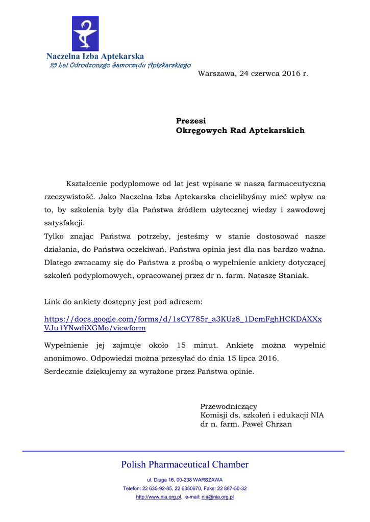 Naczelna Izba Aptekarska 25 Lat Odrodzonego Samorządu Aptekarskiego Warszawa, 24 czerwca 2016 r. Prezesi Okręgowych Rad Aptekarskich Kształcenie podyplomowe od lat jest wpisane w naszą farmaceutyczną rzeczywistość. Jako Naczelna Izba Aptekarska chcielibyśmy mieć wpływ na to, by szkolenia były dla Państwa źródłem użytecznej wiedzy i zawodowej satysfakcji. Tylko znając Państwa potrzeby, jesteśmy w stanie dostosować nasze działania, do Państwa oczekiwań. Państwa opinia jest dla nas bardzo ważna. Dlatego zwracamy się do Państwa z prośbą o wypełnienie ankiety dotyczącej szkoleń podyplomowych, opracowanej przez dr n. farm. Nataszę Staniak. Link do ankiety dostępny jest pod adresem: https://docs.google.com/forms/d/1sCY785r_a3KUz8_1DcmFghHCKDAXXx VJu1YNwdiXGMo/viewform Wypełnienie jej zajmuje około 15 minut. Ankietę można wypełnić anonimowo. Odpowiedzi można przesyłać do dnia 15 lipca 2016. Serdecznie dziękujemy za wyrażone przez Państwa opinie. Przewodniczący Komisji ds. szkoleń i edukacji NIA dr n. farm. Paweł Chrzan Polish Pharmaceutical Chamber ul. Długa 16, 00-238 WARSZAWA Telefon: 22 635-92-85, 22 6350670, Faks: 22 887-50-32 http://www.nia.org.pl, e-mail: [email protected]