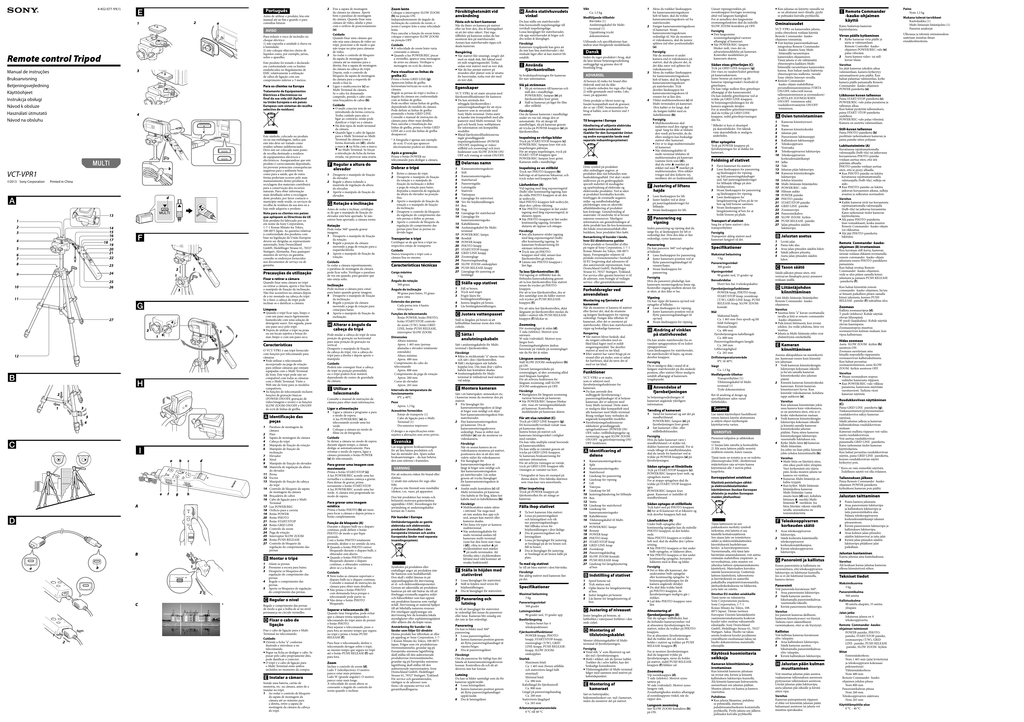 4-452-077-11(1) 2 1 Antes de utilizar o produto, leia este manual até ao fim e guarde-o para consultas futuras. a AVISO Para reduzir o risco de incêndio ou choque eléctrico 1) não exponha a unidade à chuva ou à humidade; 2) não coloque objectos cheios de líquidos como, por exemplo, jarras, sobre o aparelho. Remote control Tripod Este produto foi testado e declarado em conformidade com os limites estabelecidos no Regulamento de EMC relativamente à utilização de cabos de ligação com um comprimento inferior a 3 metros. 3 Manual de instruções Bruksanvisning Betjeningsvejledning Käyttöohjeet Instrukcja obsługi Návod k obsluze Használati útmutató Návod na obsluhu Para os clientes na Europa Tratamento de Equipamentos Eléctricos e Electrónicos no final da sua vida útil (Aplicável na União Europeia e em países Europeus com sistemas de recolha selectiva de resíduos) 4 c b VCT-VPR1 ©2013 Sony Corporation Este símbolo, colocado no produto ou na sua embalagem, indica que este não deve ser tratado como resíduo urbano indiferenciado. Deve sim ser colocado num ponto de recolha destinado a resíduos de equipamentos eléctricos e electrónicos. Assegurandose que este produto é correctamente depositado, irá prevenir potenciais consequências negativas para o ambiente bem como para a saúde, que de outra forma poderiam ocorrer pelo mau manuseamento destes produtos. A reciclagem dos materiais contribuirá para a conservação dos recursos naturais. Para obter informação mais detalhada sobre a reciclagem deste produto, por favor contacte o município onde reside, os serviços de recolha de resíduos da sua área ou a loja onde adquiriu o produto. Printed in China d TI MULTI 13 Nota para os clientes nos países que apliquem as Directivas da UE Este produto foi fabricado por ou em nome da Sony Corporation, 1-7-1 Konan Minato-ku Tokyo, 108-0075 Japão. As questões relativas à conformidade dos produtos com base na legislação da União Europeia devem ser dirigidas ao representante autorizado, Sony Deutschland GmbH, Hedelfinger Strasse 61, 70327 Stuttgart, Alemanha. Para quaisquer assuntos de serviço ou garantia, consulte os endereços fornecidos nos documentos de serviço ou de garantia. L MU 1 2 3 14 15 16 17 18 19 20 21 22 4 5 6 7 8 23 9 24 10 25 26 11 2 2 Precauções de utilização 1 Fixar e retirar a câmara Quando fixar uma câmara no tripé ou retirar a câmara, aperte e fixe bem o manípulo de fixação da inclinação. Não fixe acessórios na câmara depois de a ter montado na cabeça do tripé. Se o fizer, a cabeça do tripé pode inclinar-se e danificar a câmara. 3 Limpeza 27 4 3 5 1 6 2 ˎˎQuando o tripé ficar sujo, limpe-o com um pano macio ligeiramente humedecido com uma solução de detergente suave. Em seguida, passe um pano seco pelo tripé. ˎˎDepois de utilizar o tripé na praia ou em locais sujeitos a brisas do mar, limpe-o com um pano seco. Características O VCT-VPR1 é um tripé fornecido com funções por telecomando para câmaras. ˎˎPode utilizar o telecomando incorporado na pega de rotação para utilizar câmaras que estejam equipadas com o Multi Terminal da Sony. Este tripé pode não ser compatível com todas as câmaras com o Multi Terminal. Visite o Web site da Sony para os modelos compatíveis. ˎˎAs funções do telecomando incluem funções de gravação básicas (POWER ON/OFF, gravação de vídeo/imagens e zoom) e as funções SLOW ZOOM ON/OFF e ON/OFF do ecrã de linhas de grelha. 12 2 3 1 Identificação das peças 5 4 1 2 3 4 5 6 a b c 7 8 9 10 d 11 12 13 14 e f g h 15 16 A 17 18 19 20 21 22 23 24 25 26 27 B a Montar o tripé 1 Afaste as pernas. 2 Pressione a escora para baixo. 3 Desaperte os bloqueios de regulação do comprimento das pernas. 4 Regule o comprimento das pernas. 5 Aperte os bloqueios de regulação do comprimento das pernas. 1 b 2 C Parafuso de montagem da câmara Pino Sapata de montagem da câmara Cabeça do tripé Manípulo de fixação da rotação Manípulo de fixação da inclinação Elevador Nível Manípulo de fixação do elevador Manivela de regulação da altura do elevador Perna Escora Manípulo de fixação da cabeça do tripé Controlo de bloqueio da sapata de montagem da câmara Braçadeira de cabos Cabo de ligação para o Multi Terminal Luz POWER/REC Orifício para a correia Botão POWER Botão PHOTO Botão START/STOP Botão GRID LINE Controlo do zoom Pega de rotação Interruptor SLOW ZOOM Botão PUSH RELEASE Controlo de bloqueio da regulação do comprimento das pernas * Regular o nível Regule o comprimento das pernas de modo a que a bolha de ar no nível permaneça no círculo vermelho. Fixar o cabo de ligação Fixe o cabo de ligação para o Multi Terminal no telecomando. 1 2 Cuidado ˎˎOriente a ficha “a” conforme ilustrado e introduza-a no telecomando. ˎˎPegue na ficha ao desligar o cabo. Se puxar pelo cabo propriamente dito, pode danificar o conector. ˎˎO tripé e o cabo de ligação para o Multi Terminal estão ambos incluídos no momento da compra. Instalar a câmara Instale uma bateria, cartão de memória, etc. na câmara, antes de a instalar no tripé. 1 Ao rodar o controlo de bloqueio da sapata de montagem da câmara até ao máximo para a direita, retire a sapata de montagem da câmara da cabeça do tripé. 2 Fixe a sapata de montagem da câmara na câmara. Aperte bem o parafuso de montagem da câmara. Quando fixar uma câmara de vídeo, alinhe o pino com o orifício de posicionamento (a). Cuidado Quando fixar uma câmara que não seja uma câmara de vídeo no tripé, posicione-a de modo a que não toque no pino para câmaras de vídeo. 3 Ao rodar o controlo de bloqueio da sapata de montagem da câmara até ao máximo para a direita, fixe a sapata de montagem da câmara na cabeça do tripé. Depois, rode o controlo de bloqueio da sapata de montagem da câmara para a esquerda de modo a fixá-lo. 4 Ligue o multiconector (c) ao Multi Terminal da câmara. Se o cabo for de