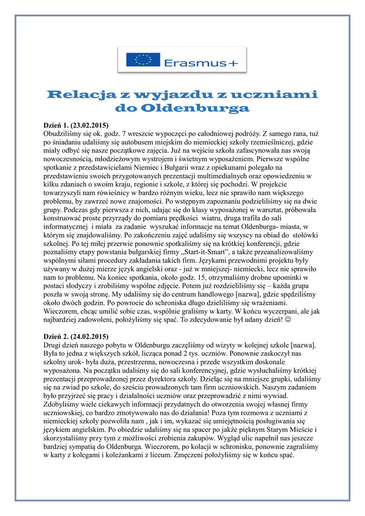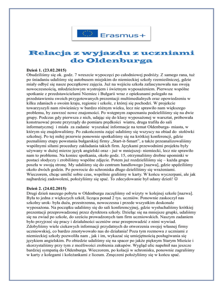 Relacja z wyjazdu z uczniami do Oldenburga Dzień 1. (23.02.2015) Obudziliśmy się ok. godz. 7 wreszcie wypoczęci po całodniowej podróży. Z samego rana, tuż po śniadaniu udaliśmy się autobusem miejskim do niemieckiej szkoły rzemieślniczej, gdzie miały odbyć się nasze początkowe zajęcia. Już na wejściu szkoła zafascynowała nas swoją nowoczesnością, młodzieżowym wystrojem i świetnym wyposażeniem. Pierwsze wspólne spotkanie z przedstawicielami Niemiec i Bułgarii wraz z opiekunami polegało na przedstawieniu swoich przygotowanych prezentacji multimedialnych oraz opowiedzeniu w kilku zdaniach o swoim kraju, regionie i szkole, z której się pochodzi. W projekcie towarzyszyli nam rówieśnicy w bardzo różnym wieku, lecz nie sprawiło nam większego problemu, by zawrzeć nowe znajomości. Po wstępnym zapoznaniu podzieliliśmy się na dwie grupy. Podczas gdy pierwsza z nich, udając się do klasy wyposażonej w warsztat, próbowała konstruować proste przyrządy do pomiaru prędkości wiatru, druga trafiła do sali informatycznej i miała za zadanie wyszukać informacje na temat Oldenburga- miasta, w którym się znajdowaliśmy. Po zakończeniu zajęć udaliśmy się wszyscy na obiad do stołówki szkolnej. Po tej miłej przerwie ponownie spotkaliśmy się na krótkiej konferencji, gdzie poznaliśmy etapy powstania bułgarskiej firmy „Start-it-Smart”, a także przeanalizowaliśmy wspólnymi siłami procedury zakładania takich firm. Językami przewodnimi projektu były używany w dużej mierze język angielski oraz - już w mniejszej- niemiecki, lecz nie sprawiło nam to problemu. Na koniec spotkania, około godz. 15, otrzymaliśmy drobne upominki w postaci słodyczy i zrobiliśmy wspólne zdjęcie. Potem już rozdzieliliśmy się – każda grupa poszła w swoją stronę. My udaliśmy się do centrum handlowego [nazwa], gdzie spędziliśmy około dwóch godzin. Po powrocie do schroniska długo dzieliliśmy się wrażeniami. Wieczorem, chcąc umilić sobie czas, wspólnie graliśmy w karty. W końcu wyczerpani, ale jak najbardziej zadowoleni, położyliśmy się spać. To zdecydowanie był udany dzień! Dzień 2. (24.02.2015) Drugi dzień naszego pobytu w Oldenburgu zaczęliśmy od wizyty w kolejnej szkole [nazwa]. Była to jedna z większych szkół, licząca ponad 2 tys. uczniów. Ponownie zaskoczył nas szkolny urok- była duża, przestrzenna, nowoczesna i przede wszystkim doskonale wyposażona. Na początku udaliśmy się do sali konferencyjnej, gdzie wysłuchaliśmy krótkiej prezentacji przeprowadzonej przez dyrektora szkoły. Dzieląc się na mniejsze grupki, udaliśmy się na zwiad po szkole, do sześciu prowadzonych tam firm uczniowskich. Naszym zadaniem było przyjrzeć się pracy i działalności uczniów oraz przeprowadzić z nimi wywiad. Zdobyliśmy wiele ciekawych informacji przydatnych do otworzenia swojej własnej firmy uczniowskiej, co bardzo zmotywowało nas do działania! Poza tym rozmowa z uczniami z niemieckiej szkoły pozwoliła nam , jak i im, wykazać się umiejętnością posługiwania się językiem angielskim. Po obiedzie udaliśmy się na spacer po jakże pięknym Starym Mieście i skorzystaliśmy przy tym z możliwości zrobienia zakupów. Wygląd ulic napełnił nas jeszcze bardziej sympatią do Oldenburga. Wieczorem, po kolacji w schronisku, ponownie zagraliśmy w karty z kolegami i koleżankami z liceum. Zmęczeni położyliśmy się w końcu spać. Dzień 3. (25.02.2015) Nastał kolejny dzień naszego wyjazdu. Tym razem, z rana, spotkaliśmy się wszyscy razem na uniwersytecie. Rozmawialiśmy o etapach zakładania firmy- od pomysłów, potrzeb i zagrożeń, aż po sprawnie funkcjonującą instytucję. Przyszedł czas na zastanowienie się nad swoją przyszłą firmą. Pracując w swoich grupach razem z nauczycielami, korzystając z nabytej dotąd wiedzy i materiałów, mieliśmy pomyśleć nad działaniem naszej przyszłej firmy, czyli głównie nad pomysłem. Toczyła się niezła dyskusja- analizowanie naszych mocnych stron i wykorzystanie tego w praktyce, plusy i minusy podsuwanych pomysłów, konsultacje. Na koniec przedstawialiśmy na forum efekty swoich „obrad”. Zmęczeni, ale zadowoleni udaliśmy się na lunch. Kolejną atrakcją tego dnia była wizyta w znanej w Niemczech firmie BÄKO, zajmującej się hurtową sprzedażą produktów spożywczych. Po wysłuchaniu szczegółowej prezentacji i odpowiedzi na pytania, przeszliśmy do kolejnego etapu, jakim było zwiedzanie firmy od wewnątrz. Ta część spotkania podobała nam się najbardziej, gdyż nigdy wcześniej nie mieliśmy szansy zobaczyć pracy w tak ogromnym magazynie, tak wielu maszyn i sprzętów. Pod koniec dnia czekała nas miła niespodzianka. Po kolacji razem z uczniami z Niemiec i Bułgarii wybraliśmy się do kręgielni! Przez przeszło 2 godziny mieliśmy czas na odreagowanie podczas wspólnej gry w kręgle. A kiedy zabawa dobiegła końca, z wypisanymi na twarzach uśmiechami powróciliśmy autobusem do naszego schroniska. Co to był za dzień! Późnym wieczorem, bo nie ominęliśmy oczywiście gry w karty , położyliśmy się spać, zadowoleni z dnia tak pełnego wrażeń. Dzień 4. (26.02.2015) Już czwartek! Rozpoczynające ten dzień zajęcia na uniwersytecie dotyczyły tworzenia biznesplanu. Mogliśmy posłuchać, jak ważną odgrywa on rolę w firmie, a raczej jest jej podstawą, i jak go sporządzać. Nie musieliśmy biznesplanu jednak przygotowywać- na to jeszcze przyjdzie czas . W następnym punkcie dnia rozdzieliliśmy się wszyscy-my, Niemcy i Bułgarzy- na dwie grupy. Po przerwie obiadowej czekało na nas zadanie-wywiady przeprowadzane na ulicach Oldenburga! Mieliśmy też wybrać po jednej swojej ulubionej piosence, którą mamy przy sobie- nie wiedzieliśmy jednak, po co. Tak więc ciekawi i nieco ze stresikiem udaliśmy się do studia, gdzie nauczyliśmy się obsługi profesjonalnych dyktafonów, które zabierzemy ze sobą. Dziel
