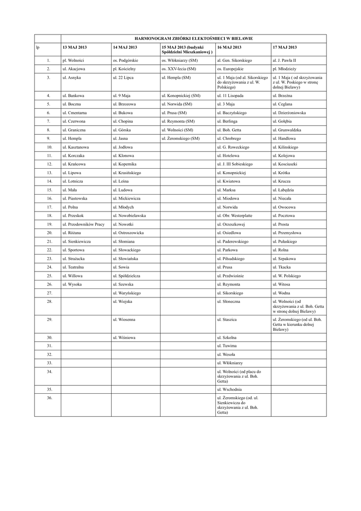 HARMONOGRAM ZBIÓRKI ELEKTOŚMIECI W BIELAWIE lp 13 MAJ 2013 14 MAJ 2013 15 MAJ 2013 (budynki Spółdzielni Mieszkaniowej ) 16 MAJ 2013 17 MAJ 2013 1. pl. Wolności os. Podgórskie os. Włókniarzy (SM) al. Gen. Sikorskiego al. J. Pawła II 2. ul. Akacjowa pl. Kościelny os. XXV-lecia (SM) os. Europejskie pl. Młodzieży 3. ul. Asnyka ul. 22 Lipca ul. Hempla (SM) ul. 1 Maja (od al. Sikorskiego do skrzyżowania z ul. W. Polskiego) ul. 1 Maja ( od skrzyżowania z ul. W. Poskiego w stronę dolnej Bielawy) 4. ul. Bankowa ul. 9 Maja ul. Konopnickiej (SM) ul. 11 Lisopada ul. Brzeżna 5. ul. Boczna ul. Brzozowa ul. Norwida (SM) ul. 3 Maja ul. Ceglana 6. ul. Cmentarna ul. Bukowa ul. Prusa (SM) ul. Baczyńskiego ul. Dzierżoniowska 7. ul. Czerwona ul. Chopina ul. Reymonta (SM) ul. Berlinga ul. Gołębia 8. ul. Graniczna ul. Górska ul. Wolności (SM) ul. Boh. Getta ul. Grunwaldzka 9. ul. Hempla ul. Jasna ul. Żeromskiego (SM) ul. Chrobrego ul. Handlowa 10. ul. Kasztanowa ul. Jodłowa ul. G. Roweckiego ul. Kilinskiego 11. ul. Korczaka ul. Klonowa ul. Hotelowa ul. Kolejowa 12. ul. Krańcowa ul. Kopernika ul. J. III Sobieskiego ul. Kosciuszki 13. ul. Lipowa ul. Krasińskiego ul. Konopnickiej ul. Krótka 14. ul. Lotnicza ul. Leśna ul. Kwiatowa ul. Krucza 15. ul. Mała ul. Ludowa ul. Marksa ul. Łabędzia 16. ul. Piastowska ul. Mickiewicza ul. Miodowa ul. Niecała 17. ul. Polna ul. Młodych ul. Norwida ul. Owocowa 18. ul. Przeskok ul. Nowobielawska ul. Obr. Westerplatte ul. Pocztowa 19. ul. Przodowników Pracy ul. Nowotki ul. Orzeszkowej ul. Prosta 20. ul. Różana ul. Ostroszowicka ul. Osiedlowa ul. Przemysłowa 21. ul. Sienkiewicza ul. Słomiana ul. Paderewskiego ul. Pułaskiego 22. ul. Sportowa ul. Słowackiego ul. Parkowa ul. Rolna 23. ul. Strażacka ul. Słowiańska ul. Piłsudskiego ul. Szpakowa 24. ul. Teatralna ul. Sowia ul. Prusa ul. Tkacka 25. ul. Willowa ul. Spółdzielcza ul. Przdwiośnie ul. W. Polskiego 26. ul. Wysoka ul. Szewska ul. Reymonta ul. Witosa 27. ul. Waryńskiego ul. Sikorskiego ul. Wodna 28. ul. Wiejska ul. Słoneczna ul. Wolności (od skrzyżowania z ul. Boh. Getta w stronę dolnej Bielawy) 29. ul. Wiosenna ul. Staszica ul. Żeromskiego (od ul. Boh. Getta w kierunku dolnej Bielawy) 30. ul. Wiśniowa ul. Szkolna 31. ul. Tuwima 32. ul. Wesoła 33. ul. Włókniarzy 34. ul. Wolności (od placu do skrzyżowania z ul. Boh. Getta) 35. ul. Wschodnia 36. ul. Żeromskiego (od. ul. Sienkiewicza do skrzyżowania z ul. Boh. Getta)