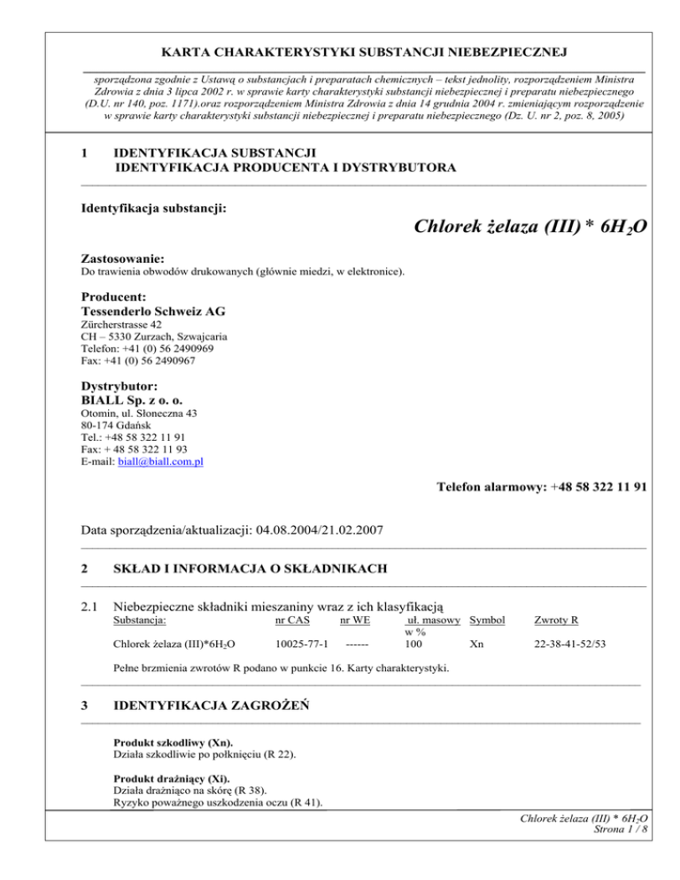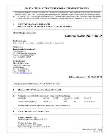 KARTA CHARAKTERYSTYKI SUBSTANCJI NIEBEZPIECZNEJ __________________________________________________________________________________ sporządzona zgodnie z Ustawą o substancjach i preparatach chemicznych – tekst jednolity, rozporządzeniem Ministra Zdrowia z dnia 3 lipca 2002 r. w sprawie karty charakterystyki substancji niebezpiecznej i preparatu niebezpiecznego (D.U. nr 140, poz. 1171).oraz rozporządzeniem Ministra Zdrowia z dnia 14 grudnia 2004 r. zmieniającym rozporządzenie w sprawie karty charakterystyki substancji niebezpiecznej i preparatu niebezpiecznego (Dz. U. nr 2, poz. 8, 2005) 1 IDENTYFIKACJA SUBSTANCJI IDENTYFIKACJA PRODUCENTA I DYSTRYBUTORA ___________________________________________________________________________________________________ Identyfikacja substancji: Chlorek żelaza (III) * 6H2O Zastosowanie: Do trawienia obwodów drukowanych (głównie miedzi, w elektronice). Producent: Tessenderlo Schweiz AG Zürcherstrasse 42 CH – 5330 Zurzach, Szwajcaria Telefon: +41 (0) 56 2490969 Fax: +41 (0) 56 2490967 Dystrybutor: BIALL Sp. z o. o. Otomin, ul. Słoneczna 43 80-174 Gdańsk Tel.: +48 58 322 11 91 Fax: + 48 58 322 11 93 E-mail: [email protected] Telefon alarmowy: +48 58 322 11 91 Data sporządzenia/aktualizacji: 04.08.2004/21.02.2007 ___________________________________________________________________________________________________ 2 SKŁAD I INFORMACJA O SKŁADNIKACH ___________________________________________________________________________________________________ 2.1 Niebezpieczne składniki mieszaniny wraz z ich klasyfikacją Substancja: nr CAS Chlorek żelaza (III)*6H2O 10025-77-1 nr WE ------ uł. masowy Symbol w% 100 Xn Zwroty R 22-38-41-52/53 Pełne brzmienia zwrotów R podano w punkcie 16. Karty charakterystyki. __________________________________________________________________________________________________ 3 IDENTYFIKACJA ZAGROŻEŃ __________________________________________________________________________________________________ Produkt szkodliwy (Xn). Działa szkodliwie po połknięciu (R 22). Produkt drażniący (Xi). Działa drażniąco na skórę (R 38). Ryzyko poważnego uszkodzenia oczu (R 41). Chlorek żelaza (III) * 6H2O Strona 1 / 8 KARTA CHARAKTERYSTYKI SUBSTANCJI NIEBEZPIECZNEJ __________________________________________________________________________________ sporządzona zgodnie z Ustawą o substancjach i preparatach chemicznych – tekst jednolity, rozporządzeniem Ministra Zdrowia z dnia 3 lipca 2002 r. w sprawie karty charakterystyki substancji niebezpiecznej i preparatu niebezpiecznego (D.U. nr 140, poz. 1171).oraz rozporządzeniem Ministra Zdrowia z dnia 14 grudnia 2004 r. zmieniającym rozporządzenie w sprawie karty charakterystyki substancji niebezpiecznej i preparatu niebezpiecznego (Dz. U. nr 2, poz. 8, 2005) Działa szkodliwie na organizmy wodne; może powodować długo utrzymujące się niekorzystne zmiany w środowisku wodnym (R 52/53). Objawy i skutki: Oczy: Przy kontakcie z oczami może wystąpić zaczerwienienie, ból spojówek, łzawienie. Kontakt z produktem (ze względu na silnie zasadowy odczyn) może powodować uszkodzenie rogówki. Skóra: Może powodować podrażnienie, zaczerwienienie, wysuszenie, swędzenie. Wdychanie: Może powodować podrażnienie śluzówki nosa i jamy ustnej, kaszel. Połknięcie: Przy spożyciu stężonych roztworów wodnych może dojść do uszkodzenia śluzówki przewodu pokarmowego, wymiotów i biegunki. _________________________________________________________________________________________________ 4 PIERWSZA POMOC __________________________________________________________________________________ 4.1 Instrukcje postępowania w zależności od drogi narażenia Wdychanie: Kontakt z oczami: Kontakt ze skórą: Połknięcie: Ogólne zalecenia: Wskazówki dla lekarza: Wynieść poszkodowanego z miejsca narażenia, ułożyć w wygodnej pozycji półleżącej lub siedzącej, zapewnić spokój, chronić przed utratą ciepła. Jeżeli wystąpią zaburzenia oddychania, zastosować sztuczne oddychanie. Jeżeli objawy nie ustępują, wezwać lekarza. Natychmiast płukać dużą ilością letniej wody, najlepiej bieżącej, przez co najmniej 15 min. Usunąć szkła kontaktowe. Unikać silnego strumienia wody ze względu na ryzyko mechanicznego uszkodzenia rogówki. Jeżeli podrażnienie nie ustępuje, należy skonsultować się z lekarzem-okulistą. Natychmiast spłukać dużą ilością wody, zdjąć zanieczyszczoną odzież, skórę zmyć dużą ilością wody z mydłem. Jeżeli wystąpią jakiekolwiek podrażnienia skontaktować się z lekarzem. Jeżeli nastąpi połknięcie, nie powodować wymiotów. Jeżeli poszkodowany jest przytomny, podać do wypicia dużą ilość wody. Zapewnić natychmiast pomoc lekarza. Powinny być przestrzegane zwykłe środki ostrożności jak przy pracy z chemikaliami. Jeżeli wystąpią jakiekolwiek niepokojące objawy, wezwać lekarza. Stosować leczenie objawowe __________________________________________________________________________________ 5 POSTĘPOWANIE W PRZYPADKU POŻARU __________________________________________________________________________________________________ 5.1 Zalecane środki gaśnicze Produkt nie palny. Należy stosować środki gaśnicze odpowiednie dla mediów palących się w otoczeniu. Pojemniki nie objęte pożarem, narażone na działanie ognia, chłodzić rozproszonym strumieniem wody. 5.2 Zabronione środki gaśnicze Wszystkie środki gaśnicze są dozwolone. 5.3 Niebezpieczne produkty rozkładu Nie są znane. 5.4 Specjalistyczny sprzęt przeciwpożarowy Nakładać gazoszczelną odzież ochronną i aparaty oddechowe niezależne od powietrza z otoczenia. Nie dopuścić do przedostania się środków gaszących do wód gruntowych i powierzchniowych. Środki gaśnicze zbierać osobno, nie wylewać do kanalizacji. Chlorek żelaza (III) * 6H2O Strona 2 / 8 KARTA CHARAKTERYSTYKI SUBSTANCJI NIEBEZPIECZNEJ _______________________________________