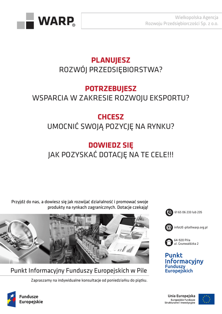 Wielkopolska Agencja Rozwoju Przedsiębiorczości Sp. z o.o. PLANUJESZ ROZWÓJ PRZEDSIĘBIORSTWA? POTRZEBUJESZ WSPARCIA W ZAKRESIE ROZWOJU EKSPORTU? CHCESZ UMOCNIĆ SWOJĄ POZYCJĘ NA RYNKU? DOWIEDZ SIĘ JAK POZYSKAĆ DOTACJĘ NA TE CELE!!! Przyjdź do nas, a dowiesz się jak rozwijać działalność i promować swoje produkty na rynkach zagranicznych. Dotacje czekają! 61 65 06 233 lub 235 [email protected] 64-920 Piła ul. Grunwaldzka 2 Punkt Informacyjny Funduszy Europejskich w Pile Zapraszamy na indywidualne konsultacje od poniedziałku do piątku.
