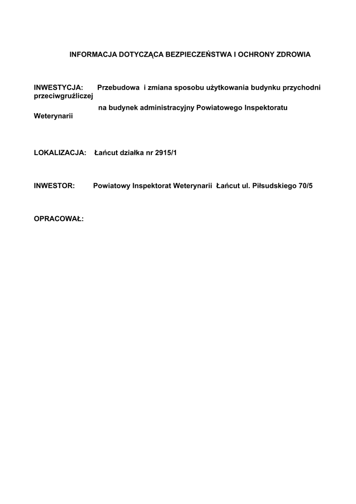 INFORMACJA DOTYCZĄCA BEZPIECZEŃSTWA I OCHRONY ZDROWIA INWESTYCJA: Przebudowa i zmiana sposobu użytkowania budynku przychodni przeciwgruźliczej na budynek administracyjny Powiatowego Inspektoratu Weterynarii LOKALIZACJA: Łańcut działka nr 2915/1 INWESTOR: Powiatowy Inspektorat Weterynarii Łańcut ul. Piłsudskiego 70/5 OPRACOWAŁ: 1. Zakres robót dla całego zamierzenia inwestycyjnego oraz kolejność realizacji poszczególnych obiektów Zakresem robót objęto przebudowę i zmianę przeznaczenia istniejącego budynku przychodni przeciwgruźliczej. Przedmiotowy obiekt – budynek dwukondygnacyjny, podpiwniczony dach drewniany wysoki, system wykonawstwa tradycyjny murowany. 2. Wykaz istniejących obiektów zlokalizowanych na działce. Działki zabudowana przedmiotowym budynkiem 3. Wykaz elementów zagospodarowania działki lub terenu, które mogą stwarzać zagrożenie bezpieczeństwa i zdrowia ludzi. Brak elementów zagospodarowania działki które mogły by zagrażać bezpieczeństwu i zdrowiu ludzi. 4. Wskazanie dotyczące przewidywanych zagrożeń występujących podczas realizacji robót budowlanych określających skalę i rodzaj zagrożenia oraz miejsce i czas ich występowania. Podstawowym zagrożeniem przy przebudowie budynku będzie wykonywanie prac remontowo budowlanych na wysokości powyżej pięciu metrów nad terenem, a mianowicie remont konstrukcji dachowej i pokrycia. 5. Wskazanie sposobu prowadzenia instruktażu pracowników przed przystąpieniem robót szczególnie niebezpiecznych. 1. Instruktaż pracowników, szkolenie. Instruktaż pracowników powinien być słowny oraz pokazowy, zgodnie z rozporządzeniem o ogólnych przepisach BHP Dz U. 129 z 1997r oraz rozporządzeniem w sprawie warunków BHP przy wykonywaniu robót budowlanych, montażowych i rozbiórkowych z 28.03.1972r 2. Sprawdzenie aktualności i zakresu szkoleń BHP pracowników oddelegowanych do pracy na budowie. 3. W stosunku do pozostałych pracowników nie posiadających aktualnych szkoleń - doprowadzić do ich ponownego przeszkolenia. Każdy pracownik przed skierowaniem na stanowisko pracy winien zostać przeszkolony, a fakt ten winien być odnotowany w dokumentacji budowy. 6. Wskazanie środków technicznych i organizacyjnych, zapobiegających niebezpieczeństwom wynikającym z wykonywania robót budowlanych w strefach szczególnego zagrożenia zdrowia lub w ich sąsiedztwie, w tym zabezpieczających bezpieczną i sprawną komunikację, umożliwiającą szybką ewakuację na wypadek pożaru, awarii i innych zagrożeń. 1. Przygotowanie placu budowy - oczyszczenie terenu z ewentualnych przeszkód budowlanych -wyrównanie terenu. - wyposażenie w sprzęt ochronny bhp i ppoż. pracowników wyposażyć w sprzęt ochronny ( nakrycia głowy, okulary ), sprzęt zabezpieczający do pracy na wysokości – wyznaczenie osób bezpośrednio odpowiedzialnych za przebieg prac budowlanych i bezpieczeństwo załogi 2. Przygotowanie warunków socjalno-sanitarnych dla załogi Dla pracowników przygotować pomieszczenia : – szatni, jadalni, ustępów - wielkość pomieszczeń dostosować do ilości zatrudnionych pracowników Przygotować pracownikom możliwość korzystania z płynów do picia Umożliwić pracownikom możliwość umycia się, umycia naczyń po spożyciu posiłku. Zapewnić posiłki regeneracyjne. 2.1. Przygotowanie obiektu do prowadzenia budowy - przygotowanie placów składowych - wykorzystany zostanie istniejący teren działki - przygotowanie placu na składowanie pospółki,piasku i innych materiałów budowlanych - wykonanie punktu poboru energii elektrycznej ( typowa skrzynka wraz z normowymi zabezpieczeniami ) - wykonanie węzła betoniarskiego 2.2. Przygotowanie urządzeń do pracy - sprawdzenie przez osoby uprawnione stanu sprzętu elektrycznego i mechanicznego - sporządzić odpowiedni dokument z badania. 3. Prowadzenie robót budowlanych, zagrożenia wynikające z technologii 3.1. Roboty ziemne Roboty ziemne w zakresie posadowienia poszczególnych części ( segmentów ) będą wykonywane ręcznie przy użyciu drobnego, ręcznego sprzętu. Do usuwania urobku stosowany będzie drobny sprzęt ręczny oraz samochody do wywozu urobku poza plac budowy. Zagrożenia dla bezpieczeństwa dla załogi wynikają z używanego sprzętu oraz ewentualnego osuwania wykopów. Zagrożenia ze strony sprzętu mechanicznego należy usunąć poprzez bezwzględne przestrzeganie warunków bhp w zakresie zachowania bezpiecznej odległości od pracującego sprzętu, od poruszających się samochodów. Roboty wymagają nadzoru kierownictwa budowy. 3.2. Roboty murarskie Ściany murowane wykonywane będą z drobnowymiarowych elementów. W zakresie robót murarskich zagrożenia bhp wynikają z robót związanych z : - przygotowaniem zapraw i betonów - transportu elementów ściennych i zapraw - pracy na wysokości W celu usunięcia zagrożeń dla bezpiecznej pracy należy bezwzględnie przestrzegać norm i przepisów bhp. Roboty wymagają nadzoru kierownictwa budowy. 3.3. Roboty ciesielski i betoniarskie Roboty betoniarskie prowadzone będą w przeważającej części przy zastosowaniu betonowozów i pomp do betonu. Uzupełniające drobne ilości betonu będą wykonywane ręcznie. Nie przewiduje się stosowania lepików na gorąco. W tym zakresie robót wynikają zagrożenia dla bezpiecznej pracy z następujących prac : – przygotowanie zbrojenia ( rozładunek zbrojenia, transport zbrojenia w obrębie placu budowy, prostowanie prętów, przycinanie prętów, wyginanie i montaż ) - przygotwanie deskowań ( rozładunek tarcicy i krawędziaków, składowanie tarcicy, przycinanie, montaż deskowań ) - betonowanie przy użyciu pomp do betonu - przygotowaniem betonów - transportu betonu - pracy na wysokości W celu usunięcia zagrożeń dla bezpiecznej pracy należy bezwzględnie przestrzegać norm i przepisów bhp. Roboty wymagają nadzoru kierownictwa budowy. 3.4. Roboty ciesielsko - dekarskie Przebudowa obejmowa