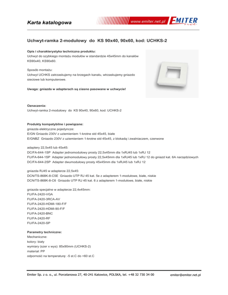 Karta katalogowa ___________________________________________________________________________ Uchwyt-ramka 2-modułowy do KS 90x40, 90x60, kod: UCHKS-2 Opis i charakterystyka techniczna produktu: Uchwyt do szybkiego montażu modułów w standardzie 45x45mm do kanałów KS90x40, KS90x60. Sposób montażu: Uchwyt UCHKS zatrzaskujemy na brzegach kanału, wtrzaskujemy gniazdo sieciowe lub komputerowe. Uwaga: gniazda w adapterach są ciasno pasowane w uchwycie! Oznaczenia: Uchwyt-ramka 2-modułowy do KS 90x40, 90x60, kod: UCHKS-2 Produkty kompatybilne i powiązane: gniazda elektryczne pojedyncze: E/GN Gniazdo 230V z uziemieniem 1-krotne std 45x45, białe E/GNBZ Gniazdo 230V z uziemieniem 1-krotne std 45x45, z blokadą i zwalniaczem, czerwone adaptery 22,5x45 lub 45x45: DC/FA-644-1SP Adapter jednomodułowy prosty 22,5x45mm dla 1xRJ45 lub 1xRJ 12 FU/FA-644-1SP Adapter jednomodułowy prosty 22,5x45mm dla 1xRJ45 lub 1xRJ 12 do gniazd kat. 6A narzędziowych DC/FA-644-2SP Adapter dwumodułowy prosty 45x45mm dla 1xRJ45 lub 1xRJ 12 gniazda RJ45 w adapterze 22,5x45: DCN/TS-868K-8-C5E Gniazdo UTP RJ 45 kat. 5e z adapterem 1-modułowe, białe, niskie DCN/TS-868K-8-C6 Gniazdo UTP RJ 45 kat. 6 z adapterem 1-modułowe, białe, niskie gniazda specjalne w adapterze 22,4x45mm: FU/FA-2420-VGA FU/FA-2420-3RCA-AV FU/FA-2420-HDMI-180-F/F FU/FA-2420-HDMI-90-F/F FU/FA-2420-BNC FU/FA-2420-RF FU/FA-2420-SP Parametry techniczne: Mechaniczne: kolory: biały wymiary (szer x wys): 85x90mm (UCHKS-2) materiał: PP odporność na temperaturę: -5 st.C do +60 st.C Emiter Sp. z o. o., ul. Porcelanowa 27, 40-241 Katowice, POLSKA, tel. +48 32 730 34 00 [email protected] Karta katalogowa ___________________________________________________________________________ Dołożyliśmy wszelkich starań, aby przedstawione informacje były rzetelne i kompletne. Jednak nie ponosimy odpowiedzialności za dokładność i kompletność danych oraz w szczególności nie możemy zagwarantować, że niniejsza specyfikacja nie zawiera błędów lub pomyłek. Informacje zawarte w niniejszej specyfikacji mogą zostać zmienione w każdej chwili bez powiadomienia. ___________________________________________________________________________ Emiter Sp. z o. o., ul. Porcelanowa 27, 40-241 Katowice, POLSKA, tel. +48 32 730 34 00 [email protected]