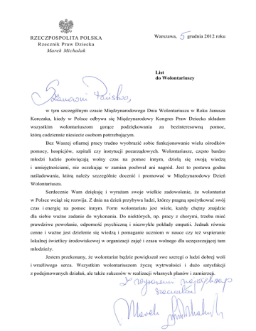 Warszawa, grudnia 2012 roku List do Wolontariuszy w tym szczególnym czasie Międzynarodowego Dnia Wolontariusza w Roku Janusza Korczaka, kiedy w Polsce odbywa się Międzynarodowy Kongres Praw Dziecka składam wszystkim wolontariuszom gorące podziękowania za bezinteresowną pomoc, którą codziennie niesiecie osobom potrzebującym. Bez Waszej ofiarnej pracy trudno wyobrazić sobie funkcjonowanie wielu ośrodków pomocy, hospicjów, szpitali czy instytucji pozarządowych. Wolontariusze, często bardzo młodzi ludzie poświęcają wolny czas na pomoc innym, dzielą się swoją wiedzą i umiejętnościami, nie oczekując w zamian pochwał ani nagród. Jest to postawa godna naśladowania, którą należy szczególnie docenić i promować w Międzynarodowy Dzień Wolontariusza. Serdecznie Wam dziękuję i wyrażam swoje wielkie zadowolenie, że wolontariat w Polsce wciąż się rozwija. Z dnia na dzień przybywa ludzi, którzy pragną spożytkować swój czas i energię na pomoc innym. Form wolontariatu jest wiele, każdy chętny znajdzie dla siebie ważne zadanie do wykonania. Do niektórych, np. pracy z chorymi, trzeba mieć prawdziwe powołanie, odporność psychiczną i niezwykłe pokłady empatii. Jednak równie cenne i ważne jest dzielenie się wiedzą i pomaganie uczniom w nauce czy też wspieranie lokalnej świetlicy środowiskowej w organizacji zajęć i czasu wolnego dla uczęszczającej tam młodzieży. Jestem przekonany, że wolontariat będzie powiększał swe szeregi o ludzi dobrej woli i wrażliwego serca. Wszystkim wolontariuszom życzę wytrwałości i dużo satysfakcji z podejmowanych działań, ale także sukcesów w realizacji własnych planów i zamierzeń.
