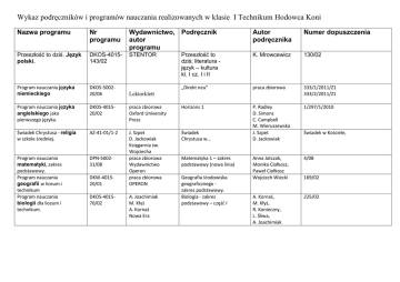 Wykaz podręczników i programów nauczania realizowanych w klasie I Technikum Hodowca Koni Nazwa programu Nr programu Wydawnictwo, Podręcznik autor programu Autor podręcznika Numer dopuszczenia Przeszłość to dziś. Język polski. DKOS-4015143/02 STENTOR Przeszłość to dziś; literatura język – kultura kl. I cz. I i II K. Mrowcewicz 130/02 Program nauczania języka niemieckiego DKOS-500220/06 „Direkt neu” praca zbiorowa 333/1/2011/Z1 333/2/2011/Z1 Program nauczania języka angielskiego jako pierwszego języka. DKOS-401520/02 praca zbiorowa Oxford University Press Horizons 1 1/297/1/2010 Świadek Chrystusa - religia w szkole średniej. AZ-41-01/1-2 Świadek Chrystusa w… Program nauczania matematyki, zakres podstawowy. Program nauczania geografii w liceum i technikum Program nauczania biologii dla liceum i technikum. DPN-500231/08 J. Szpet D. Jackowiak Księgarnia św. Wojciecha praca zbiorowa Wydawnictwo Operon praca zbiorowa OPERON P. Radley D. Simons C. Campbell M. Wieruszewska J. Szpet D. Jackowiak Anna Jatczak, Monika Ciołkosz, Paweł Ciołkosz Wojciech Wiecki 4/08 A. Kornaś, M. Kłyś, R. Konieczny, L. Śliwa, A. Joachimiak 225/02 DKW-401520/01 DKOS-401570/02 Lektorklett A. Joachimiak M. Kłyś A. Kornaś Nowa Era Matematyka 1 – zakres podstawowy (nowa linia) Geografia środowiska geograficznego zakres podstawowy. Biologia - zakres podstawowy – częśd I Świadek w Kościele, 169/02 Fizyka i astronomia dla każdego. Program nauczania w zakresie podstawowym. DKOS-401589/02 praca zbiorowa ZAMKOR Fizyka dla szkoł ponadgimnazjalnych. M. Fiałkowska K. Fiałkowski Sagnowska 46/02 Program nauczania technologii informacyjnej. DKOS-401518/02 praca zbiorowa WSiP Technologia informacyjna 99/07 Poznad przeszłośd, zrozumied dziś. Program nauczania historii w liceum i technikum. Program nauczania przysposobienia obronnego dla szkół ponadgimnazjalnych. Program nauczania chemii dla liceum i technikum, zakres podstawowy. Program nauczania podstaw przedsiębiorczości w szkołach ponadgimnazjalnych. DKOS-500250/05 Grzegorz Szczepaoski, STENTOR Poznad przeszłośd, zrozumied dziś. M. Sysło, E.Gurbiel G. Hardt-Olejniczak E. Kołczyk H. Krupicka Paweł Żmudzki DKOS-40151/02 WSiP Przysposobienie obronne B. Breitkopf M. Marciniak Z. Worwa 107/02 DKW-401543/01 praca zbiorowa Operon Chemia 1 S. Hejwowska R. Marcinkowski 263/03 DKOS-50029/03 praca zbiorowa OPERON Podstawy przedsiębiorczości. J. Korba Z. Smutek 93/10/S 25/2005 Wykaz podręczników i programów nauczania realizowanych w klasie II Technikum Hodowca Koni Nazwa programu Nr programu Wydawnictwo, Podręcznik autor programu Autor podręcznika Numer dopuszczenia Przeszłość to dziś. Język polski. DKOS-4015143/02 STENTOR Przeszłość to dziś; literatura język – kultura kl. I cz. II K. Mrowcewicz 130/02 Przeszłość to dziś; literatura- język – kultura kl. II cz. I A. Nawarecki D. Siwecka 199/03 D. Kin A. Krasicki PWN praca zbiorowa Oxford University Press Hier und da 130/06 J. Szpet D. Jackowiak Księgarnia św. Wojciecha praca zbiorowa Wydawnictwo Operon praca zbiorowa OPERON Świadek Chrystusa w.. S. Rapacka M. Lewandowska J. Nawrotkiewicz P. Radley D. Simons C. Campbell M. Wieruszewska J. Szpet D. Jackowiak Matematyka 2-zakres podstawowy- nowa linia A. Jantczak 228/03 Geografia i człowiek zakres podstawowy Wojciech Wiecki, Jan Mordawski 22/03 A. Joachimiak M. Kłyś A. Kornaś Nowa Era Biologia - zakres podstawowy - Częśd II A. Kornaś, M. Kłyś, R. Konieczny, L.. Śliwa, 25/03 Program nauczania języka niemieckiego dla liceum i technikum, kurs podstawowy. DKOS-500251/03 DKOS-401520/02 Świadek Chrystusa – religia w szkole średniej. AZ-41-01/1-2 Program nauczania matematyki, zakres podstawowy. Program nauczania geografii w liceum i technikum, zakres podstawowy Program nauczania biologii dla liceum i technikum. DPN-500231/08 DKW-401520/01 DKOS-401570/02 Horizons 2 2/297/2/2010 Świadek… w świecie, M. Ciołkosz P.Ciołkosz A. Joachimiak M. Fiałkowska K. Fiałkowski Sagnowska Fizyka i astronomia dla każdego. Program nauczania w zakresie podstawowym. DKOS-401589/02 praca zbiorowa ZAMKOR Fizyka dla szkoł ponadgimnazjalnych. Poznad przeszłośd, zrozumied dziś. Program nauczania historii w liceum i technikum. Program nauczania przysposobienia obronnego dla szkół ponadgimnazjalnych. Program nauczania chemii dla liceum i technikum zakres podstawowy. DKOS-500250/05 Grzegorz Szczepaoski, STENTOR Poznad przeszłośd, zrozumied dziś. Michał Kopczyoski 118/06 DKOS-40151/02 WSiP Przysposobienie obronne. B. Breitkopf M. Marciniak Z. Worwa 107/02 DKW-401543/01 praca zbiorowa Operon Chemia 3 S. Hejwowska R. Marcinkowski J. Staluszka 313/03 46/02 Wykaz podręczników i programów nauczania realizowanych w klasie III Technikum Hodowca Koni Nazwa programu Nr programu Wydawnictwo, Podręcznik autor programu Przeszłość to dziś. Język polski. DKOS-4015143/02 STENTOR Program nauczania języka niemieckiego dla liceum i technikum, kurs podstawowy. Program nauczania języka angielskiego jako pierwszego języka. DKOS-500251/03 D. Kin A. Krasicki PWN praca zbiorowa Oxford University Press Hier und da Świadek Chrystusa - religia w szkole średniej. AZ-41-01/1-2 Świadek Chrystusa w.. Program nauczania matematyki, zakres podstawowy. Program nauczania geografii w liceum i technikum, zakres podstawowy Program nauczania biologii dla liceum i technikum. DPN-500231/08 J. Szpet D. Jackowiak Księgarnia św. Wojciecha praca zbiorowa Wydawnictwo Operon praca zbiorowa OPERON A. Joachimiak M. Kłyś A. Kornaś Nowa Era DKOS-401520/02 DKW-401520/01 DKOS-401570/02 Autor podręcznika Numer dopuszczenia E. Paczoska 50/04 S. Rapacka M. Lewandowska J. Nawrotkiewicz P. Radley D. Simons C. Campbell M. Wieruszewska J. Szpet D. Jackowiak 102/07 Matematyka 2-zakres podstawowy- nowa linia A. Jantczak 228/03 Geografia Polski - zakres podstawowy. Wojciech Wiecki, Jan Mordawski 326/03 Biologia - zakres podstawowy – częśd I A.Joac