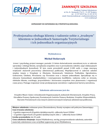 ZAMKNIĘTE SZKOLENIA Erudium Centrum Szkoleniowe ul. Ks. K. Siemaszki 27a/15 , 31-207 Kraków tel. 12 357 80 07 fax 12 423 45 92 email: [email protected], [email protected] www.erudium.pl ZAPRASZAMY DO ZAPOZNANIA SIĘ Z PROPOZYCJĄ SZKOLENIA: Profesjonalna obsługa klienta i radzenie sobie z „trudnym” klientem w Jednostkach Samorządu Terytorialnego i ich jednostkach organizacyjnych Wykładowca: Michał Stolarczyk trener i psycholog, project manager, posiada 11-letnie doświadczenie zawodowej m.in. w zakresie sprzedaży i obsługi klienta, zarządzania zespołem oraz w prowadzeniu szkoleń, zajęć edukacyjnych i indywidualnych konsultacji. W tym czasie przeszkolił ponad 2.100 osób, z czego znaczącą większość stanowili pracownicy administracji publicznej. Współpracował w zakresie szkoleń między innym z Urzędami w Olsztynie, Kozienicach, Sokołowie Podlaskim, Ogrodzieńcu, Goleszowie, Chełmie, Wrocławiu czy Poroninie oraz z innymi jednostkami. Specjalizuje się w obszarze komunikacji międzyludzkiej i rozwiązywania konfliktów, radzeniu sobie ze stresem, obsłudze klienta, coachingu, przywództwie i kierowaniu zespołem oraz planowaniu i organizacji czasu pracy. Pomaga rozpoznać swoje predyspozycje zawodowe i zaplanować karierę zawodową. Szkolenie adresowane jest do: Urzędów Miast i Gmin i ich Jednostek Organizacyjnych, Jednostek Oświatowych, Urzędów Pracy, Ośrodków Pomocy Społecznej, Powiatowych Centrów Pomocy Rodzinie, Urzędów Wojewódzkich, Starostw Powiatowych oraz innych zainteresowanych instytucji administracji publicznej. Miejsce szkolenia: wskazane przez Zleceniodawcę. Koszty wynajmu sali pokrywa Zamawiający Czas trwania szkolenia: - 6 godzin zegarowych (8 godzin dydaktycznych)- całkowity koszt 2200zł - 12 godzin zegarowych (16 godzin dydaktycznych 2dni ) – całkowity koszt 3200zł Liczba uczestników: do 25 osób Cena szkolenia obejmuje: dojazd Wykładowcy, nocleg, przeprowadzenie szkolenia, autorskie materiały szkoleniowe oraz certyfikat sygnowany przez Wykładowcę ZAMKNIĘTE SZKOLENIA Erudium Centrum Szkoleniowe ul. Ks. K. Siemaszki 27a/15 , 31-207 Kraków tel. 12 357 80 07 fax 12 423 45 92 email: [email protected], [email protected] www.erudium.pl PROGRAM (możemy modyfikować zgodnie z zapotrzebowaniem) 1. Cele funkcjonowania urzędu a jakość obsługi klienta. 2. Rodzaje klientów urzędu – klient zewnętrzny oraz wewnętrzny. 3. Korzyści / konsekwencje dobrej / złej obsługi klienta z perspektywy urzędu, urzędnika oraz samego klienta. 4. Klient, petent czy interesant – jak nazywać osobę przychodzącą do urzędu? 5. Nastawienie na obsługę klienta vs nastawienie na załatwienie sprawy. 6. Kompetencje pracownika urzędu niezbędne dla profesjonalnej obsługi klienta. 7. Schemat obsługi klienta: otwarcie, badanie potrzeb, prezentowanie rozwiązania, pokonywanie zastrzeżeń, zamknięcie. 8. Trudny klient czy trudna sytuacja: teoria atrybucji. 9. Przyczyny trudnych sytuacji w obsłudze klienta urzędu. 10. Typologia klientów w oparciu o metaprogramy (element Neurolingwistycznego Programowania), czyli jak skutecznie dopasować się do klienta i uniknąć konfliktu. 11. Trudni klienci: radzenie sobie z klientem agresywnym oraz krytycznym, radzenie sobie z manipulacją. 12. Asertywność w pracy urzędnika – jak bronić swoich granic, szanując przy tym klienta. 13. Jak przestać się przejmować i brać do siebie zachowania klientów? – czyli wstęp do pracy nad swoim sposobem myślenia i przeżywania, który zwiększy naszą odporność. 14. Jak mediować między zwaśnionymi stronami - kilka praktycznych porad i wskazówek Cele Szkolenia: Celem szkolenia jest powtórzenie, utrwalenie i pogłębienie wiedzy uczestników na temat profesjonalnej obsługi klientów urzędu. Szkolenie prowadzone jest w ciekawej formie będącej połączeniem interaktywnego wykładu, dyskusji z uczestnikami oraz zajęć warsztatowych podczas, których uczestnicy będą wykonywali różne ćwiczenia. Dzięki temu możliwe będzie zarówno poszerzenie wiedzy uczestników jak i zmiana ich postaw w kierunku bardziej „proklienckiej”. Udział w szkoleniu pozwoli uczestnikom zbudować odpowiednią motywację do podnoszenia swoich umiejętności z zakresie obsługi klienta oraz zobaczyć ten proces w szerszym kontekście jakim jest funkcjonowanie całej społeczności lokalnej. Dodatkowo uczestnicy zrozumieją na czym polega właściwa postawa i nastawienie w obsłudze klienta oraz poznają uniwersalny schemat prowadzenia rozmowy z klientem. Reszta szkolenia zostanie przeznaczona na zagadnienia, które zwykle budzą najwięcej emocji, a więc praca z tzw. „trudnym” klientem. Uczestnicy poznają konkretne typy sytuacji trudnych oraz jasny i możliwy do zastosowania schemat postępowania w takiej sytuacji. W trakcie całego szkolenia będę pojawiały się przykłady dobrych praktyk z różnych instytucji publicznych.