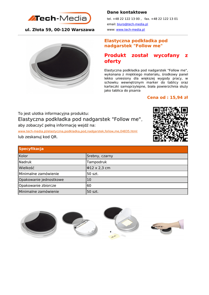 Dane kontaktowe tel. +48 22 122 13 00 , fax. +48 22 122 13 01 email: [email protected] ul. Złota 59, 00-120 Warszawa www: www.tech-media.pl Elastyczna podkładka pod nadgarstek "Follow me" Produkt oferty został wycofany z Elastyczna podkładka pod nadgarstek "Follow me", wykonana z miękkiego materiału, środkowy panel lekko uniesiony dla większej wygody pracy, w schowku wewnętrznym marker do tablicy oraz karteczki samoprzylepne, biała powierzchnia służy jako tablica do pisania Cena od : 15,94 zł To jest ulotka informacyjna produktu: Elastyczna podkładka pod nadgarstek "Follow me" , aby zobaczyć pełną informację wejdź na: www.tech-media.pl/elastyczna,podkladka,pod,nadgarstek,follow,me,04835.html lub zeskanuj kod QR. Specyfikacja Kolor Srebny, czarny Nadruk Tampodruk Wielkość Φ12 x 2,3 cm Minimalne zamówienie 50 szt. Opakowanie jednostkowe 10 Opakowanie zbiorcze 60 Minimalne zamówienie 50 szt.