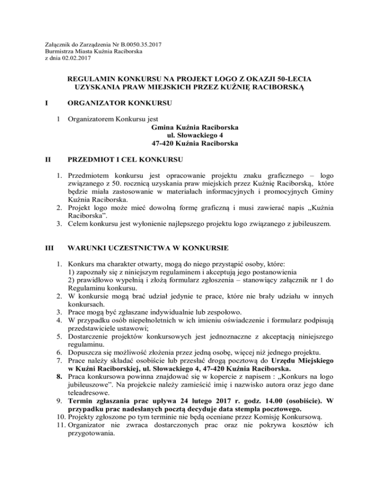 Załącznik do Zarządzenia Nr B.0050.35.2017 Burmistrza Miasta Kuźnia Raciborska z dnia 02.02.2017 REGULAMIN KONKURSU NA PROJEKT LOGO Z OKAZJI 50-LECIA UZYSKANIA PRAW MIEJSKICH PRZEZ KUŹNIĘ RACIBORSKĄ I ORGANIZATOR KONKURSU 1 II Organizatorem Konkursu jest Gmina Kuźnia Raciborska ul. Słowackiego 4 47-420 Kuźnia Raciborska PRZEDMIOT I CEL KONKURSU 1. Przedmiotem konkursu jest opracowanie projektu znaku graficznego – logo związanego z 50. rocznicą uzyskania praw miejskich przez Kuźnię Raciborską, które będzie miała zastosowanie w materiałach informacyjnych i promocyjnych Gminy Kuźnia Raciborska. 2. Projekt logo może mieć dowolną formę graficzną i musi zawierać napis „Kuźnia Raciborska”. 3. Celem konkursu jest wyłonienie najlepszego projektu logo związanego z jubileuszem. III WARUNKI UCZESTNICTWA W KONKURSIE 1. Konkurs ma charakter otwarty, mogą do niego przystąpić osoby, które: 1) zapoznały się z niniejszym regulaminem i akceptują jego postanowienia 2) prawidłowo wypełnią i złożą formularz zgłoszenia – stanowiący załącznik nr 1 do Regulaminu konkursu. 2. W konkursie mogą brać udział jedynie te prace, które nie brały udziału w innych konkursach. 3. Prace mogą być zgłaszane indywidualnie lub zespołowo. 4. W przypadku osób niepełnoletnich w ich imieniu oświadczenie i formularz podpisują przedstawiciele ustawowi; 5. Dostarczenie projektów konkursowych jest jednoznaczne z akceptacją niniejszego regulaminu. 6. Dopuszcza się możliwość złożenia przez jedną osobę, więcej niż jednego projektu. 7. Prace należy składać osobiście lub przesłać drogą pocztową do Urzędu Miejskiego w Kuźni Raciborskiej, ul. Słowackiego 4, 47-420 Kuźnia Raciborska. 8. Praca konkursowa powinna znajdować się w kopercie z napisem : „Konkurs na logo jubileuszowe”. Na projekcie należy zamieścić imię i nazwisko autora oraz jego dane teleadresowe. 9. Termin zgłaszania prac upływa 24 lutego 2017 r. godz. 14.00 (osobiście). W przypadku prac nadesłanych pocztą decyduje data stempla pocztowego. 10. Projekty zgłoszone po tym terminie nie będą oceniane przez Komisję Konkursową. 11. Organizator nie zwraca dostarczonych prac oraz nie pokrywa kosztów ich przygotowania. IV KRYTERIA I WYMAGANIA TECHNICZNE 1. Projekt logo należy wykonać: 1) w formie kolorowego wydruku w formacie A4 na sztywnym podkładzie; 2) w formie czarno – białego wydruku w formacie A4 na sztywnym podkładzie. 2. Projekt logo jubileuszowego powinien nadawać się do różnorodnego wykorzystania zarówno na przedmiotach codziennego użytku, jak też na materiałach promocyjnych i reklamowych oraz nośnikach elektronicznych i grafice internetowej. 3. Projekt znaku promocyjnego powinien zawierać dowolną kombinację „liter“ lub „rysunków“, w jednym lub więcej kolorach. Może być wykonany dowolną techniką, tradycyjną lub komputerową. W pierwszym przypadku wymagana jest konwersja projektu do wersji elektronicznej. 4. Prace konkursowe należy składać w następujących formatach: kolorowy wydruk na sztywnym białym papierze formatu A4, czarno - biały wydruk na sztywnym białym papierze formatu A4, wersja elektroniczna zapisana na płycie CD lub DVD w formatach: wektorowym, do którego należy dołączyć opis techniczny dotyczący wykorzystanych kolorów, a także JPG (300 DPI). Pliki powinny dopuszczać możliwość zmiany skali bez utraty jakości i proporcji obrazu. VI KRYTERIA OCENY PRAC KONKURSOWYCH 1. Organizator Konkursu powoła Komisję Konkursową, która dokona oceny prac konkursowych. 2. Z przebiegu konkursu Komisja Konkursowa sporządza protokół. 3. Komisja będzie oceniać zgłoszone projekty zgodnie z następującymi kryteriami: - walory estetyczne i graficzne projektu, - oryginalność pomysłu, łatwość kojarzenia i zapamiętywania, - oddanie tożsamości i specyfiki miasta Kuźnia Raciborska, - czytelność i funkcjonalność w konwersji na różne media. 4. Komisja Konkursowa zastrzega sobie prawo do nierozstrzygnięcia konkursu. 5. Decyzja Komisji Konkursowej jest ostateczna i nie przysługuje od niej odwołanie. 6. Komisja zastrzega sobie prawo do wezwania zgłaszającego do uzupełnienia zgłoszonego projektu w kwestiach budzących wątpliwości. VII OGŁOSZENIE WYNIKÓW KONKURSU 1. Ogłoszenie wyników konkursu nastąpi w siedzibie Urzędu Miejskiego w Kuźni Raciborskiej w terminie 21 dni od upływu daty składania prac konkursowych. 2. O rozstrzygnięciu konkursu Organizator niezwłocznie zawiadomi wszystkich uczestników biorących udział w konkursie. Autor/autorzy nagrodzonych prac zostaną poinformowani o zwycięstwie telefonicznie i listownie. 3. Wynik konkursu zostanie podany do publicznej wiadomości na stronie internetowej Organizatora www.kuzniaraciborska.pl . VIII NAGRODY 1. W konkursie przewidziana jest jedna nagroda główna w wysokości 500 zł (pięćset złotych) brutto. IX. X. PRAWA AUTORSKIE I DANE OSOBOWE 1. W konkursie mogą brać udział jedynie propozycje logo, które są wynikiem indywidualnej pracy twórczej uczestnika, nie naruszające praw osób trzecich i wolne od wad prawnych. 2. Z chwilą zgłoszenie projektu logo do konkursu uczestnik wyraża zgodę na korzystanie z projektu przez organizatora dla celów konkursowych. 3. Dane osobowe przekazane Organizatorowi przez uczestników konkursu będą przez niego przetwarzane zgodnie z przepisami ustawy z ochronie danych osobowych z dnia 29 sierpnia 1997 roku, tylko i wyłącznie do celów konkursu na co uczestnik wyraża zgodę w momencie przystąpienia do konkursu. 4. Z chwilą ogłoszenia wyników konkursu następuje przeniesienie na Gminę Kuźnia Raciborska praw autorskich przez autora /ów projektu zwycięskiego logo i nieodpłatne wykorzystywanie go na wszystkich polach eksploatacji. Gmina Kuźnia Raciborska będzie uprawniona do korzystania z logo bez konieczności każdorazowego podawania danych zwycięzcy konkursu. Na te warunki uczestnik