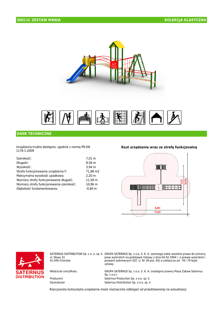 30011C ZESTAW MANIA KOLEKCJA KLASYCZNA DANE TECHNICZNE Urządzenia trudno dostępne, zgodnie z normą PN-EN 1176-1:2009 Szerokość: Długość: Wysokość: Strefa funkcjonowania urządzenia F: Maksymalna wysokość upadkowa: Wymiary strefy funkcjonowania długość: Wymiary strefy funkcjonowania szerokość: Głębokość fundamentowania: Rzut urządzenia wraz ze strefą funkcjonalną 7,01 m 8,58 m 3,94 m 71,88 m2 2,20 m 11,58 m 10,96 m -0,60 m SATERNUS DISTRIBUTION Sp. z o. o. sp. k. GRUPA SATERNUS Sp. z o.o. S. K. A. zastrzega sobie wszelkie prawa do ochrony ul. Nowa 32 praw autorskich na podstawie Ustawy z dnia 04.02.1994 r. o prawie autorskim i 41-500 Chorzów prawach pokrewnych (DZ. U. Nr 28 poz. 83) a zwłaszcza art. 78 i 79 tejże ustawy. Właściciel certyfikatu Producent Dystrybutor GRUPA SATERNUS Sp. z o.o. S. K. A. (następna prawny Place Zabaw Saternus Sp. z o.o.) Saternus Production Sp. z o.o. sp. k. Saternus Distribution Sp. z o.o. sp. k. Rzeczywista kolorystyka urządzenia może nieznacznie odbiegać od przedstawionej na wizualizacji. Widok urządzenia Urządzenie wykonane zgodnie z PN-EN 1176:1-2009 Wyposażenie placów zabaw. Ogólne wymagania bezpieczeństwa i metody badań. Nawierzchnie amoryzujące: piasek, żwir, kora, nawierzchnia synetyczna (grubość minimalna dla wszystkich nawierzchni sypkich 200mm) SATERNUS DISTRIBUTION Sp. z o. o. sp. k. GRUPA SATERNUS Sp. z o.o. S. K. A. zastrzega sobie wszelkie prawa do ochrony ul. Nowa 32 praw autorskich na podstawie Ustawy z dnia 04.02.1994 r. o prawie autorskim i 41-500 Chorzów prawach pokrewnych (DZ. U. Nr 28 poz. 83) a zwłaszcza art. 78 i 79 tejże ustawy. Właściciel certyfikatu Producent Dystrybutor GRUPA SATERNUS Sp. z o.o. S. K. A. (następna prawny Place Zabaw Saternus Sp. z o.o.) Saternus Production Sp. z o.o. sp. k. Saternus Distribution Sp. z o.o. sp. k. Rzeczywista kolorystyka urządzenia może nieznacznie odbiegać od przedstawionej na wizualizacji. SKŁAD URZĄDZENIA Drabinka pionowa: Drabinka ukośna: Mostek łukowy, dł. 228cm: Pomost ruchomy, dł. 228cm: Przeplotnia pionowa z lin, wys. 220cm, szer. 228cm: Trap wejściowy wys. 136cm: Wieża bez dachu, podest wys. 136cm: Wieża bez dachu, podest wys. 60cm: Wieża z dachem, podest wys. 136cm: Zjeżdżalnia wys. 136cm, ślizg nierdzewny o dł. 315cm: MATERIAŁY 1 1 1 1 1 1 1 1 1 1 Elementy połaciowe: Elementy stalowe: Fundamenty: Kotwy: Liny: Nogi konstrukcyjne: Podesty: Ślizg: Zaślepki: Łańcuch: płyty HDPE stal cynkowana cynkoprimem, malowana proszkowo beton klasy min. C12/15 stal ocynkowana kąpielowo polipropylenowe, wielooplotowe o grubości min. 16 mm, z rdzeniem stalowym, niepalne połączone ze sobą poprzez plastikowe łączniki wykonane z drewna klejonego trójwarstwowo, malowanego lakierobejcą na kolor zielony, zaokrąglonego na krawędziach, o przekroju 90 x 90 mm wykonane z drewna impregnowanego, frezowanego w celu zabezpieczenia przed poślizgiem, o grubości min. 30 mm stal nierdzewna tworzywo sztuczne stal ocynkowana kąpielowo SATERNUS DISTRIBUTION Sp. z o. o. sp. k. GRUPA SATERNUS Sp. z o.o. S. K. A. zastrzega sobie wszelkie prawa do ochrony ul. Nowa 32 praw autorskich na podstawie Ustawy z dnia 04.02.1994 r. o prawie autorskim i 41-500 Chorzów prawach pokrewnych (DZ. U. Nr 28 poz. 83) a zwłaszcza art. 78 i 79 tejże ustawy. Właściciel certyfikatu Producent Dystrybutor GRUPA SATERNUS Sp. z o.o. S. K. A. (następna prawny Place Zabaw Saternus Sp. z o.o.) Saternus Production Sp. z o.o. sp. k. Saternus Distribution Sp. z o.o. sp. k. Rzeczywista kolorystyka urządzenia może nieznacznie odbiegać od przedstawionej na wizualizacji.