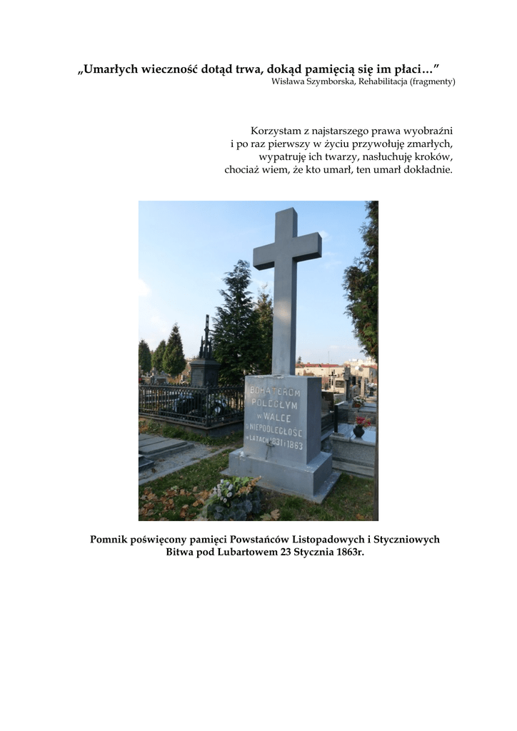 „Umarłych wieczność dotąd trwa, dokąd pamięcią się im płaci…” Wisława Szymborska, Rehabilitacja (fragmenty) Korzystam z najstarszego prawa wyobraźni i po raz pierwszy w życiu przywołuję zmarłych, wypatruję ich twarzy, nasłuchuję kroków, chociaż wiem, że kto umarł, ten umarł dokładnie. Pomnik poświęcony pamięci Powstańców Listopadowych i Styczniowych Bitwa pod Lubartowem 23 Stycznia 1863r. Wierzyłam, że zdradzili, że niewarci imion, skoro chwast się natrząsa z ich nieznanych mogił i kruki przedrzeźniają, i śnieżyce szydzą - a to byli, Joriku, fałszywi świadkowie. Miejsca pochówków Nieznanych Żołnierzy na cmentarzu w Lubartowie. Umarłych wieczność dotąd trwa, dokąd pamięcią się im płaci. Chwiejna waluta. Nie ma dnia, by ktoś wieczności swej nie tracił. „ Legionistom poległym na terenie powiatu lubartowskiego w 1915r.” Kwatera wojenna, w której pochowano żołnierzy z sierpnia 1915r. W obrębie kwatery wzniesiono pomnik w 1935r. W obu kwaterach poza żołnierzami polskimi pochowano ok. 100 żołnierzy austro- węgierskich i rosyjskich, oraz kilku niemieckich poległych w sierpniu 1915 r. Dziś o wieczności więcej wiem: można ją dawać i odbierać. Kogo zwano zdrajcą ten razem z imieniem ma umierać. Pomnik Kpt. Zdzisława Brońskiego, ps. "Uskok", legendarnego, najbardziej znanego i bezkompromisowego dowódcy oddziału partyzanckiego, lubartowskiego Obwodu Armii Krajowej. Ta nasz nad zmarłymi moc wymaga nierozchwianej wagi i żeby sąd nie sądził w noc, i żeby sędzia nie był nagi. „ Cześć i chwała bohaterom poległym w walce z okupantem niemieckim” 1919-1945 Ziemia wre a to oni, którzy są już ziemią, wstają grudka po grudce, garstka obok garstki, wychodzą z przemilczenia, wracają do imion, do pamięci narodu, do wieńców i barw. Gdzież moja władza nad słowami? Słowa opadły na dno łzy, słowa, słowa niezdatne do wskrzeszania ludzi, pis martwy jak zdjęcie w blasku magnezji. Nawet na pół oddechu nie umiem ich zbudzić ja, Syzyf przypisany do piekła poezji… W poszukiwaniu śladów z przeszłości klasa 1 W na Cmentarzu Parafialnym w Lubartowie. Opr. Dorota Bułgajewska-Muzyka