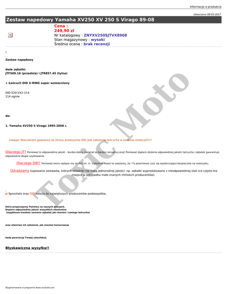 Informacje o produkcie Utworzono 08-03-2017 Zestaw napedowy Yamaha XV250 XV 250 S Virago 89-08 Cena : 249,90 zł Nr katalogowy : ZNYXV250SJTVX8908 Stan magazynowy : wysoki Średnia ocena : brak recenzji ! Zestaw napędowy dwie zębatki: JTF569.16 (przednia) i JTR857.45 (tylna) ot o + Łańcuch DID X-RING super wzmocniony DID-520-VX2-114 114 ogniw M do: 1. Yamaha XV250 S Virago 1995-2008 r. c Uwaga! Warunkiem gwarancji ze strony producenta DID jest założenie łańcucha w serwisie motocykli!!! Dlaczego JT? Ponieważ to odpowiednia jakość - bardzo dobry materiał za bardzo rozsądną cenę! Ponieważ dopiero złożenie odpowiedniej jakości łańcucha i zębatek gwarantuje odpowiednio długie użytkowanie. xi Dlaczego DID? Ponieważ skoro najlepsi mu zaufali (m. in. Valentino Rossi) to uważamy, że i Ty powinieneś czuć się wystarczająco bezpiecznie na motocyklu. Odradzamy kupowanie zestawów, których składniki nie mają jednorodnej jakości: np. zębatki wyprodukowane z nieodpowiedniej stali (co często ma JT To miejsce w przypadku mało znanych chińskich producentów). Sprockets oraz DID należą do największych producentów podzespołów, które proponujemy Państwu na naszych aukcjach. Dopiero odpowiednia jakość wszystkich elementów (wyjątkowa trwałość zarówno zębatek jak również i samego łańcucha) oraz właściwe ich założenie, jak również konserwacja będą gwarancją Twojej satysfakcji. Błyskawiczna wysyłka!! Wygenerowano w programie www.oscGold.com