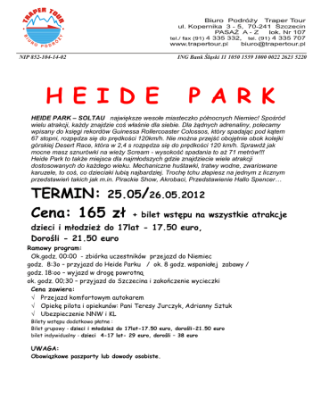 NIP 852-104-14-02 H E I D E ING Bank Śląski 11 1050 1559 1000 0022 2623 5220 P A R K HEIDE PARK – SOLTAU największe wesołe miasteczko północnych Niemiec! Spośród wielu atrakcji, każdy znajdzie coś właśnie dla siebie. Dla żądnych adrenaliny, polecamy wpisany do księgi rekordów Guinessa Rollercoaster Colossos, który spadając pod kątem 67 stopni, rozpędza się do prędkości 120km/h. Nie można przejść obojętnie obok kolejki górskiej Desert Race, która w 2,4 s rozpędza się do prędkości 120 km/h. Sprawdź jak mocne masz sznurówki na wieży Scream - wysokość spadania to aż 71 metrów!!! Heide Park to także miejsca dla najmłodszych gdzie znajdziecie wiele atrakcji dostosowanych do każdego wieku. Mechaniczne huśtawki, tratwy wodne, zwariowane karuzele, to coś, co dzieciaki lubią najbardziej. Trochę tchu złapiesz na jednym z licznym przedstawień takich jak m.in. Pirackie Show, Akrobaci, Przedstawienie Hallo Spencer… TERMIN: 25.05/26.05.2012 Cena: 165 zł + bilet wstępu na wszystkie atrakcje dzieci i młodzież do 17lat - 17.50 euro, Dorośli - 21.50 euro Ramowy program: Ok.godz. 00:00 - zbiórka uczestników przejazd do Niemiec godz. 8:3o – przyjazd do Heide Parku / ok. 8 godz. wspaniałej zabawy / godz. 18:oo – wyjazd w drogę powrotną ok. godz. 00;30 – przyjazd do Szczecina i zakończenie wycieczki Cena zawiera: Przejazd komfortowym autokarem Opiekę pilota i opiekunów: Pani Teresy Jurczyk, Adrianny Sztuk Ubezpieczenie NNW i KL Bilety wstępu dodatkowo płatne : Bilet grupowy - dzieci i młodzież do 17lat-17.50 euro, dorośli-21.50 euro bilet indywidualny - dzieci 4-17 lat- 29 euro, dorośli – 38 euro UWAGA: Obowiązkowe paszporty lub dowody osobiste.